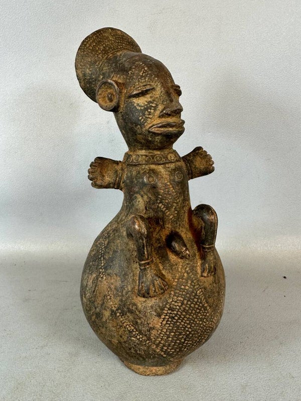 This is a very finely crafted terracotta vessel hand made by a Potter among the Mambila peoples of Southern Nigeria / Northern Cameroon ( The Tikar Plain) Africa. Very Little is written about these highly decorative clay pots. This vessel features a wide open mouth spout of a ancestor head with tall crest, as well as a most charming ancestor crawling down the vessel front. The entire vessel features the raised dots that so many Mambila pots feature. This is related to the " Ga’anda Cult" and the shrines where these vessels were often placed. According to the mambila religious beliefs " Mbirhlen’nda" is the spirit, regarded as best able to protect and sustain health and prosperity. The dense application of small clay pellets on mbirhlen’nda may be sculptural equivalents of the rows of raises “dots” resulting from scarification incisions. However they may more literally refer to the skin diseases the spirit is said to inflict on those who disobey codes of Ga’anda behaviour and morality. The Mambila people in Cameroon create highly detailed, expressive vessels that appear as figurative sculptures that also function as containers made to be filled with substances such as water, food or medicine. In addition, they could also be filled with spiritual elements such as souls, life energy or healing powers, suggesting they have symbolic status. They have also been described as “soul vessels.” In this regard, they may be related to ancestor veneration.