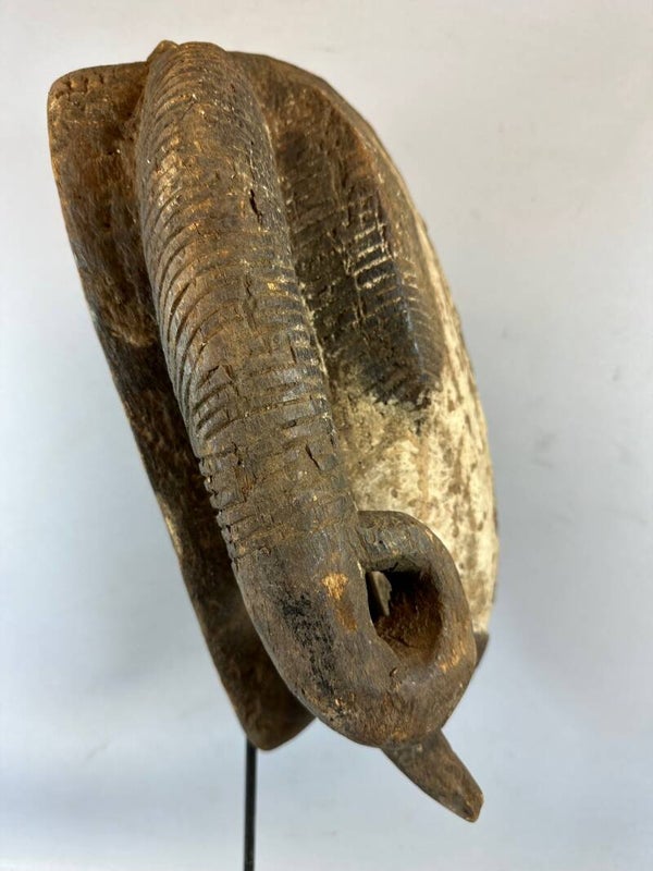 Among the Baule people of Cote d'Ivoire Zoomorphic masks such as this wonderful ram mask represent bush spirits. Certain sources refer to this type of mask as an agricultural spirit. In general, Baule masks such as this appear in villages during various festivals, where they perform various typecast characters living in the village and zoomorphic behavior and qualities that may be compared to that of the humans. The ram mask has many male attributes and symbolizes a male character. His strong and beautiful spiral horns signify strength and power.