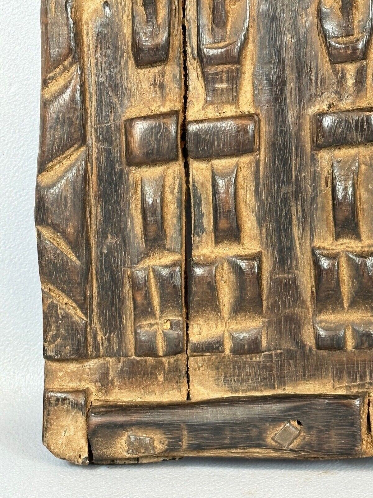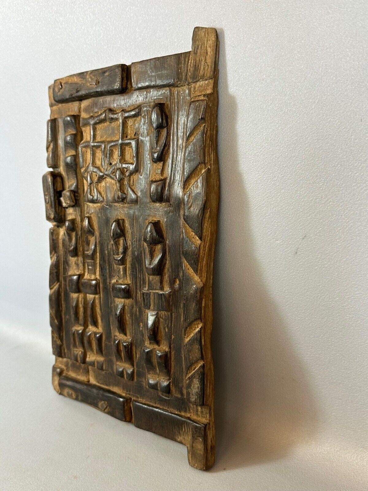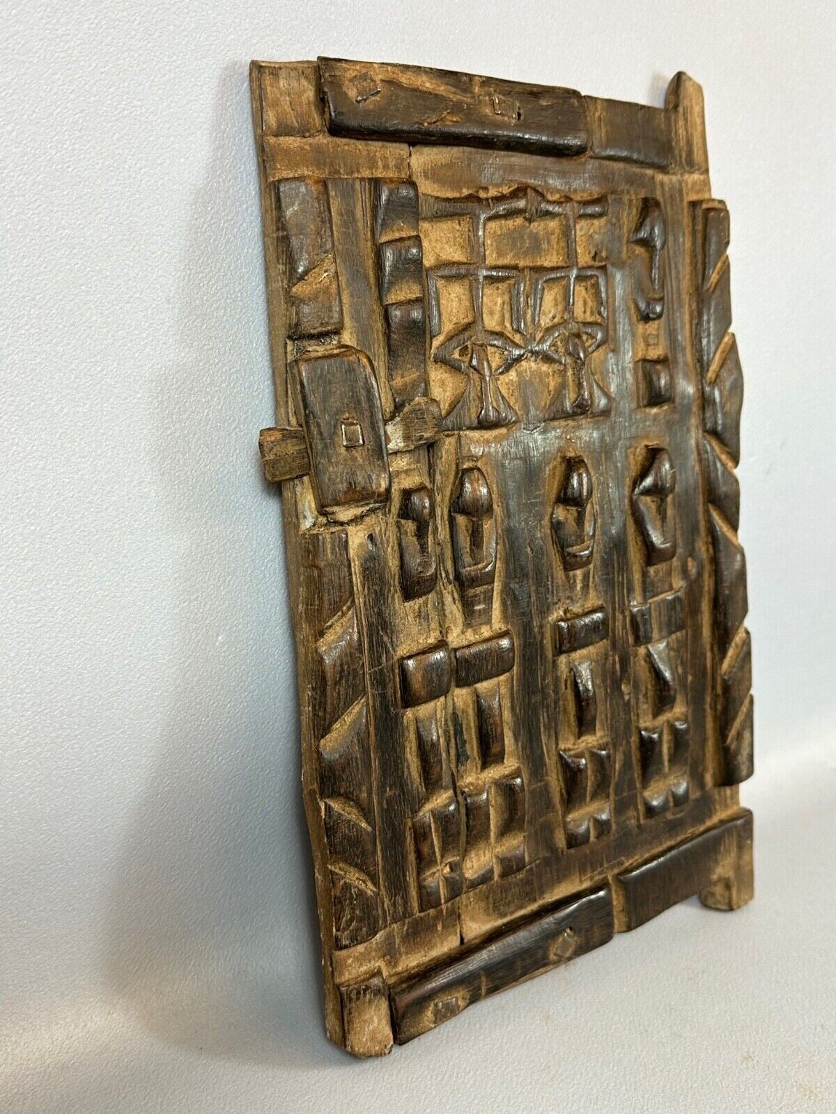 This beautifully carved African Granary door storage measures 30 cm tall and is hand-carved of wood. It originates from the Dogon tribe of of Mali and Burkina Faso. These doors protected the window like opening into each family’s grain storage building so a small amount of food could be taken out. Primordial beings, ancestors, Kanaga masks, sun lizards and scenes of life symbolically served to protect the entrance by making it sacrosanct. The low reliefs are carved on several panels, held together by iron staples.