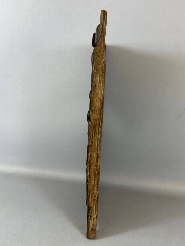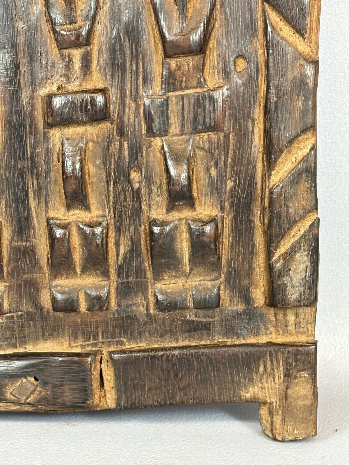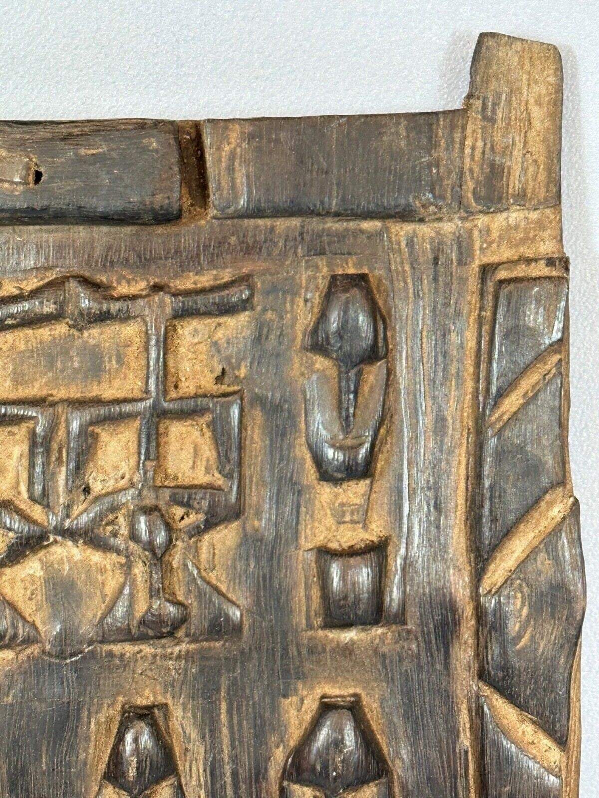 This beautifully carved African Granary door storage measures 30 cm tall and is hand-carved of wood. It originates from the Dogon tribe of of Mali and Burkina Faso. These doors protected the window like opening into each family’s grain storage building so a small amount of food could be taken out. Primordial beings, ancestors, Kanaga masks, sun lizards and scenes of life symbolically served to protect the entrance by making it sacrosanct. The low reliefs are carved on several panels, held together by iron staples.