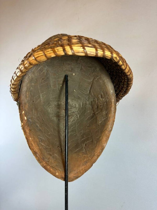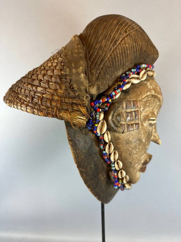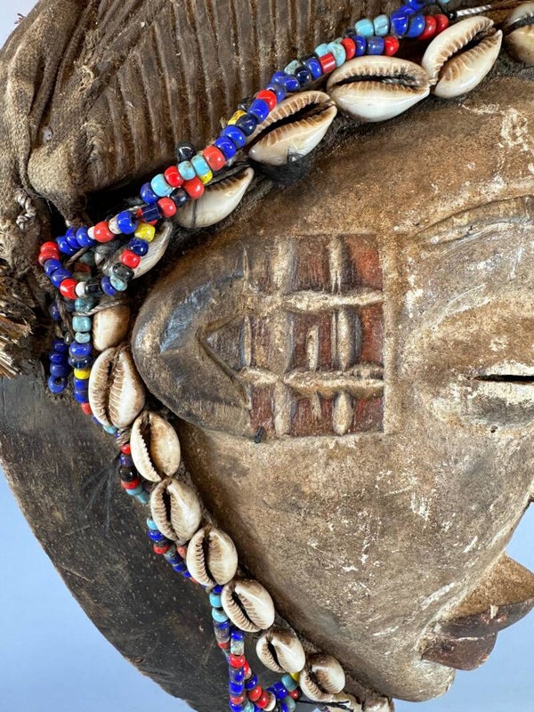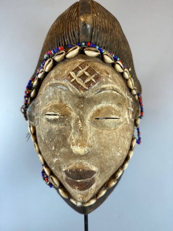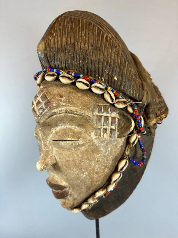 PUNU mask (pronounced pounou) from Okuyi dance. The Punu are a 'Bantu' people from Central Africa, mainly located in the south of Gabon. Social cohesion is ensured by the 'Moukanji' society, whose essential role is to subdue the evil spirits of the forest. The eyes in fine curved palpebral slits. This striped hairstyle, combined with side quilts, represents the braided braids of Punu women. The face is powdered with white kaolin "itengi" (white clay mixed with powder from broken bones of the deceased), due to his age he still has a little left. Color of mourning, which links to the world of spirits and ancestors. This example is missing the "mabinda" chessboard scarifications that symbolize the nine clans at the origin of the Congo Kingdom.