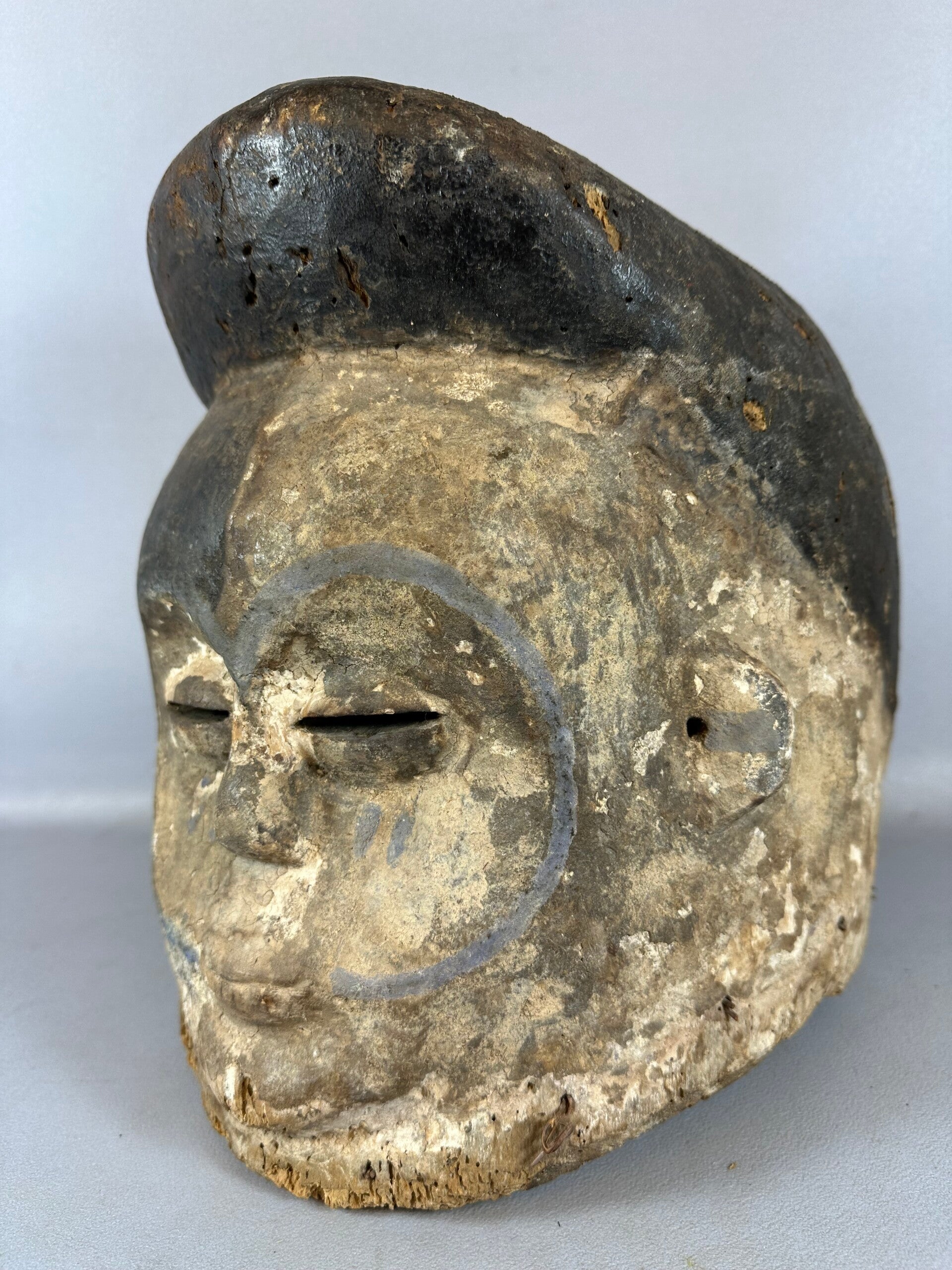 Old wooden helmet mask from the Kwese tribe of Gabon. Helmet masks like these, were worn over the head, or, if too small, on top of the head. The mask appeared during funeral ceremonies. Great use of blue and white pigments.