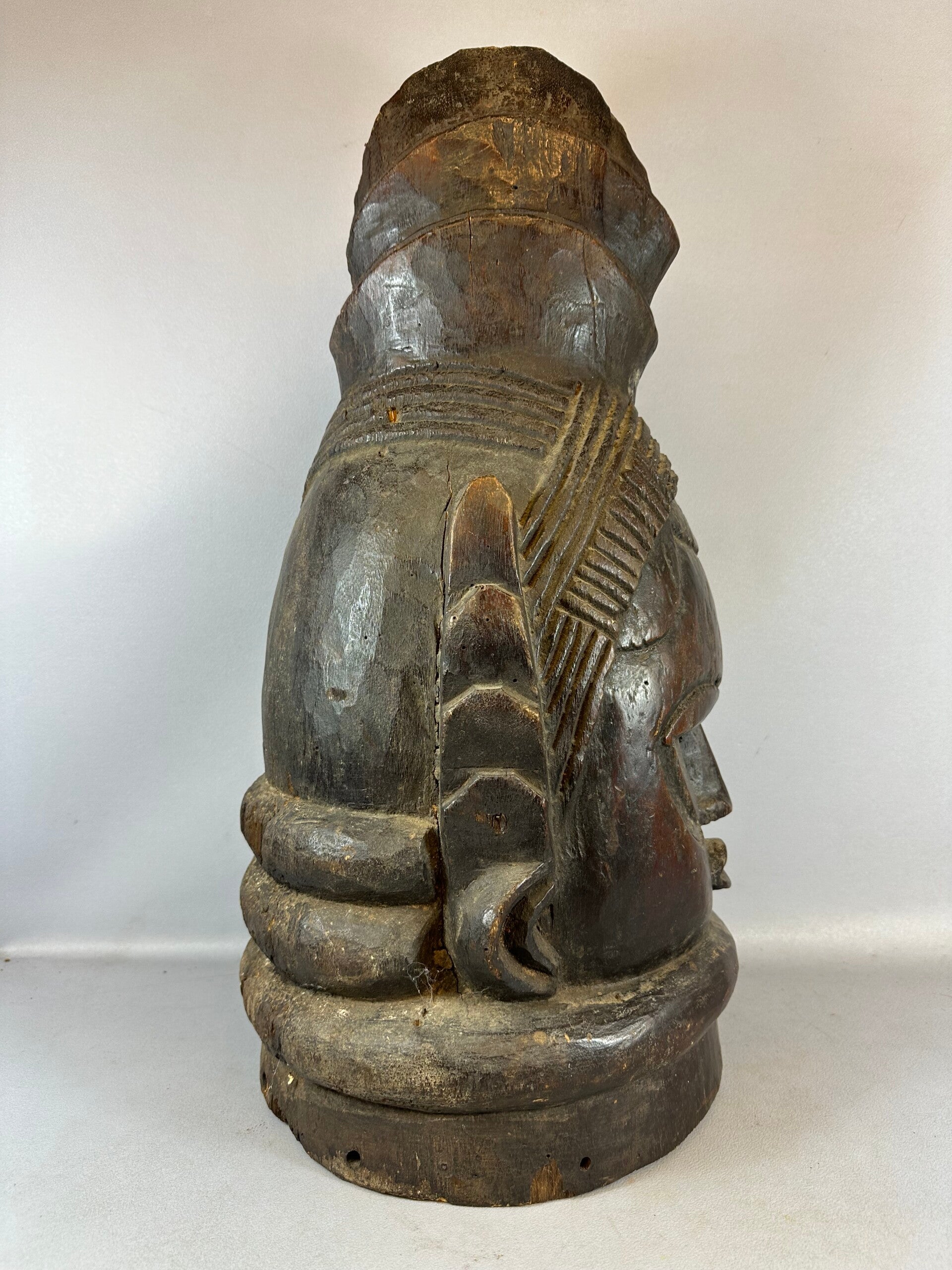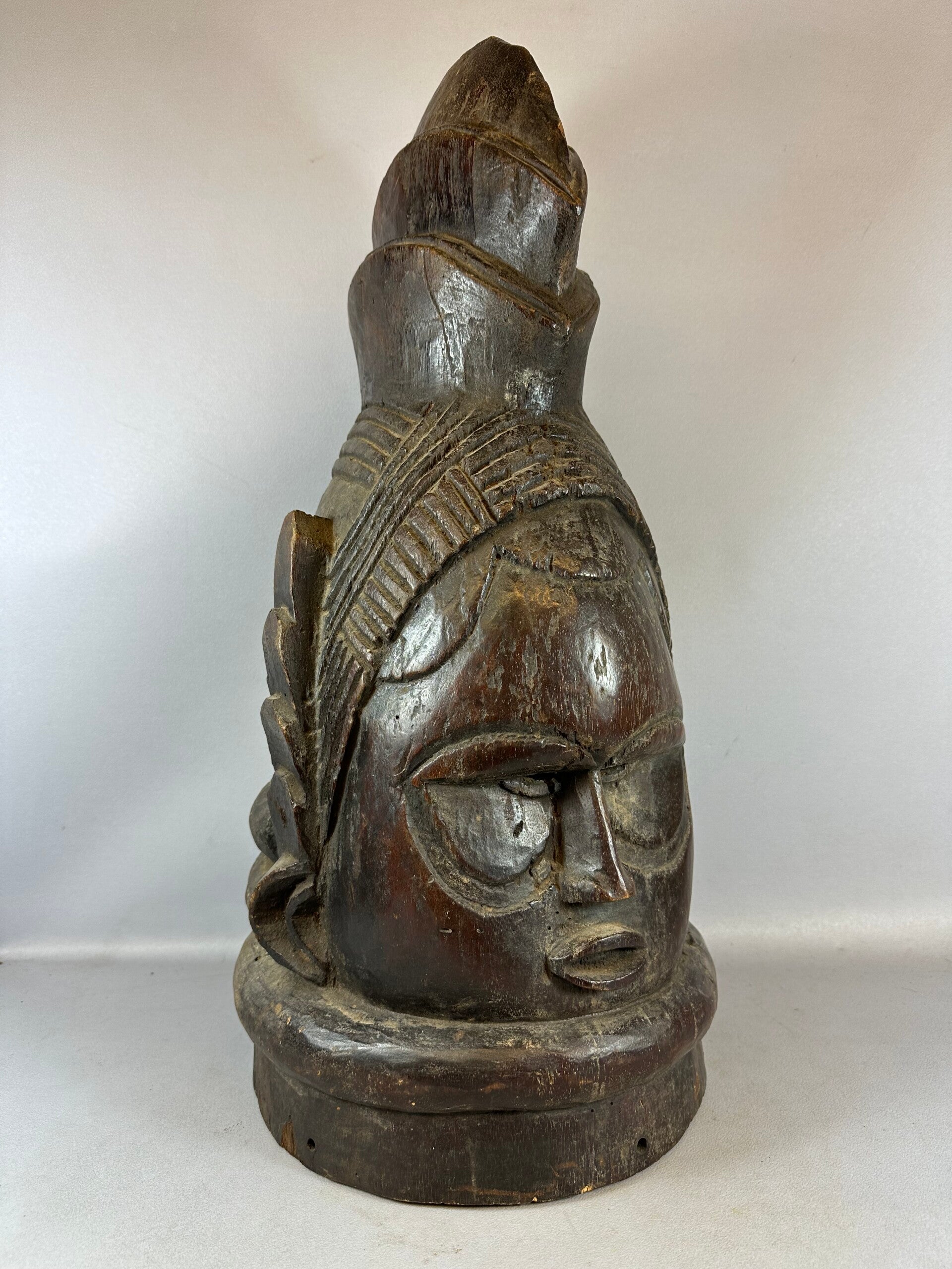 This helmet mask, made by the Mende people of Liberia, was made for the women of their tribe to wear while dancing. Commissioned by women for their initiation ceremonies, the masks were carved by men to represent the ideal female face. Designed to rest on the shoulders, this mask has a traditional ruffled base, representing the emergence of the spirit from the water. The smoothness of the patina and the presence of tight braids mark this as a mid-20th century example of this very ancient art form.