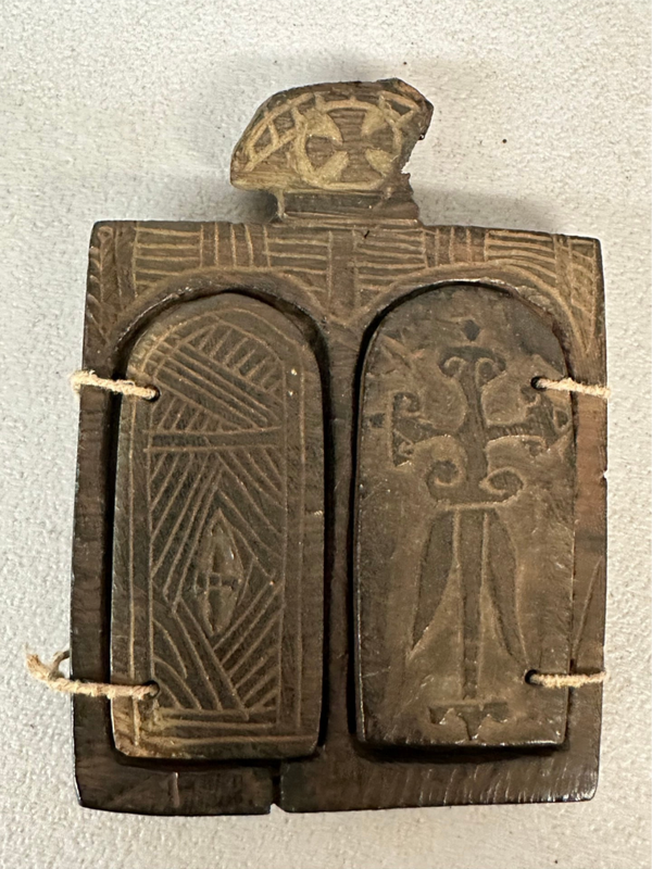 Eastern Africa, Ethiopia, ca. first half of the 20th century CE. A hand-carved stone traveling icon with two wide faces containing a pair of cavities incised with traditional Ethiopian Orthodox Christian iconography. One side bears a cross and an angel over a knotted orb, and opening the panels reveals several additional figures. The reverse side bears similar images of a cross and an angel, and opening the panels reveals yet another cross, a couple of angelic figures, and a depiction. Each of the panels are held in place with modern thread, though this does not detract from the overall quality of this beautiful example.