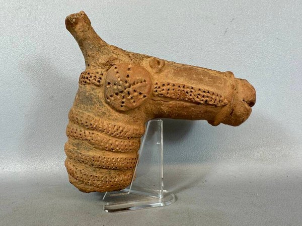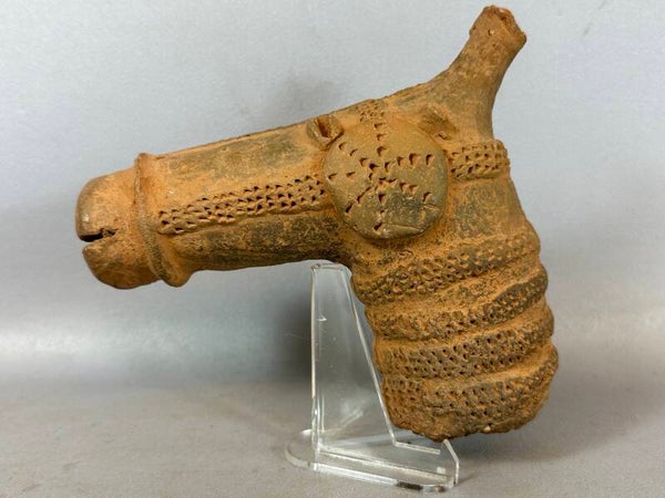 This expressionist rendering of a horse’s head is an extremely rare piece, and was made by one of the most inscrutable groups in pre-colonial Africa: the Djenne. The head is sculpted as a right-angled tubular mass with the lower aspect representing the neck. The corner between the neck and the head proper is marked with a block-shaped ear. The face is long and slim, with a gaping mouth, a rounded muzzle with elongated nostrils and coffee-bean eyes mounted superiorly. The surface is undecorated, but the horse is clearly harnessed, with a stippled double band around the base of the neck and an integral three-strand strap arrangement that encircles the back of the head and proceeds to the muzzle. Pieces such as this represent wealth, as only the most elite members of any society (including the larger Mali Kingdom) could afford to own horses. There are preliminary data to suggest that the urns that these objects adorned were buried with important individuals and that the horse was usually shown with a rider – representing the deceased. This intriguing piece of sculpture is made of terracottan by the Djenne people of Mali. It depicts a horse head.The material used was worked skillfully by the Djenne artisans, and is the results today of a truly distiguinshed works of art in the technique of ceramic art. Djenne was once a prospering city which was also once the trade center of this region and it was located at the the Inland Delta of the Niger River which was the heart of the Mali Empire between the 12th and 16th centuries. The Djenne civilization are precursors to the Dogon of Mali.