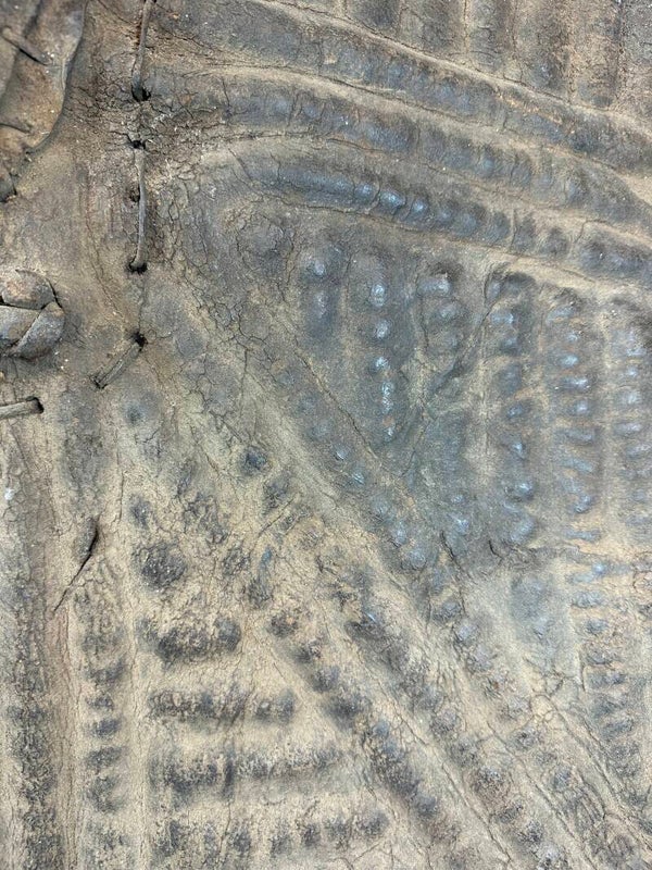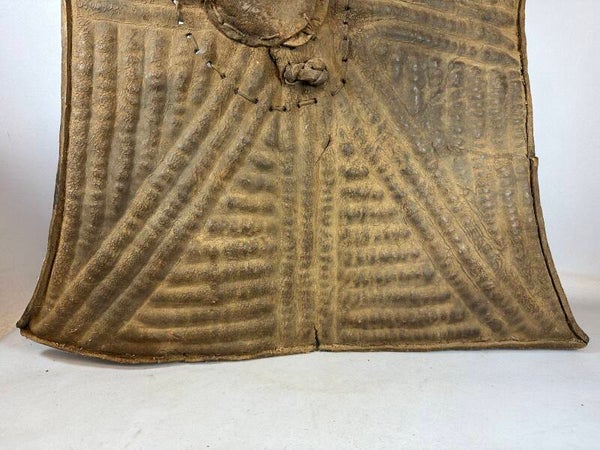 This is a very Old Embossed Leather Shield from the Kirdi People of Cameroon. "The name Kirdi, meaning "infidels", was given to the groups of peoples in Cameroon by the Muslims who drove them into their hilltop refuges from the plains below. They were ancestor worshipers and animists. This old Kirdi Leather shield is a wonder and was Collected in the field. This fabulous old and rare Kirdi Shield would be a wonderful addition to your collection.