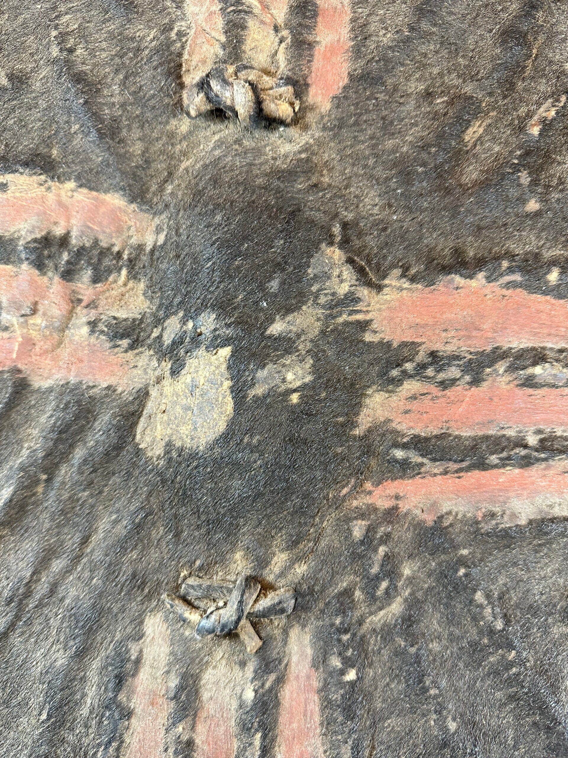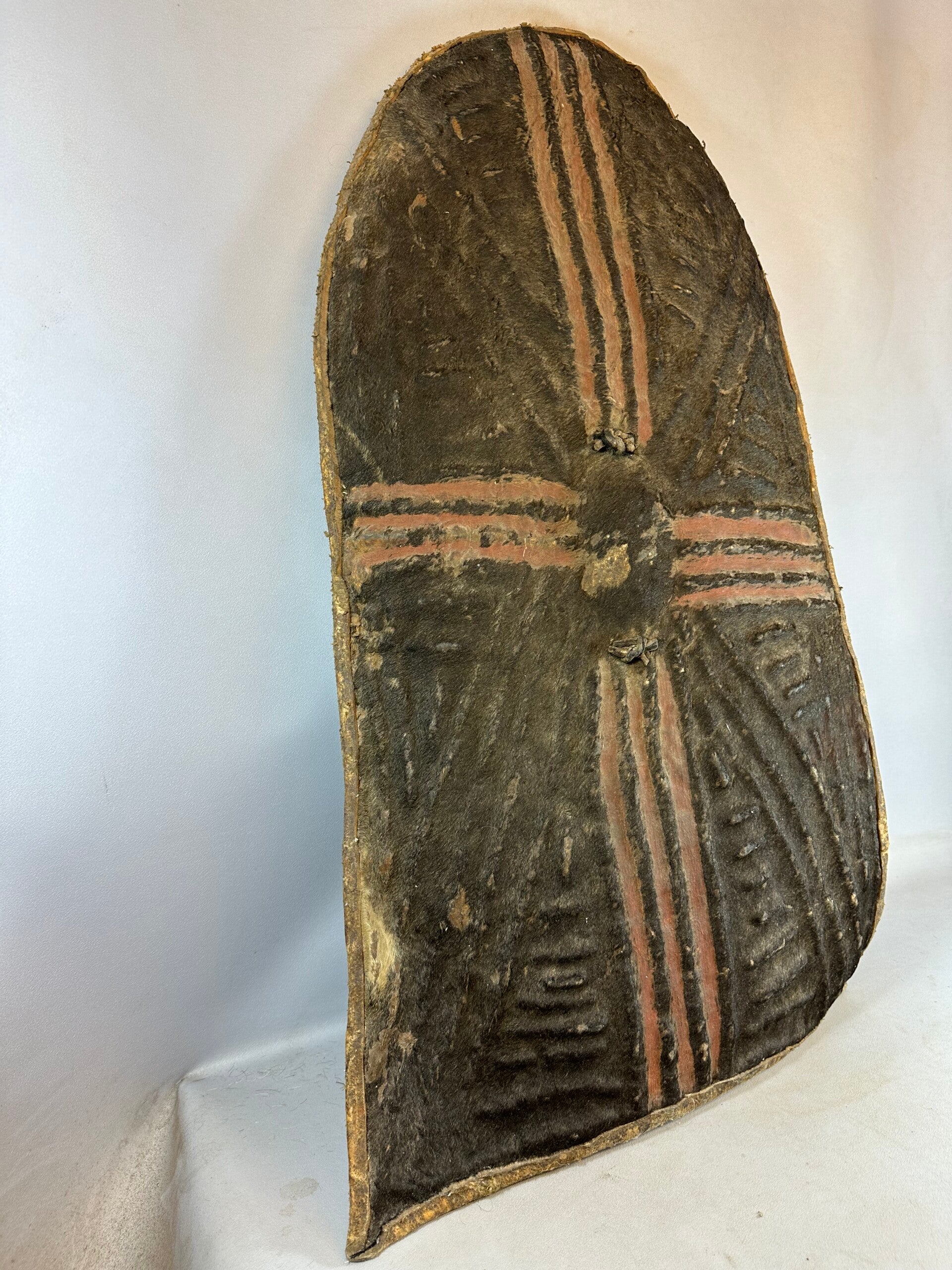 This item is from the end of the 19th century and purchased in my private collection in 2023, with a certificate of authenticity.This Kirdi shield is painted on hide, with raised centre boss, stamped dot decoration and painted red crosses, bush repairs, integral handle to reverse. This is a classic shield shaped from the Kirdi of Cameroon. Has a rectangular raised centre with a double compass design around. There are hundreds of bumps throughout the front, creating a textured sculptural object.This is a very Old Embossed Leather Shield from the Kirdi People of Cameroon. "The name Kirdi, meaning "infidels", was given to the groups of peoples in Cameroon by the Muslims who drove them into their hilltop refuges from the plains below. They were ancestor worshipers and animists. This old Kirdi Leather shield is a wonder and was Collected in the field. This fabulous old and rare Kirdi Shield would be a wonderful addition to your collection.