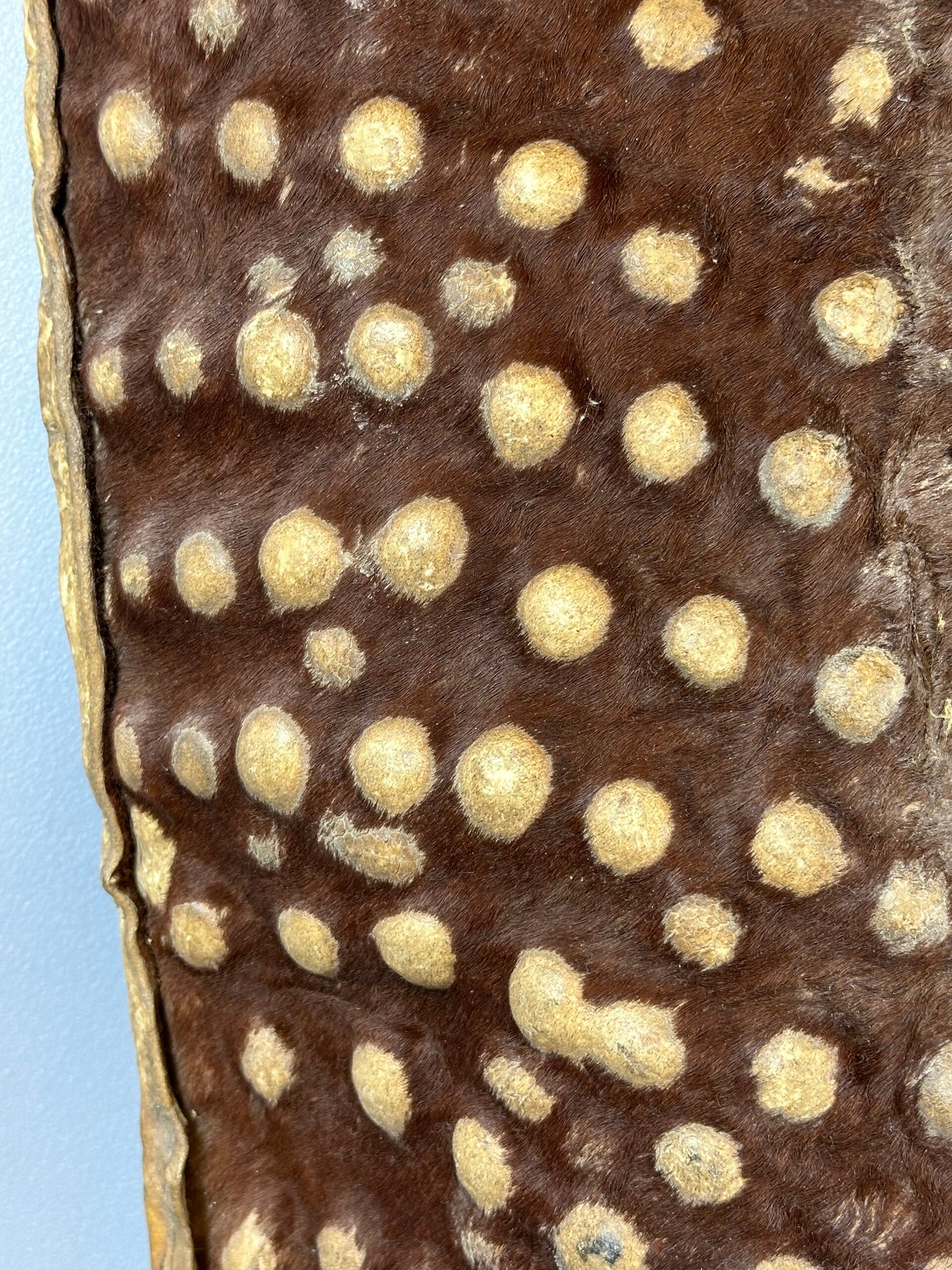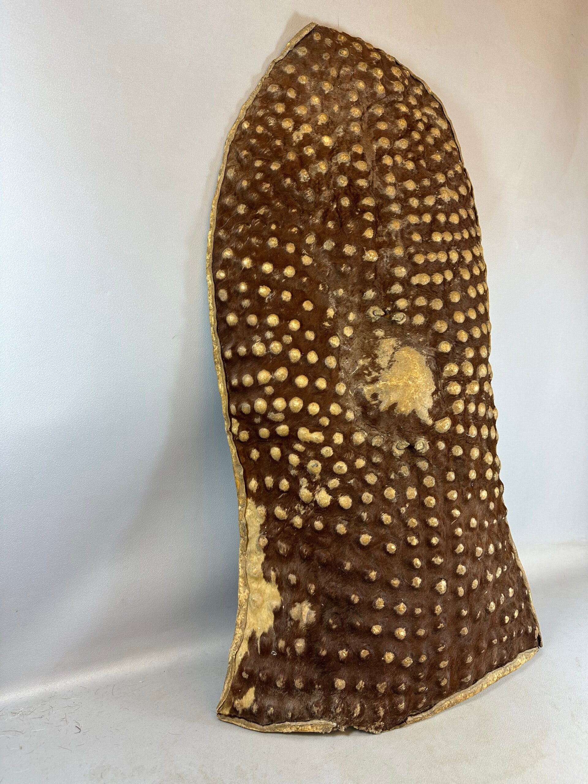 This is a very Old Embossed Leather Shield from the Kirdi People of Cameroon. "The name Kirdi, meaning "infidels", was given to the groups of peoples in Cameroon by the Muslims who drove them into their hilltop refuges from the plains below. They were ancestor worshipers and animists. This old Kirdi Leather shield is a wonder and was Collected in the field. This fabulous old and rare Kirdi Shield would be a wonderful addition to your collection.