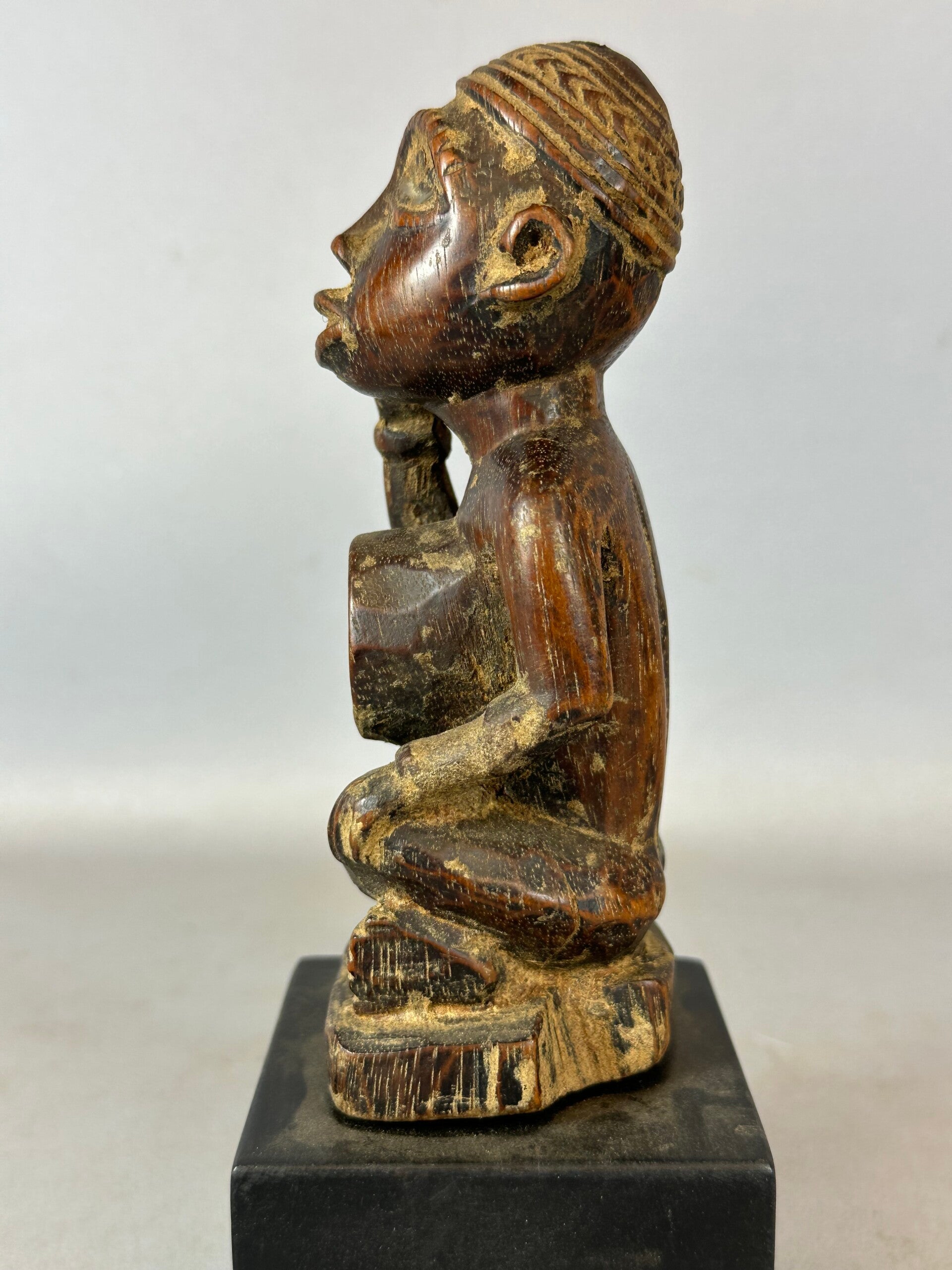 The Kongo demonstrate the extreme complexity of their traditions on major occasions, such as the investiture of a chief or at funerals. The Kongo pantheon was small: one all-powerful god who gave healing powers to the king, to the nganga, and to the heads of cults. Besides their textiles of great renown, the Kongo had a funerary art of decorated steles and funerary statues in stone, very often depicting the chief seated cross-legged in a posture of reflection. Some of these statues were placed on tombs to aid the spirits of the dead to join the world of the deceased.Wood sculptures represent royal wives, hunters, musicians, and healers. Their postures vary: sometimes they kneel in a position of respect, the head bent slightly backwards; women might be depicted seated with the child they hold by the neck or whom they are nursing. The cheeks are round, the face, carefully rendered, is realistic. The patina is smooth, the bust scarified. Elaborate geometrical patterns occur on the pedestal or the body, where they may be mingled with fine scarification marks. The figures were used to ward off danger to mothers during delivery and to protect the health of the child. The commemorative statues known as phemba were designed for women who had lost a child and wanted another. These carvings, generally sophisticated and very graceful, were thought to favor such a happy event.
