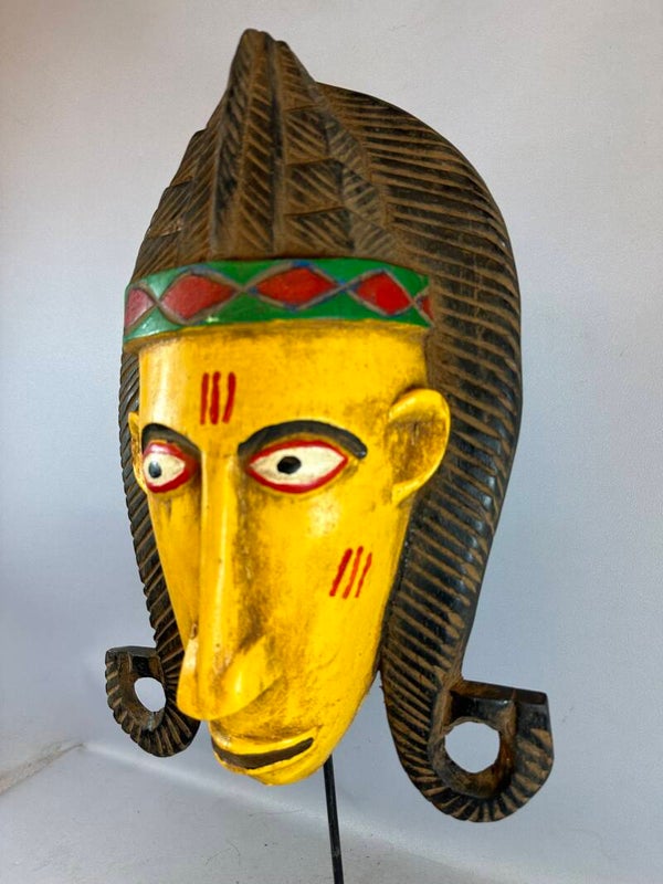 This is a fabulous Bozo mask that comes from Mali. Bozo Masks or animal masks are used by the people of the Bozo tribe of Central Mali to tell the stories of their tribe. The young men’s association is responsible for the masquerades after the harvest is finished. A week of song and dance with these puppets recounts the history of the group. Villagers come together to celebrate. Masks are brought out, and competitions are held to find the best performers. Tribal history, customs and morals are taught through the puppets. Bozo masks headpieces such as these were performed during the Sogo Ba masquerade. Dance troops of young men, members of local youth groups, sing, dance, drum, manipulate puppets or dance masks in creating performances called Sogo Ba. Though considered to be a form of entertainment the performances are directed towards a description of the moral universe and the imperfection of humans and the need to educate people as regards ethical behavior and how to attain a religious way of life and how to maintain social and familial stability. Performances include religion, history, observations of local contemporary political events, satire of behavior and simple entertainment through the music and dance. The headpiece is a complex carving with a number of motifs presented and emphasized through the use of bright colors and expressive sculpting of the facial features and metal decorative pieces.