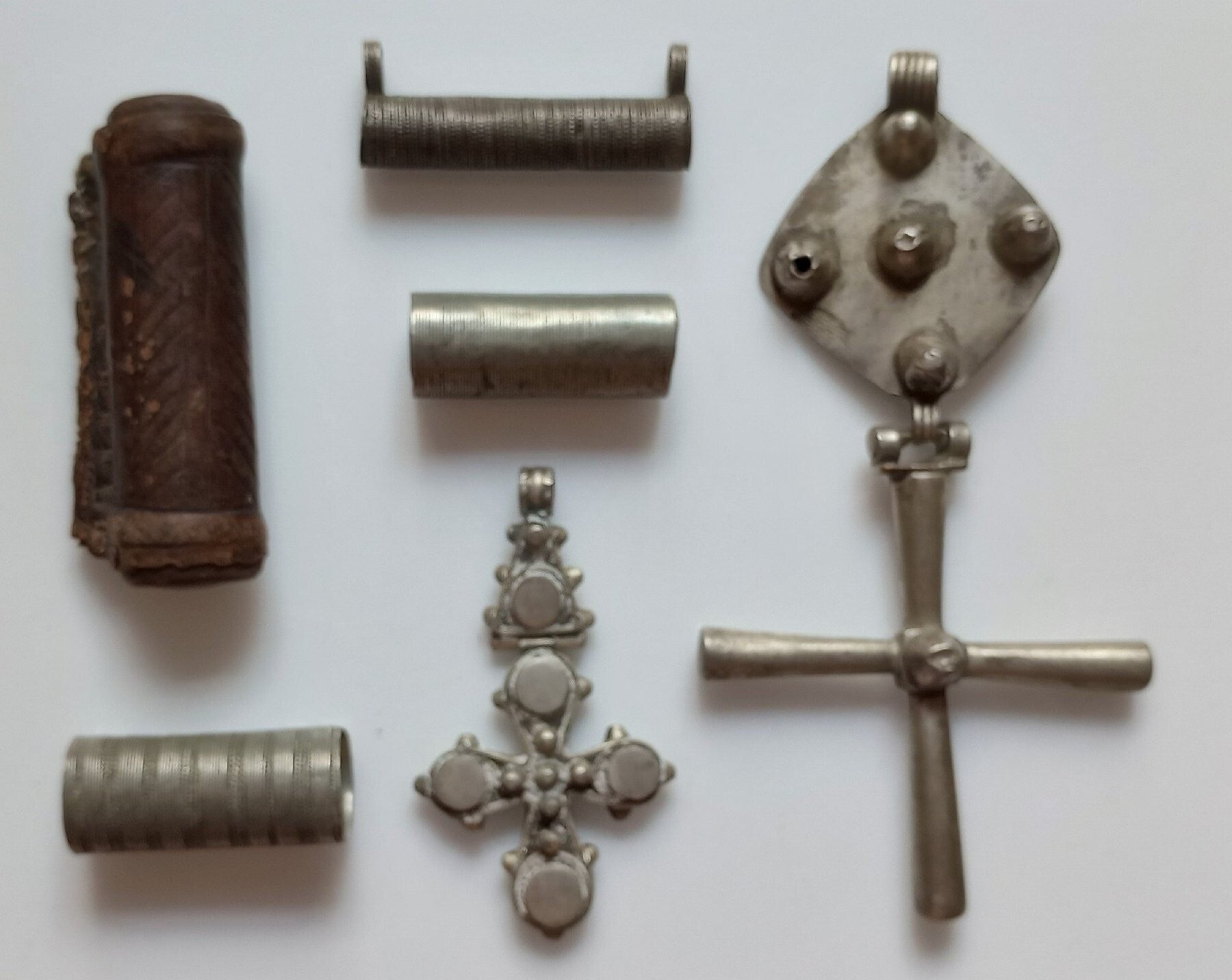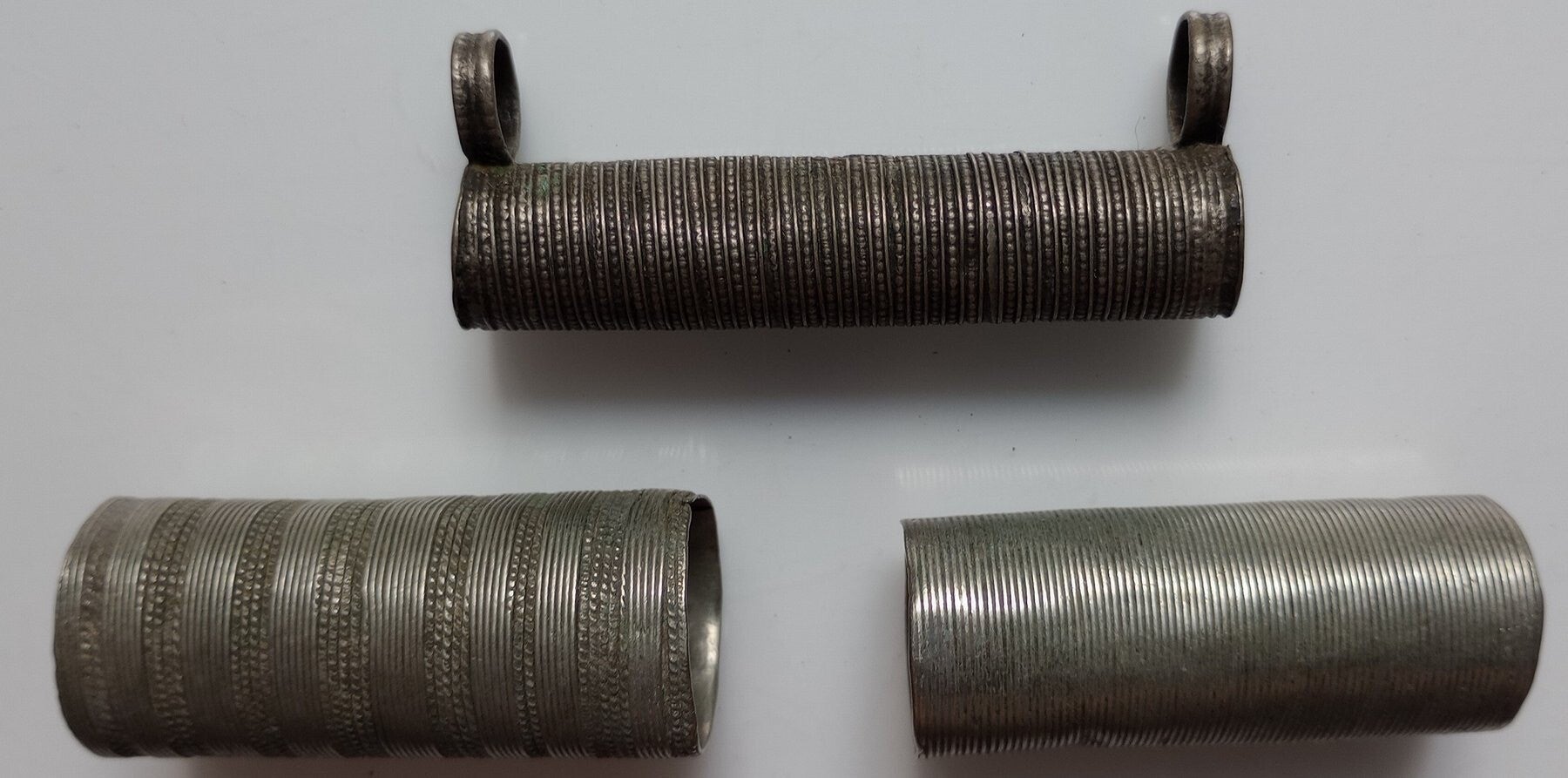 The three cylinders , made of low-grade silver and nickle, were worn around the neck. Decorated with very thin lines of silver-thread. ( 4/4,3/5 cm lenght). Also found in Lalibela.
