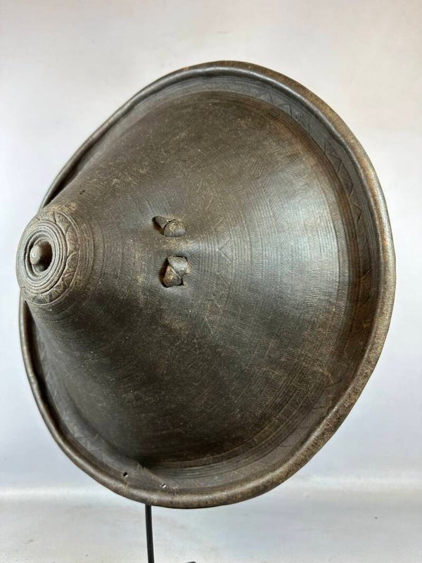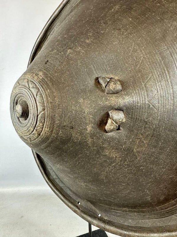 Leather is preferable for the hide is strong and resistant. The hide used is from the buffalo, rhinoceros and elephant. The visual effect, the functionality and practical purposes of the piece dictated the form a shield should take. A good shield should offer a maximum of protection. The material used should be strength and durable. Almost all peoples of Africa made usage of the shield. In many cultures, shields like this were known as a defensive weapon, used by the warriors during combat. Shields were also displayed as emblems of status or rank and also as accessories of dance during festival or commemorative ceremonies or after a victory.