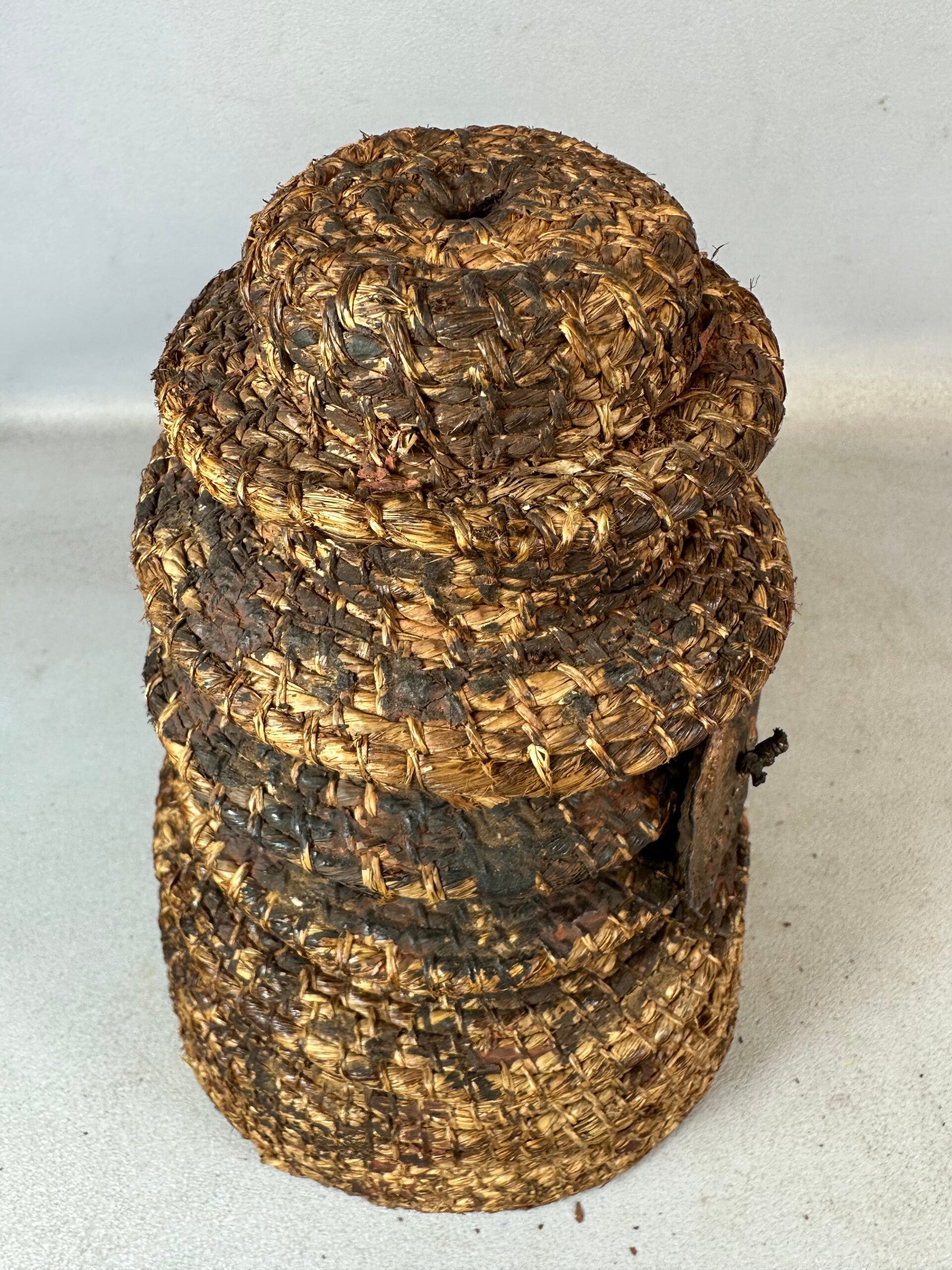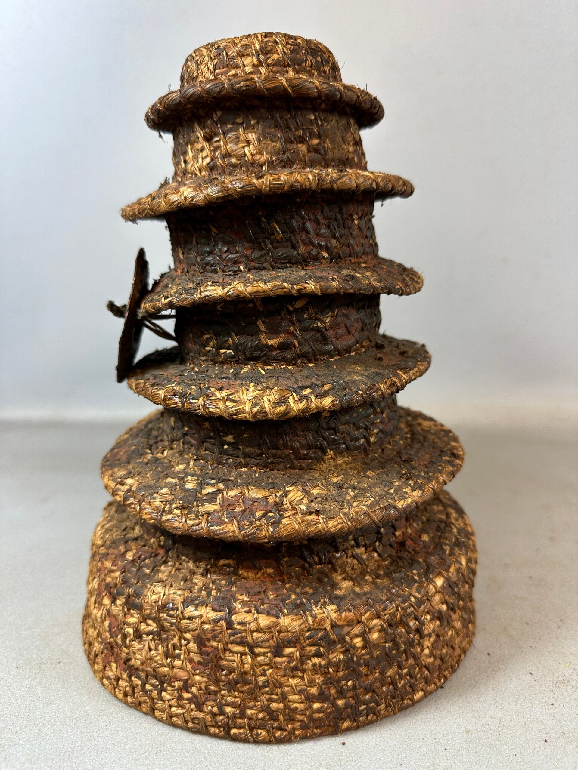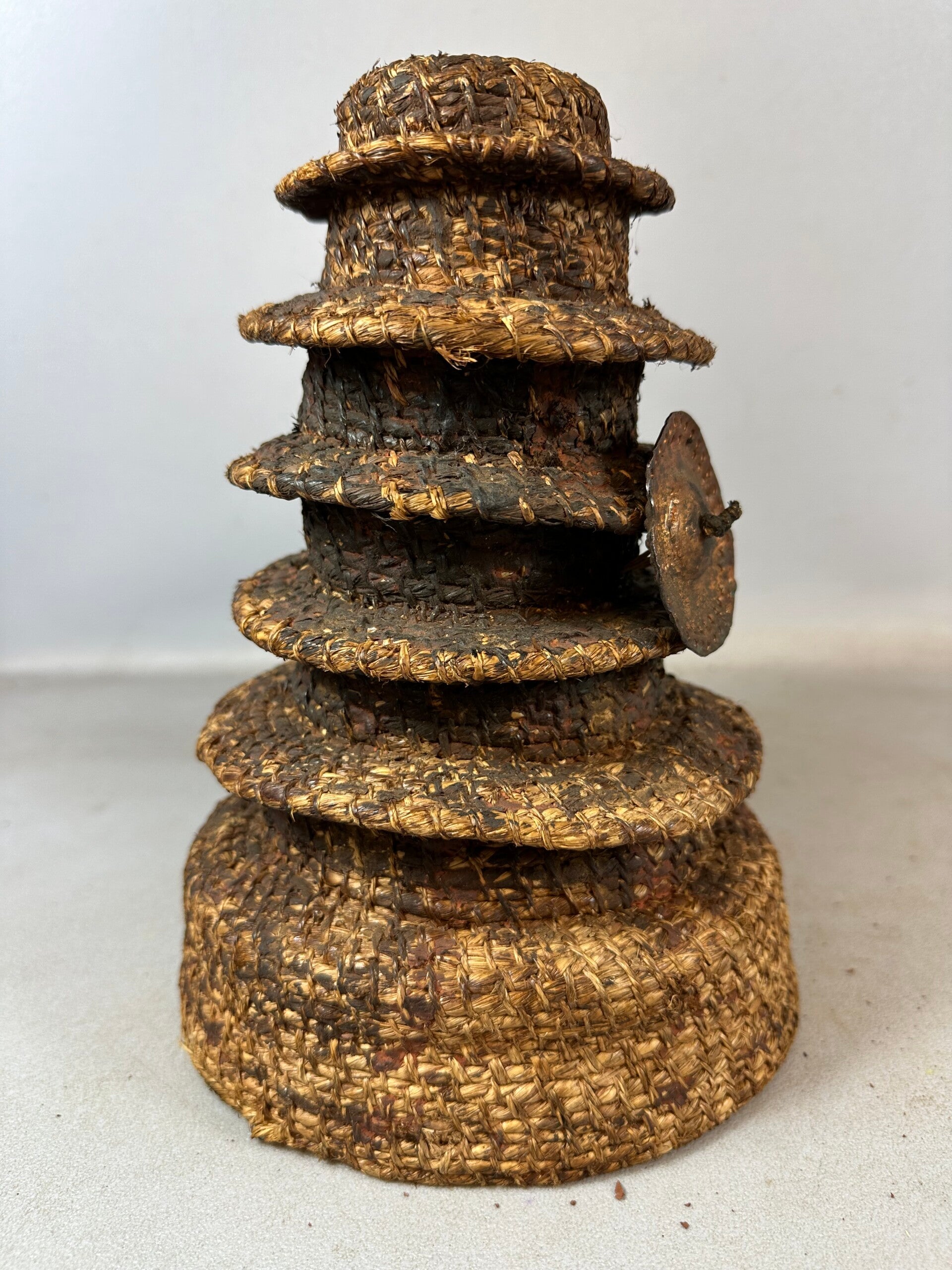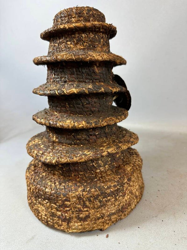 The Ekonda are an agrarian people who live the equatorial forest of Democratic Republic of the Congo. This multi-tiered, "Botolo" hat is a crucial component of the Ekonda chief's attire, worn during public ceremonies. It is hand taylored from culturally indigenous materials, and features several, circular brims molded in a pagoda-formed tower. Additional is a brass (or copper) disk projected frontally from its base. The disk's primary function is to represent wealth and prestige for its wearer. During cultural rituals, these hats would often be treated with a combination of camwood powder and oil. This specific example is marked by a heavy patina. It is in good condition, with natural wear of to the aged, brass plate. As is similar to other African cultures of this region, the hat is preserved and by tradition, passed down to successors. The chief, or "nkumu," possesses exclusive rights to the use of culturally prestigious objects, of which the "Botolo" is best known.