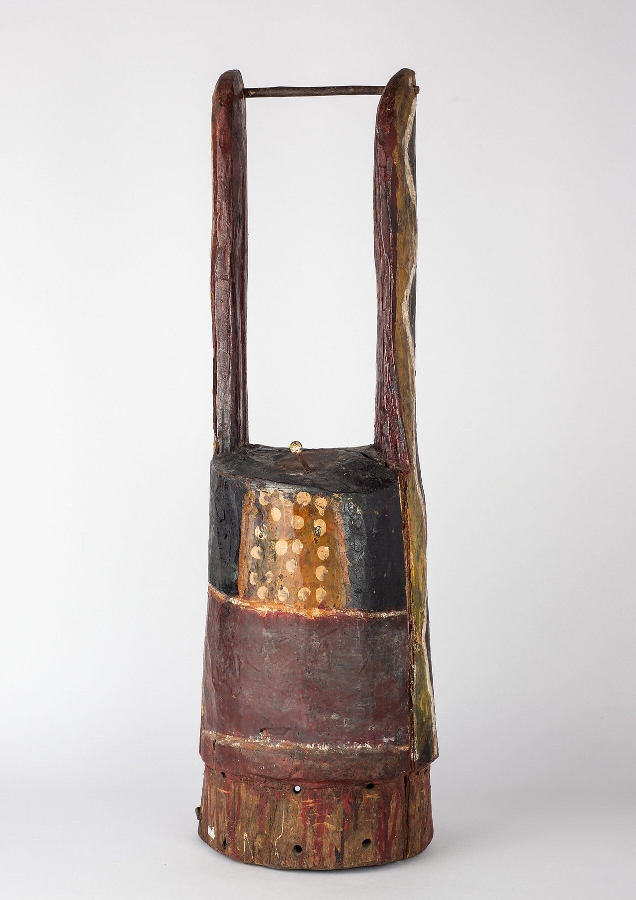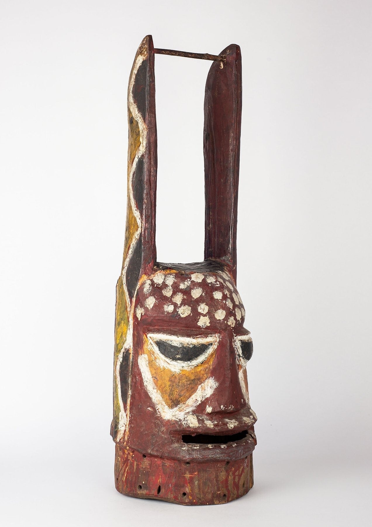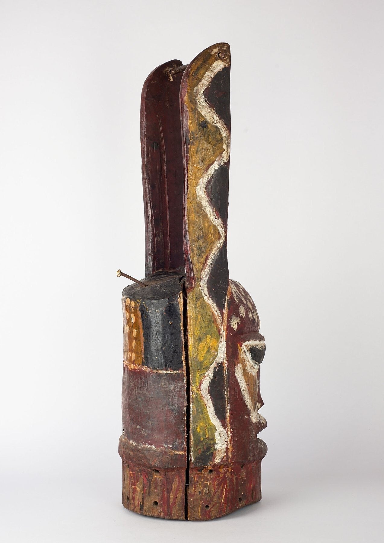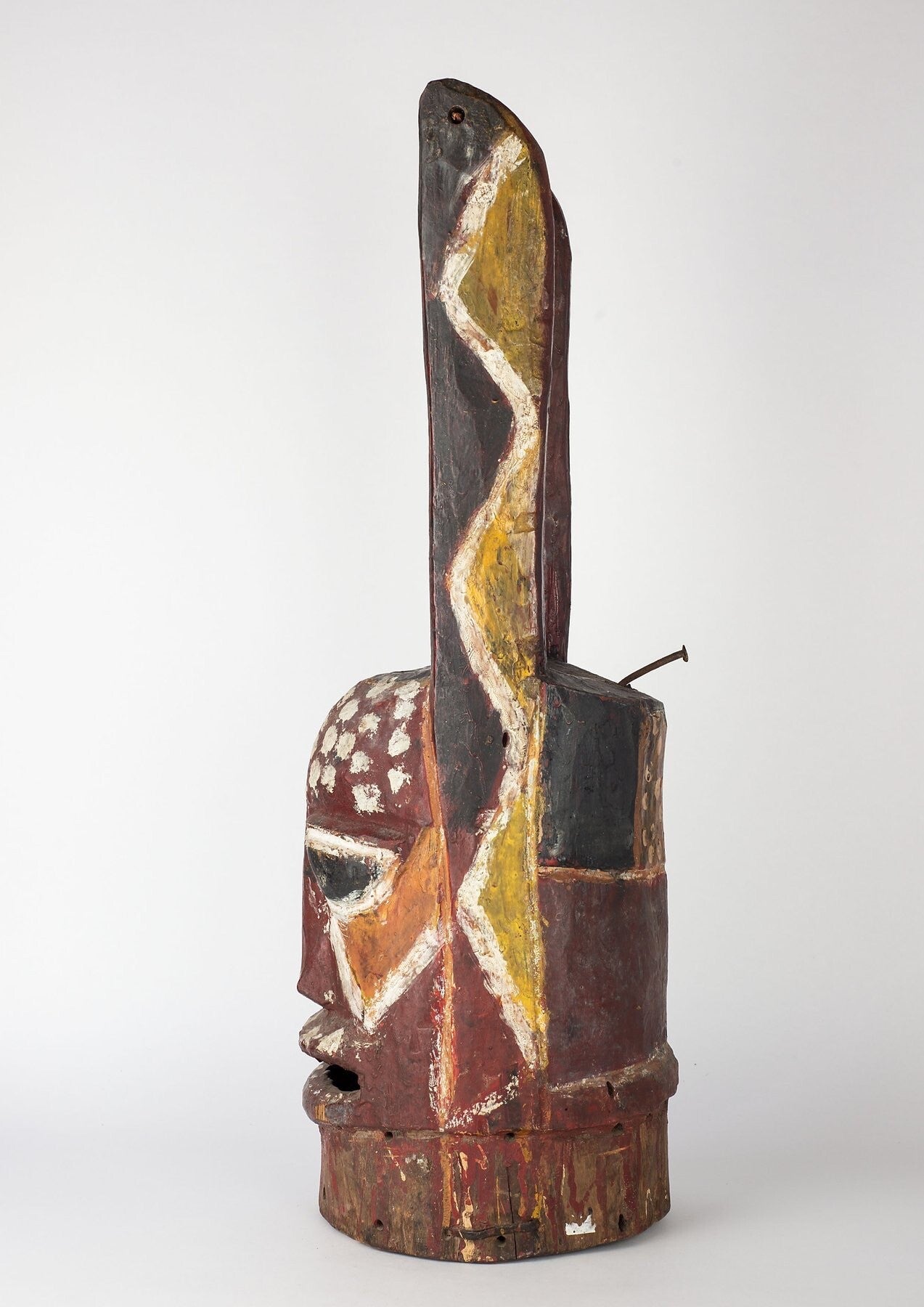 Among the Yoruba Gelede masks dance of the ‘mothers’, good witches who propitiate and control the power of the ‘bad’ witches who fly at night causing human misfortune, illness, and death. When Gelede appears, they dance in pairs in a tightly structured and complexly choreographed dance accompanied by singing and drumming. Most ‘witch-catching’ Gelede masks are carved from a single piece of wood to be worn on the top of the head over the forehead with a multicolored costume made up of numerous panels of brightly colored cloth completely covering the body from head to foot. The panels of cloth will flare outwards while being danced giving the dancer a dynamic appearance. Gelede performances may extend over several days with different dance forms and movements. When performing the masks dance as a coordinated pair often with mirror-like movements during an athletic and vigorous dance that often interacts with the audience. Their energetic dance steps will often kick up the dust so that they appear to float above the earth and the anklet bells that they wear reinforce the rhythm of the music. Gelede masks will also reflect local traditions of facial marking and symbolic headdresses whereas this example brings to mind the beautiful and classic sculpted heads of ancient Ife