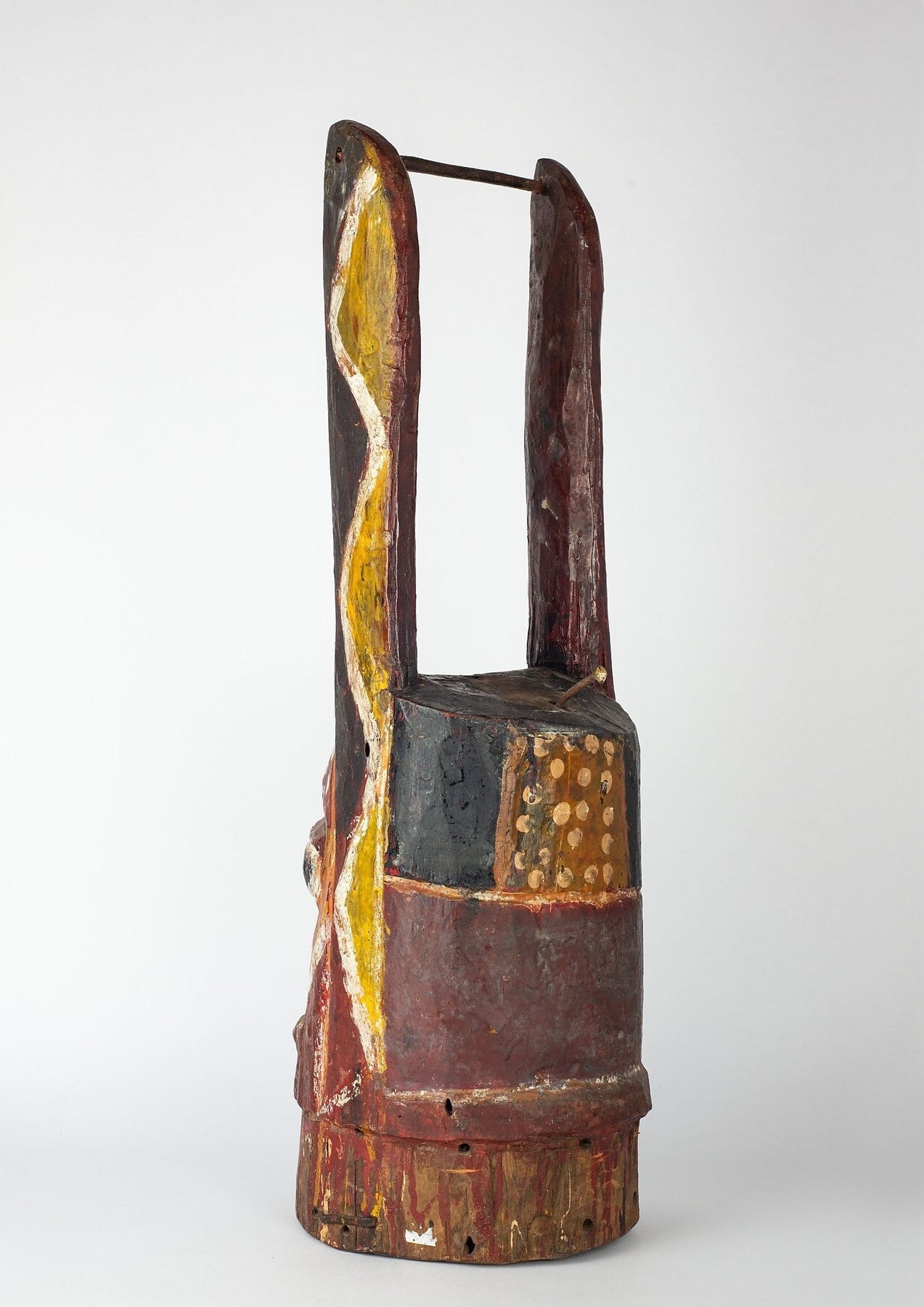 This wooden headdress is carved from a single piece of light wood. The human face appears to represents a male. It is carved with the classical Yoruba facial features: heavy eyelids, bulgy almond-shaped eyes, flared nose and compressed full lips. The pupils and nostrils are roughly pierced with circular holes. Three scarification lines are incised on the forehead and both cheeks. They are stained in black. These scarification lines are called pele, which many communities in south-western Yorubaland regard as ‘gems’ on the human face. The ears are shaped like question marks. Overall, the facial features exemplify supremacy, rigour and calm.