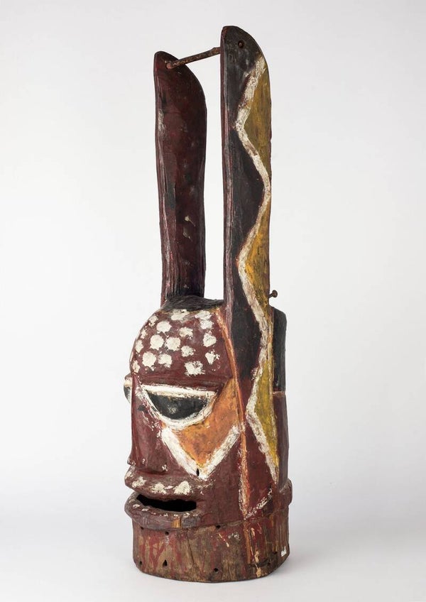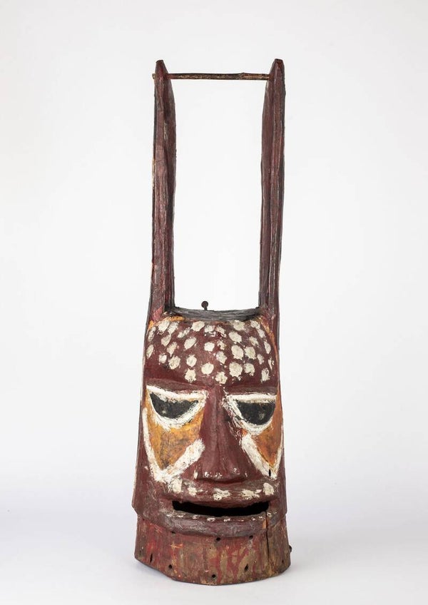 This Gelede mask comes from the Yoruba who live along the boundary between southwestern Nigeria and present-day Benin (Dahomey). The Gelede form is clear here: the downward-facing gaze and subtle scarification on the cheeks accompanied by the round forehead. Gelede masks are often decorated with animals or other motifs on top.The Yoruba are known to apply colorful pigments to their facial features, too.