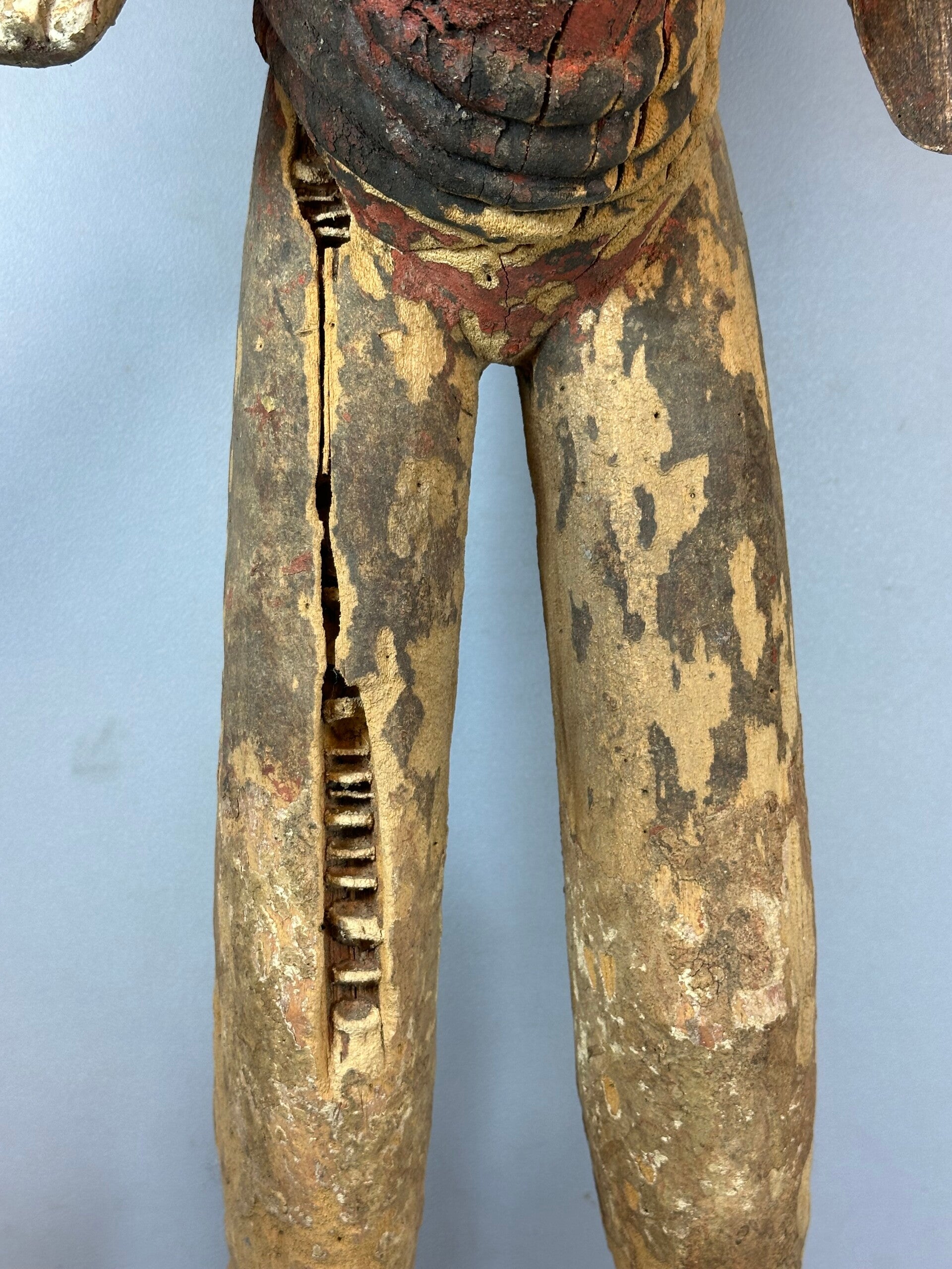 The scarification marks on the stomach and chest are for beautification and indicate the individual was a completely socialized adult who had undergone rigorous training to become a member of the community. The carved spirals around the legs represent anklets, which are worn at the prerogative of the ozo titleholder. The figure was primarily red originally, probably the result of having been rubbed with camwood, much as the Igbo do to beautify themselves. Traces of red and ochre are still visible. White chalk rubbed on the face symbolizes purity, beauty and sanctity. Although the figure was most often clothed when honored in the shrine, the detailed scarification of the torso, the leg bangles and the careful depiction of genitalia are the carver’s way of clearly identifying the figure.