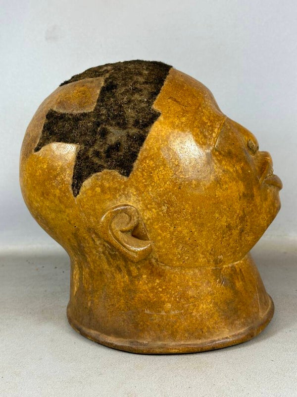 This mask (lipiko) is associated with initiation ceremonies among the Makonde. It is carved from a very light wood. It is always worn with a cloth draped over the mask and falling over the dancer’s shoulders and as part of an elaborate costume designed to completely conceal their identity. These helmet masks are carved with the face tilted upwards, with prominent eyes. The concave nose looks out onto oversized, parted lips through which filed teeth are visible. The ears are placed at the level of the mouth..