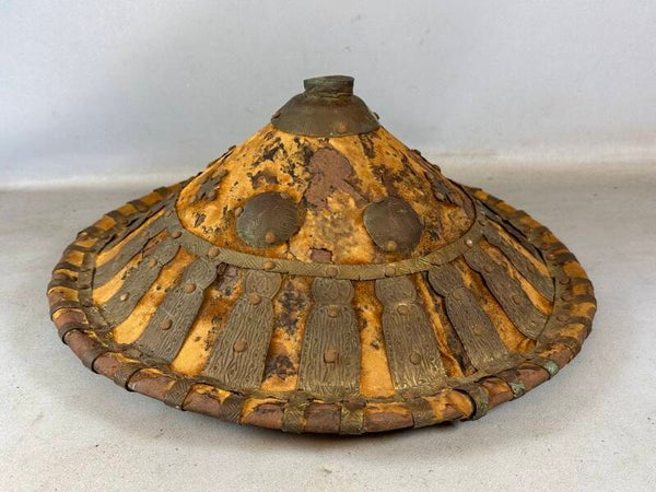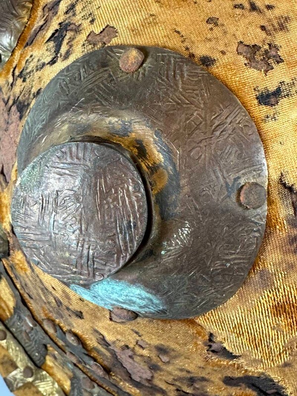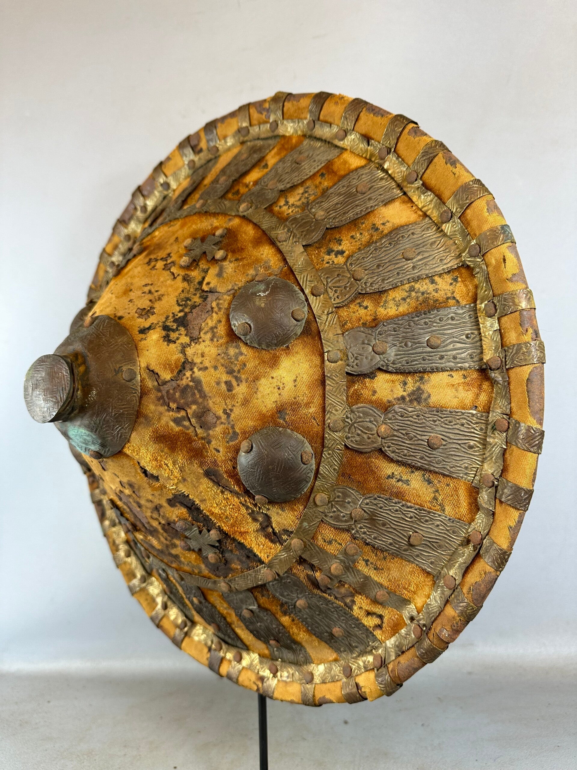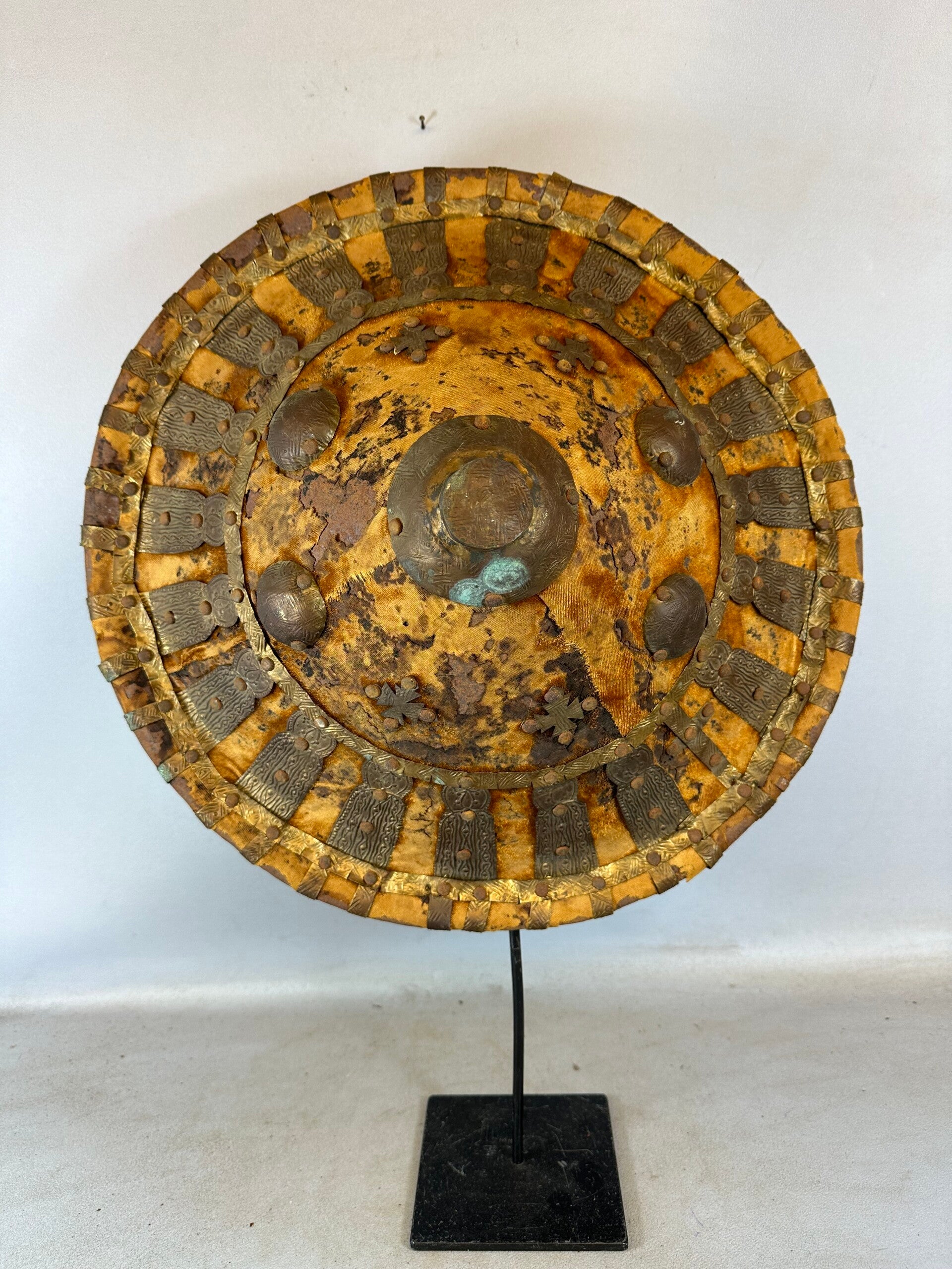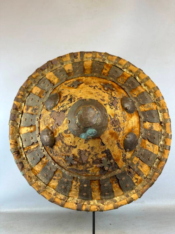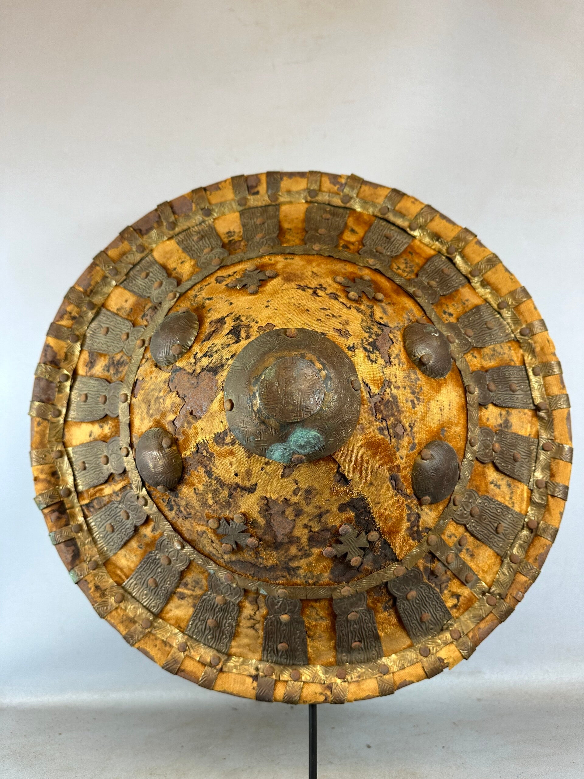 Antique Ethiopian Ras shield made of forged Leather & metal, engraved and hammered brass panels, and a cylindrical shield boss at its peak.