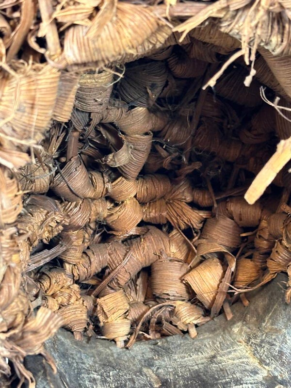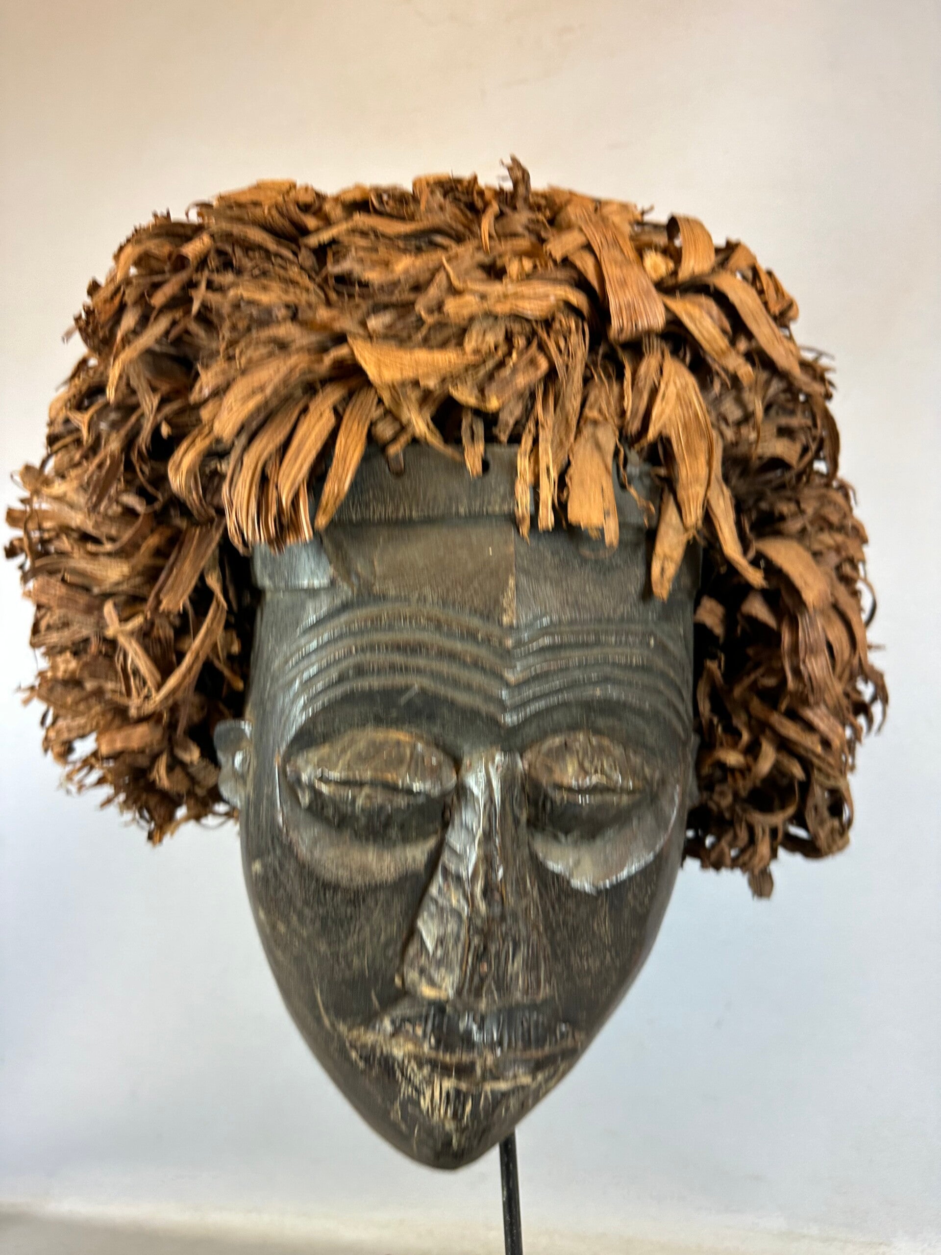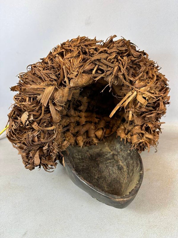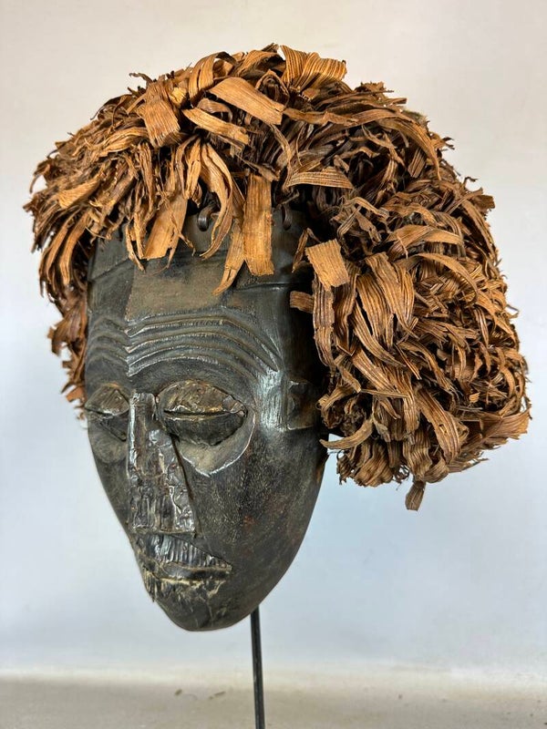 Wood reinforced with copper plate at the nose, eyes and mouth. Monumental headdress made of vegetable fibers. Very beautiful specimen.