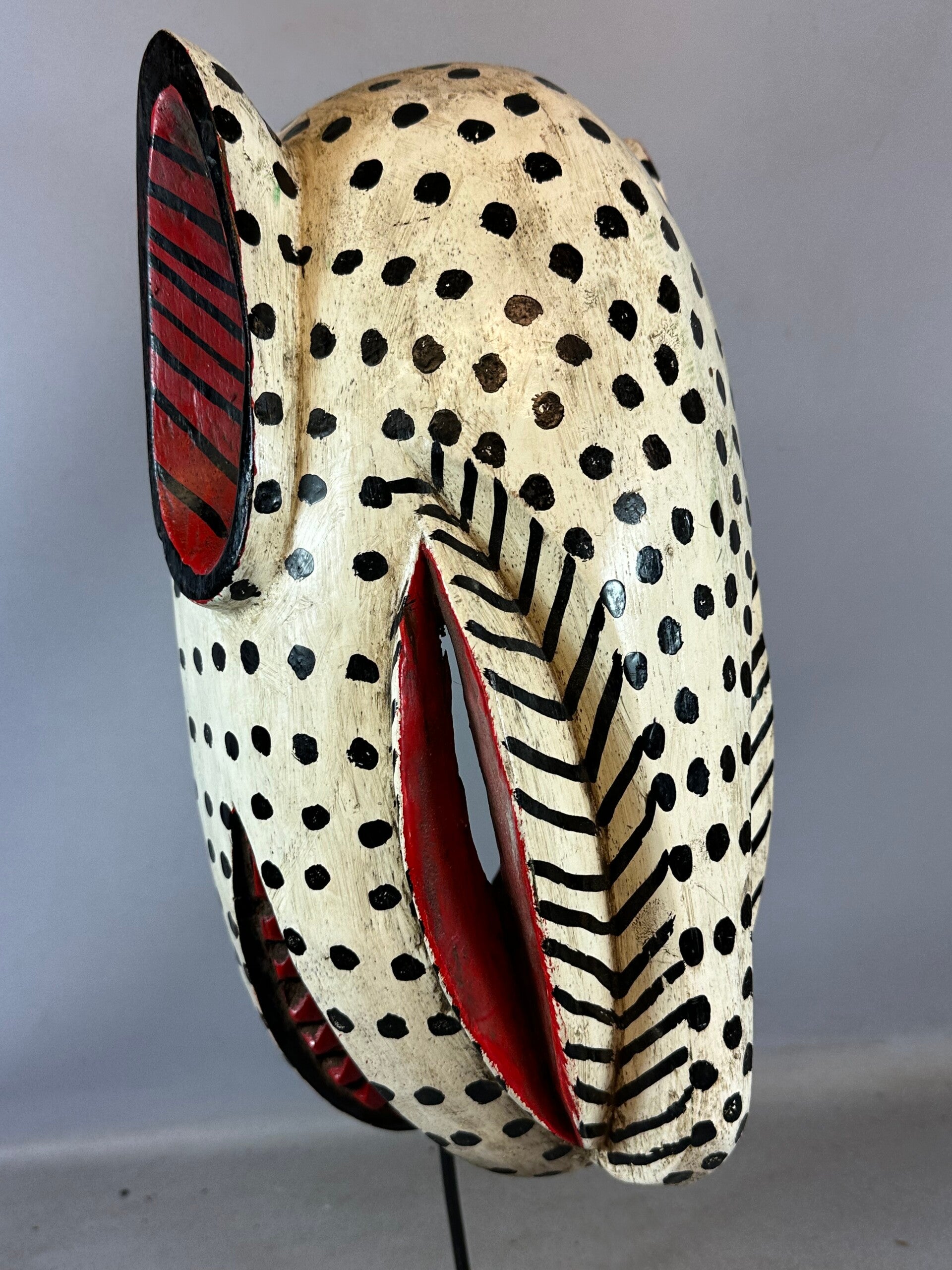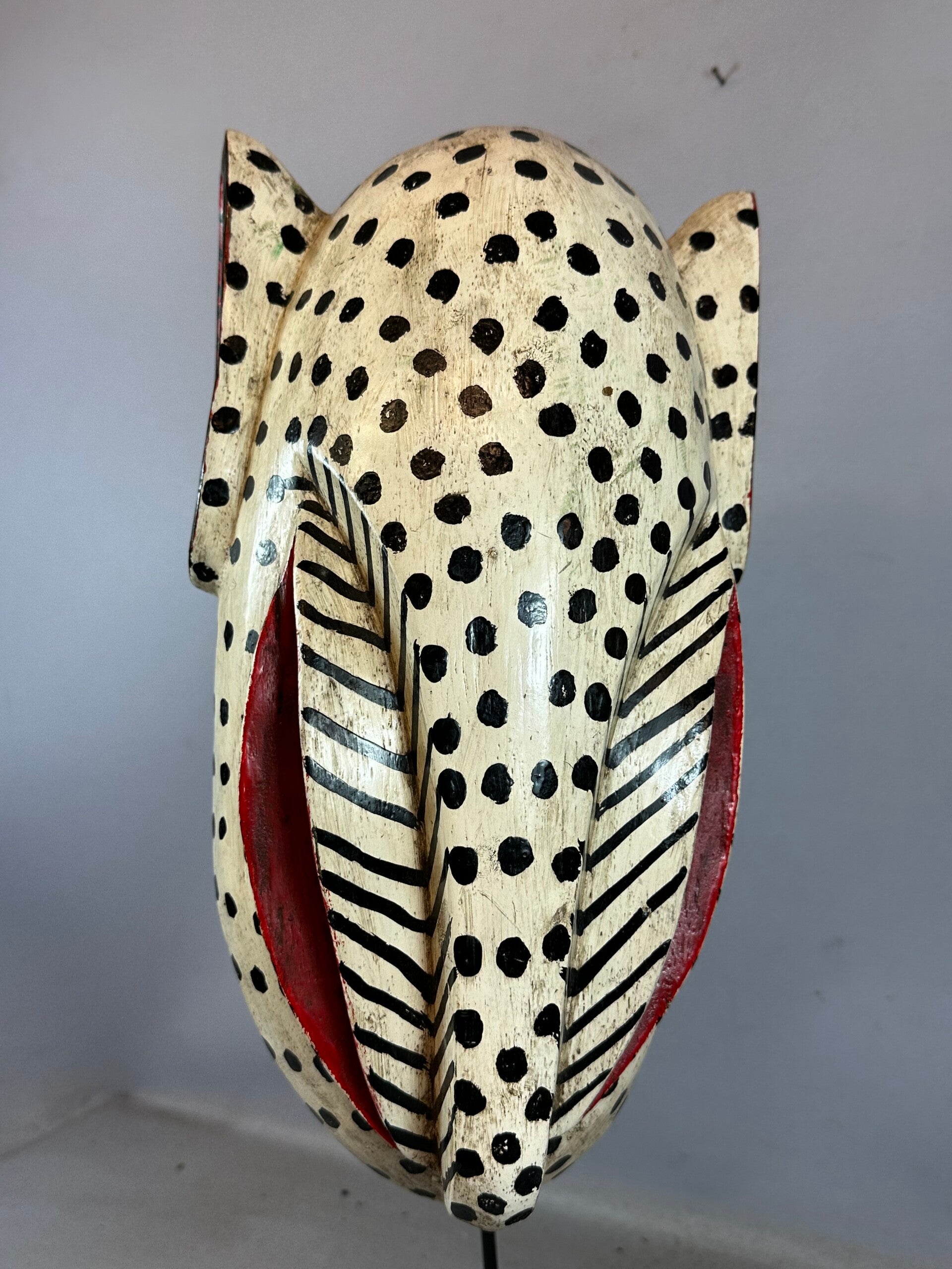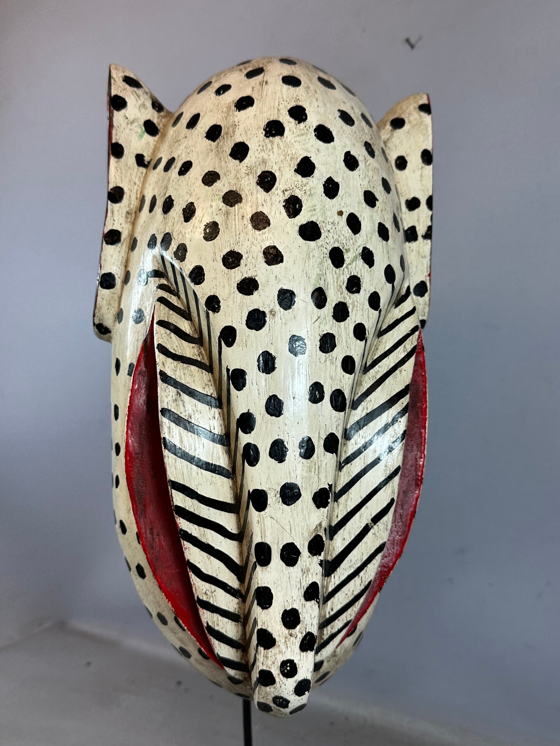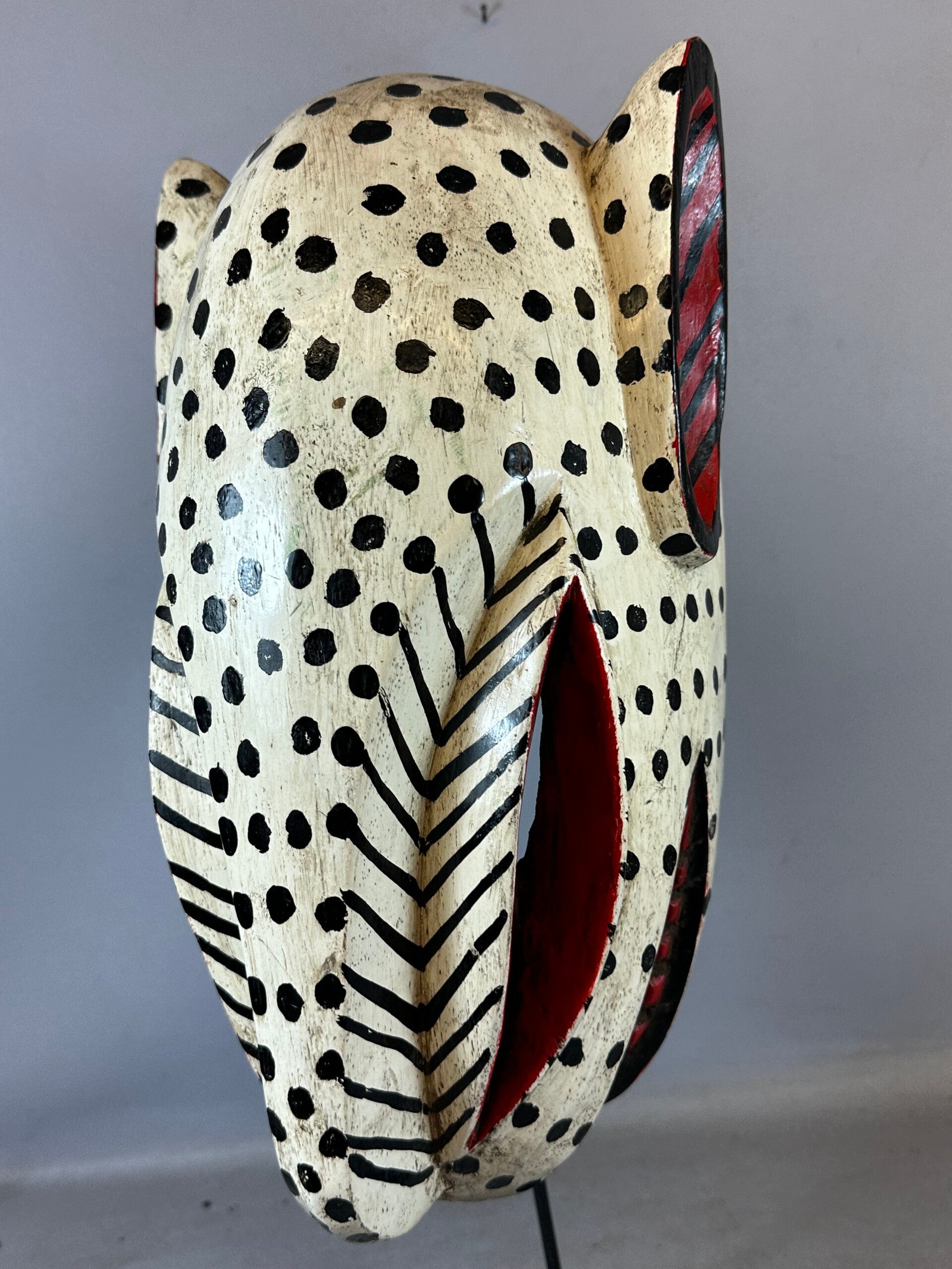 This is a fabulous Bozo Lion Puppet mask that comes from Mali. Bozo Fish Puppets or animal masks are used by the people of the Bozo tribe of Central Mali to tell the stories of their tribe. The young men’s association is responsible for the masquerades after the harvest is finished. A week of song and dance with these puppets recounts the history of the group. Villagers come together to celebrate. Puppets are brought out, and competitions are held to find the best performers. Tribal history, customs and morals are taught through the puppets. Bozo puppet headpieces such as these were performed during the Sogo Ba masquerade. Dance troops of young men, members of local youth groups, sing, dance, drum, manipulate puppets or dance masks in creating performances called Sogo Ba. Though considered to be a form of entertainment the performances are directed towards a description of the moral universe and the imperfection of humans and the need to educate people as regards ethical behavior and how to attain a religious way of life and how to maintain social and familial stability. Performances include religion, history, observations of local contemporary political events, satire of behavior and simple entertainment through the music and dance. The headpiece is a complex carving with a number of motifs presented and emphasized through the use of bright colors and expressive sculpting of the facial features and metal decorative pieces.