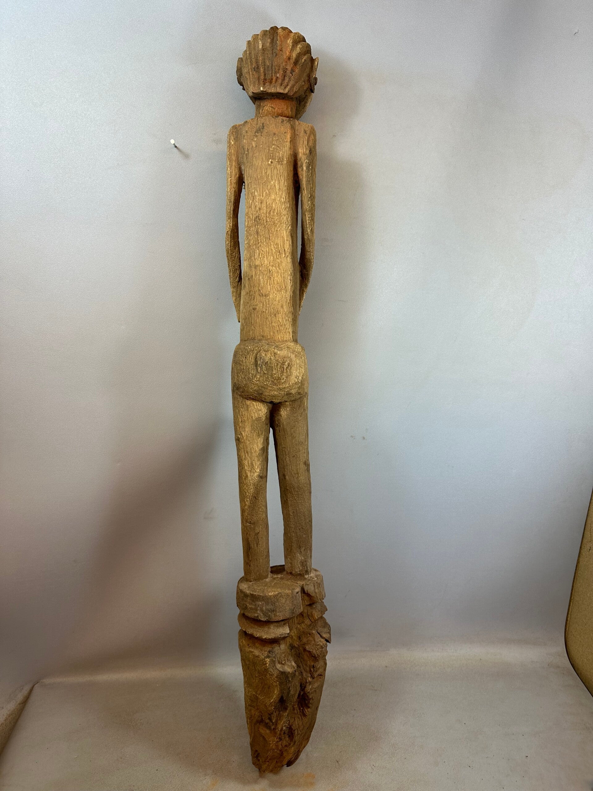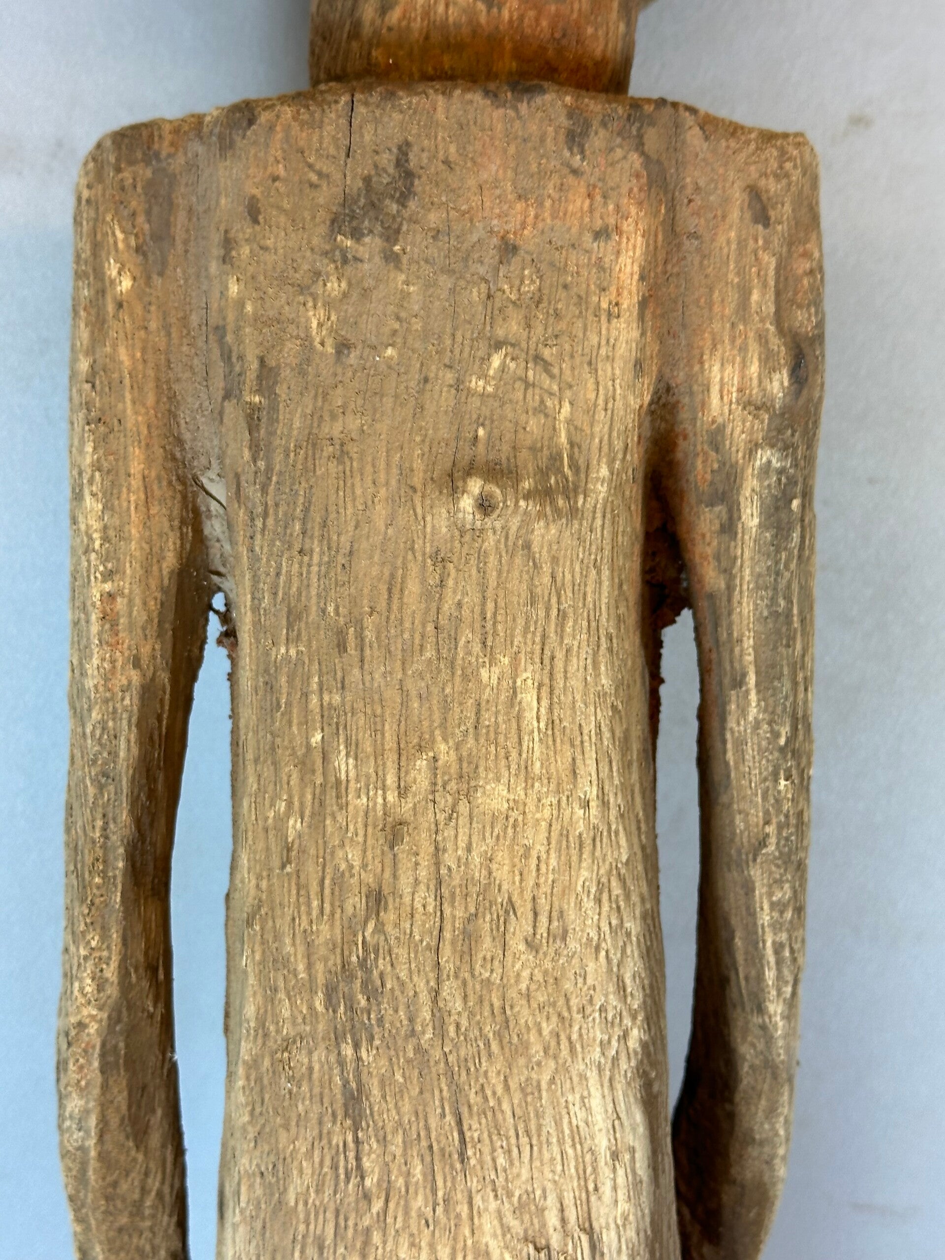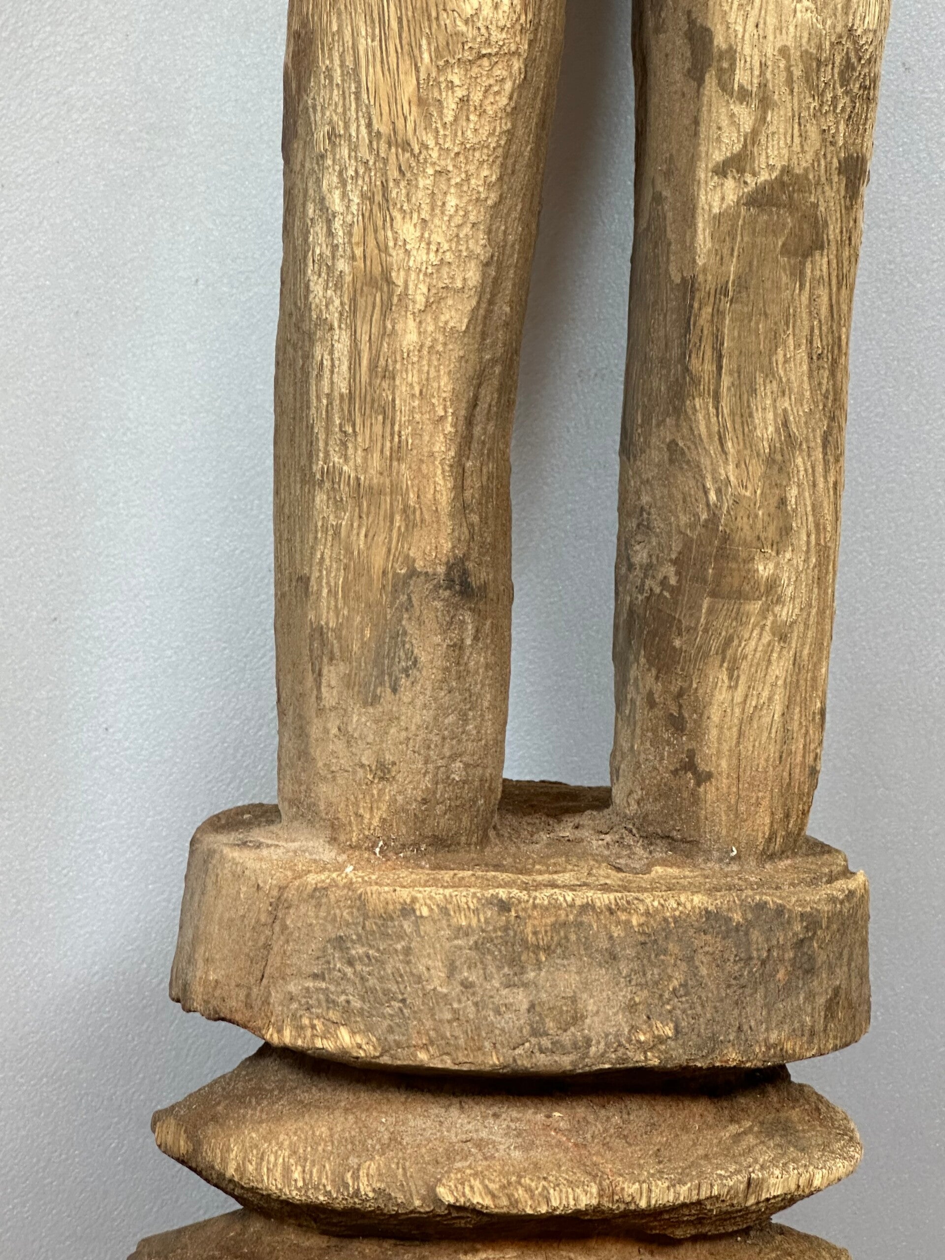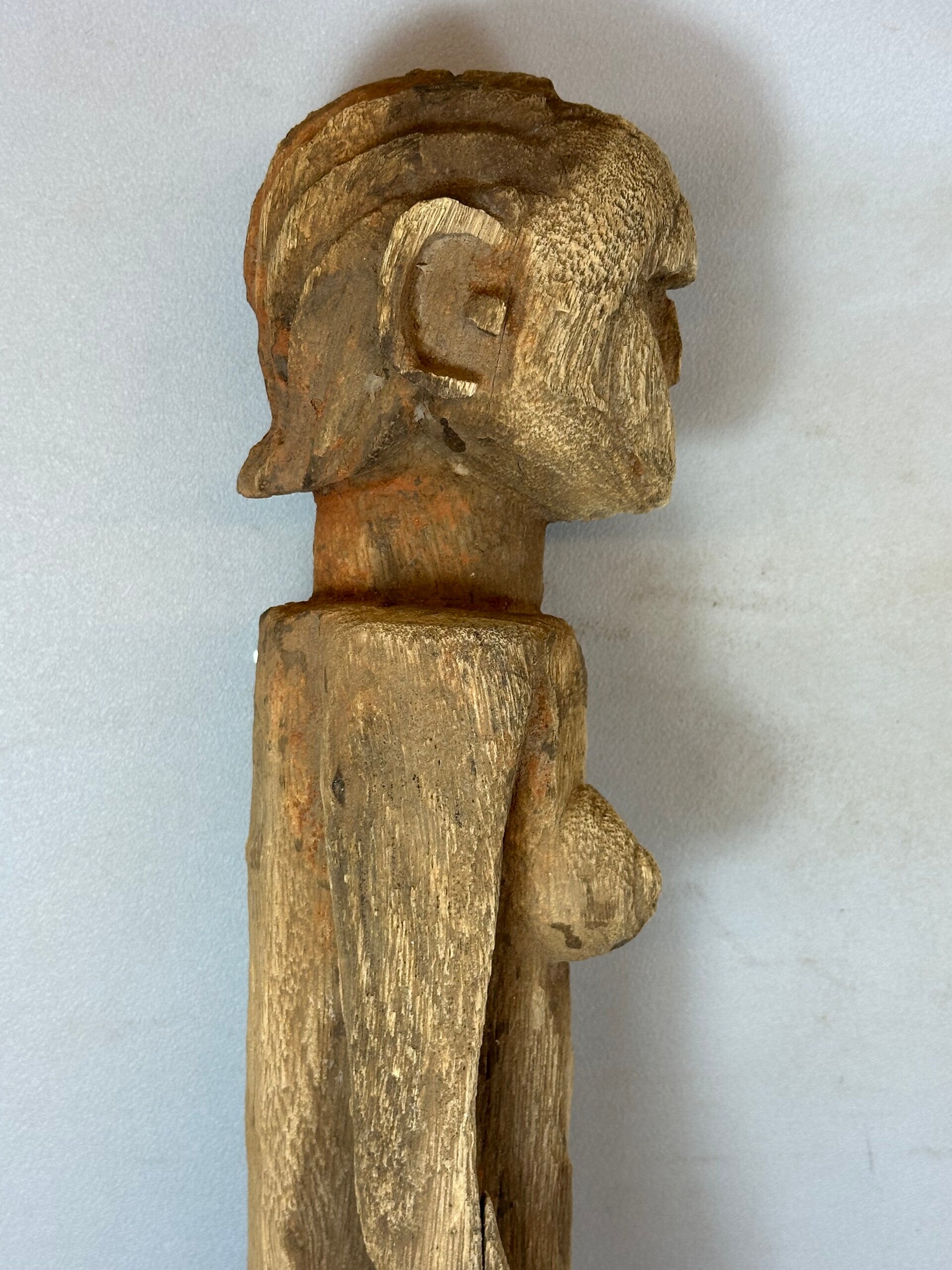 Overall condition: the statue shows deep erosion due to many years of wind, strong sun, rain, white ants. The wood (mahogany) is very hard, solid and heavy. The bottom part (originally inserted in the ground) has been partly eroded by humidity, worms, white ants and insects in general. Minor cracks are located all over the surface, as well as many signs of erosion, but the statue is entire and well preserved and looks amazing. General wear is evident.