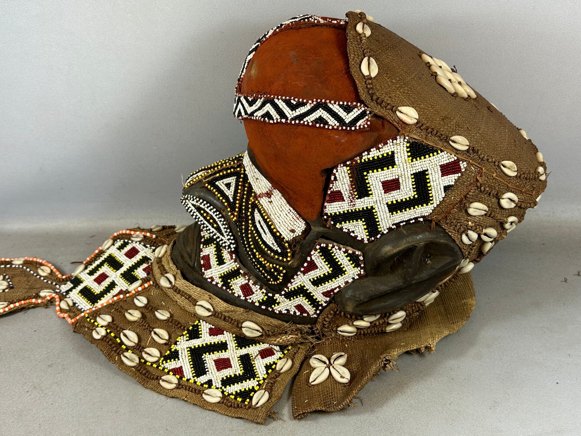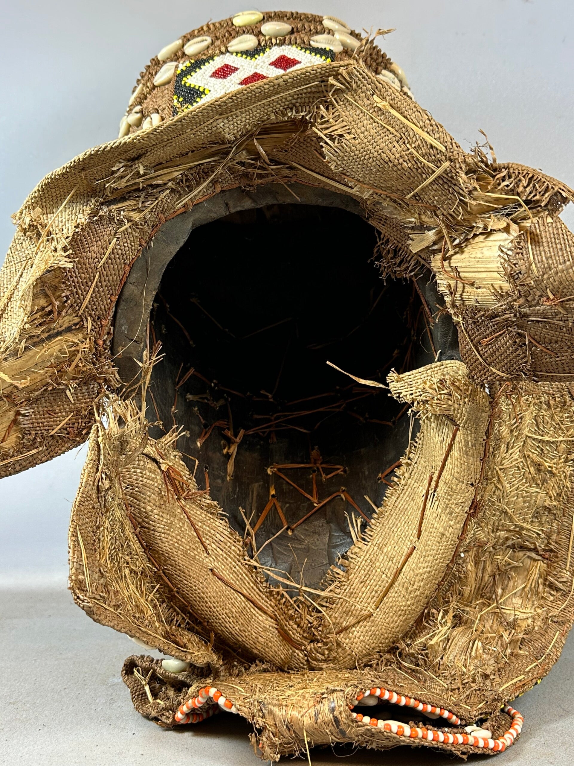 Very expressive african helmet mask from the Kuba, Congo. The mask is one of three royal Kuba masks. In the annual Kuba feast three royal masks appear that represent the primal ancestors of the Kuba dynasty. The two brothers Woot and Bwoom fought over the throne and their sister Mweel who later married Woot. Wooden helmet mask, shod with sheet copper, with very nice dark patina, decorated with kauri shells, colored glass beads, nut shells and raphia netting.