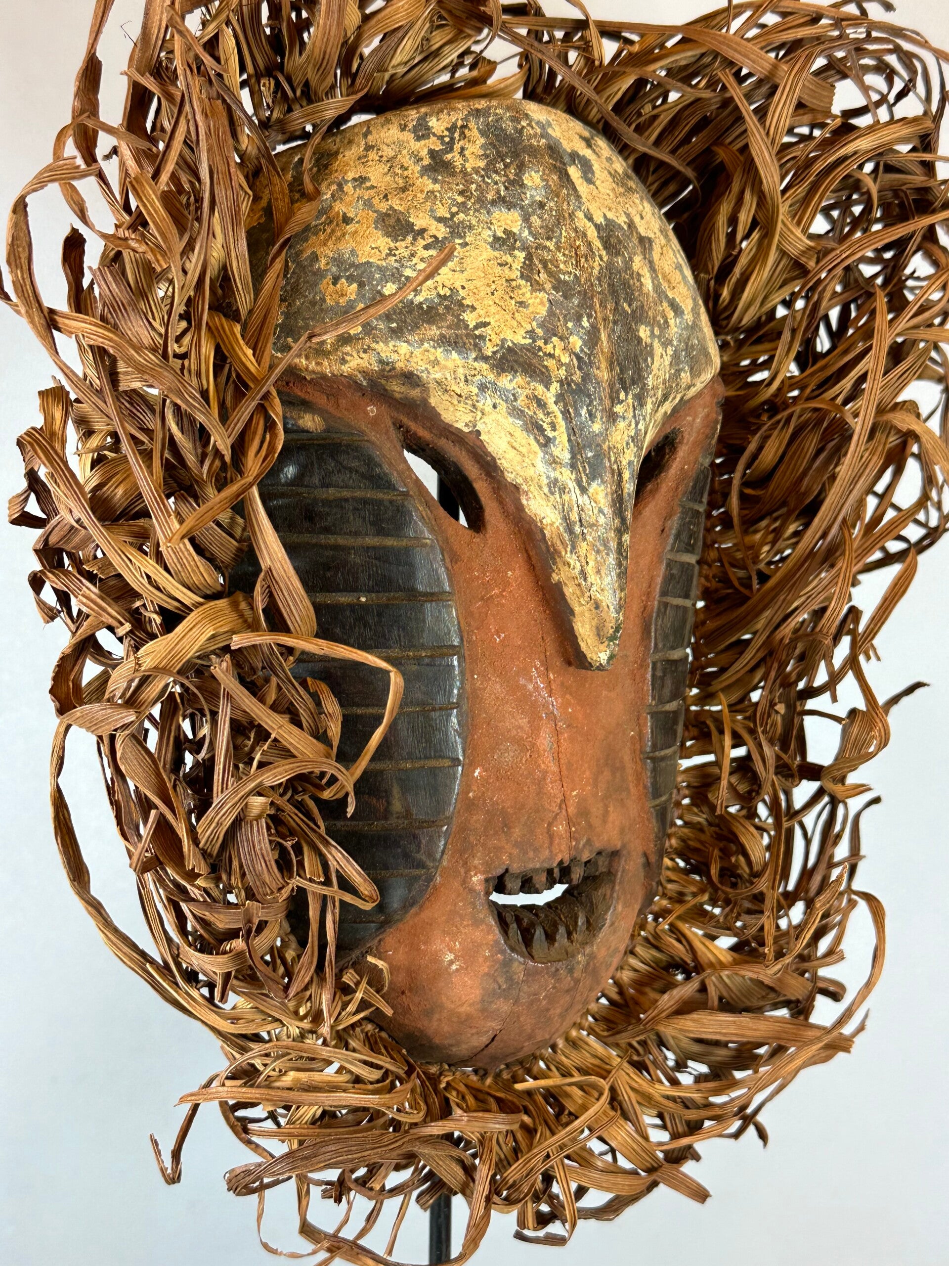 This almost flat African mask stands out for its naive appearance. Of Mbole or Yela origin, two close African ethnic groups in the DR Congo, there are oblique streaks under the eyes. These highly stylized traditional masks intervened during initiation rituals of which little is known because they took place away from the village, in secrecy.