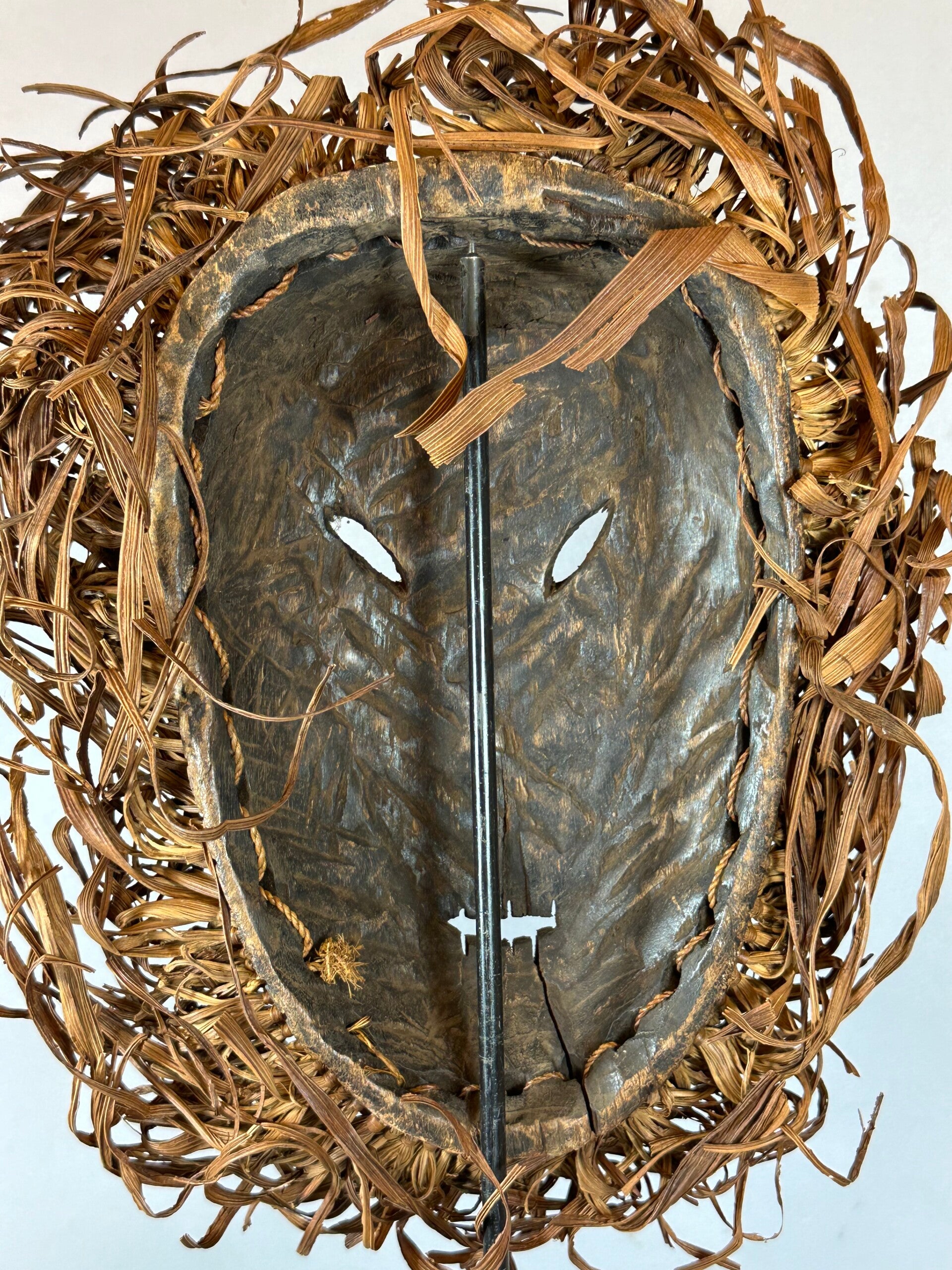 The Yela and their neighbours the Mbole live in the central-eastern equatorial forest. Their socio-cultural life is dominated by the secret Lilwa community, which is of a judicial nature. The mask is worn by the "Kumi", the one who speaks and passes judgement, but was also used during male initiation ceremonies into the Lilwa society to obtain discipline and secrecy from the new initiates. The masks of the Yela and Mbole show stylised faces, diagonal stripes under the eyes. These were used by prominent members of the Lilwa community during ceremonies that symbolised judgement and emphasised moral behaviour.