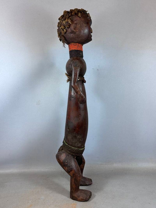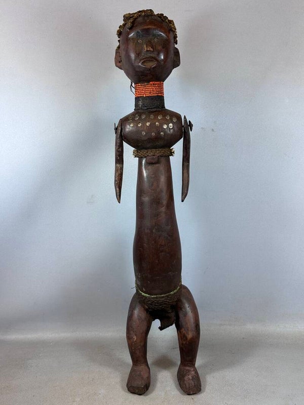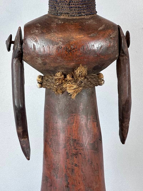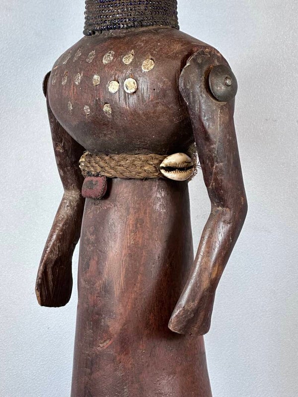 Ancestral doll or marionette with movable arms, hair and jewelry, used by musicians and dancers during ceremonies in the dry season, following the harvest. Size: 69 cm high.