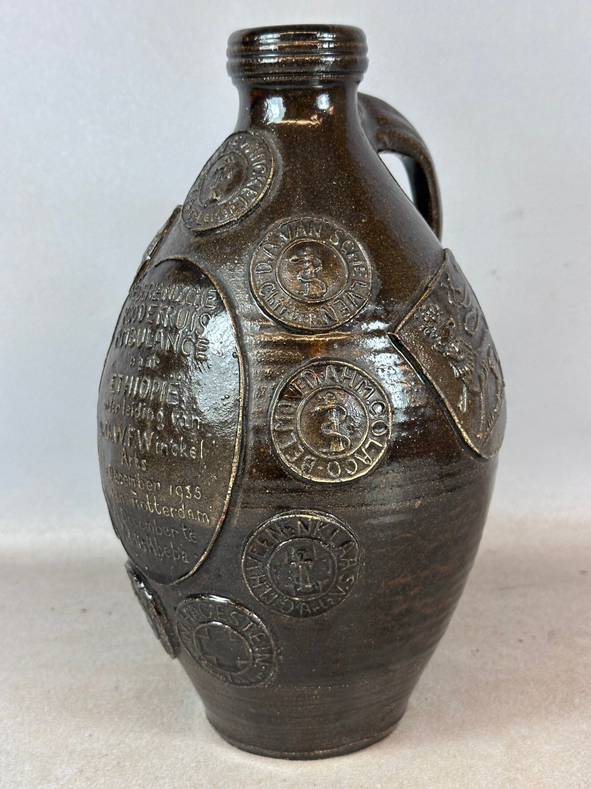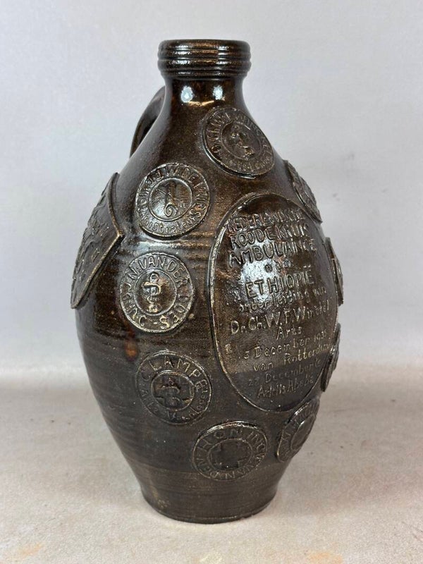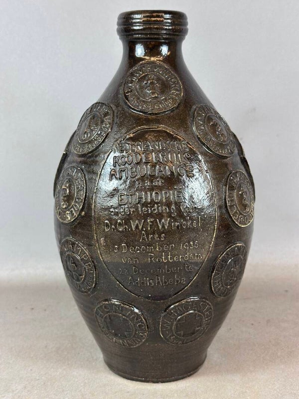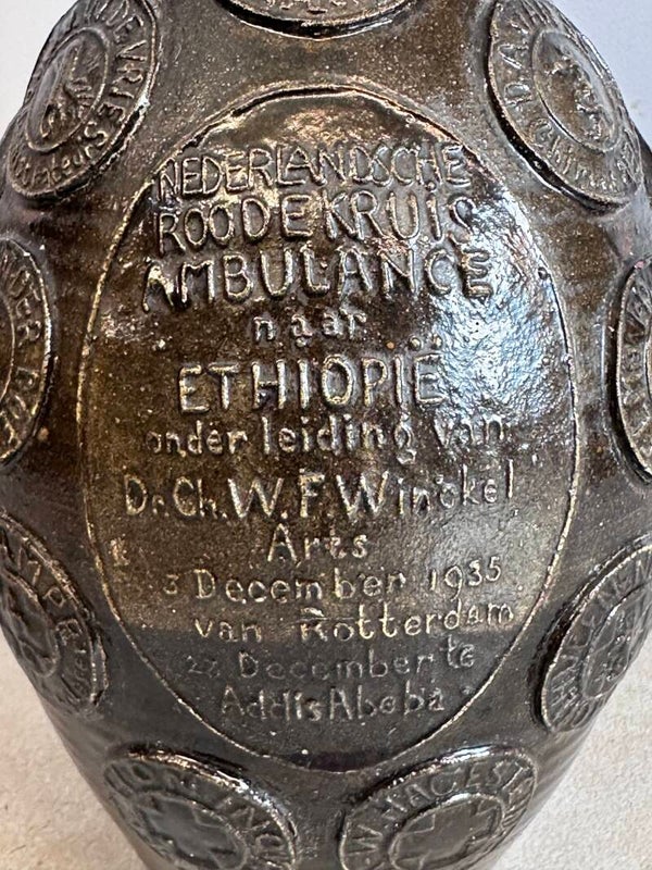 Dark brown jug with one ear. On the belly a medallion with text, two coats of arms with a lion (Netherlands and Ethiopia) and nine 'seals' with professional emblems and text: physician-leader Winckel, administrator de Vries, D.A.H.M. Colaco-Delmont, physician-nurse Lampe, nurse Hagestein, nurse Van den Honing, physician Veenenklaas, physician Van Der Does, surgeon Van Schelven. inscription, in medallion: ‘Netherlands Red Cross Ambulance to Ethiopia under the command of DR. Ch. W. F. Winckel Arts, 3 December: 1935 from Rotterdam 23 December to Addis Abeba.’On October 2, 1935, Italy invaded Ethiopia. The jug was made to commemorate the dispatch of a Dutch Red Cross ambulance to Ethiopia on December 3, 1935.