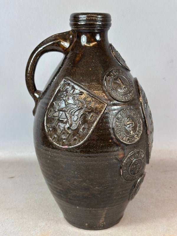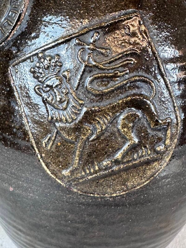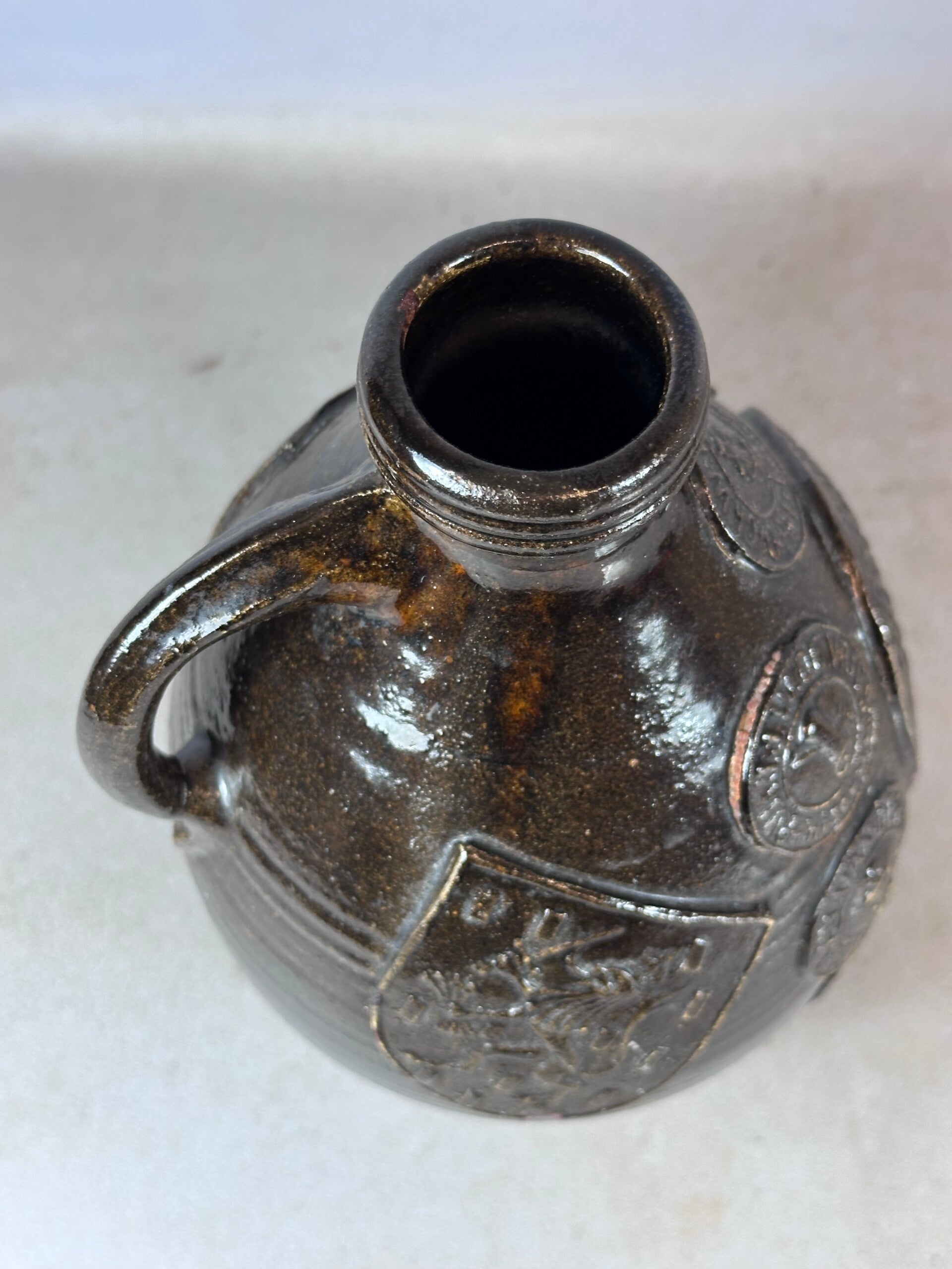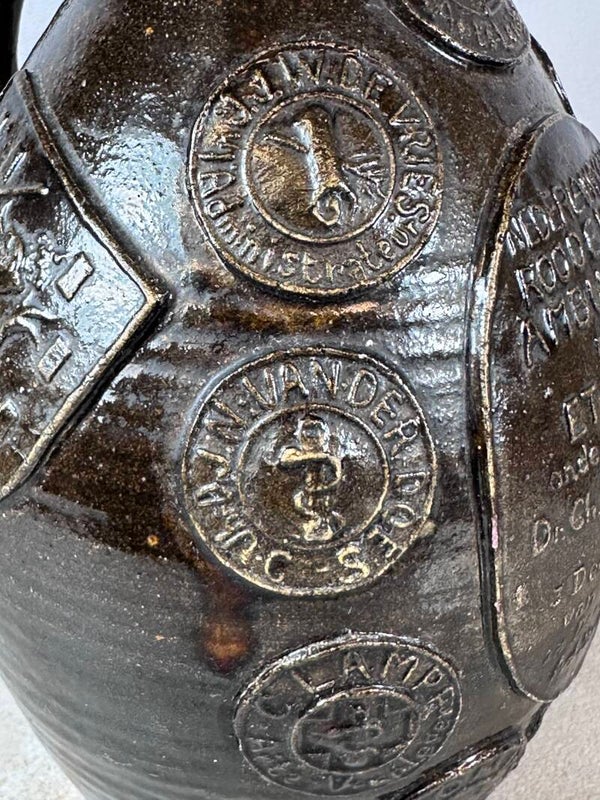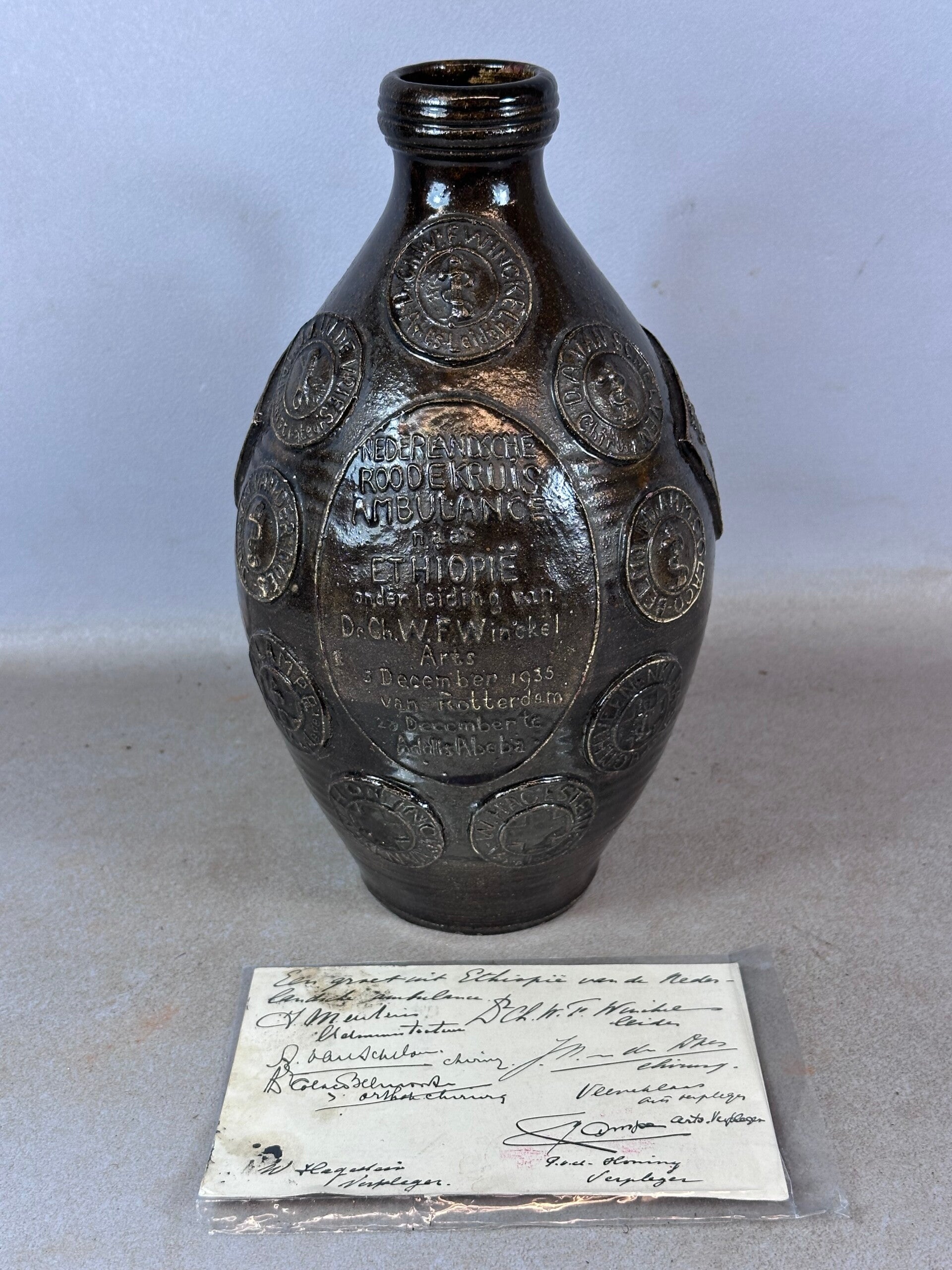Dark brown jug with one ear. On the belly a medallion with text, two coats of arms with a lion (Netherlands and Ethiopia) and nine 'seals' with professional emblems and text: physician-leader Winckel, administrator de Vries, D.A.H.M. Colaco-Delmont, physician-nurse Lampe, nurse Hagestein, nurse Van den Honing, physician Veenenklaas, physician Van Der Does, surgeon Van Schelven. inscription, in medallion: ‘Netherlands Red Cross Ambulance to Ethiopia under the command of DR. Ch. W. F. Winckel Arts, 3 December: 1935 from Rotterdam 23 December to Addis Abeba.’On October 2, 1935, Italy invaded Ethiopia. The jug was made to commemorate the dispatch of a Dutch Red Cross ambulance to Ethiopia on December 3, 1935.