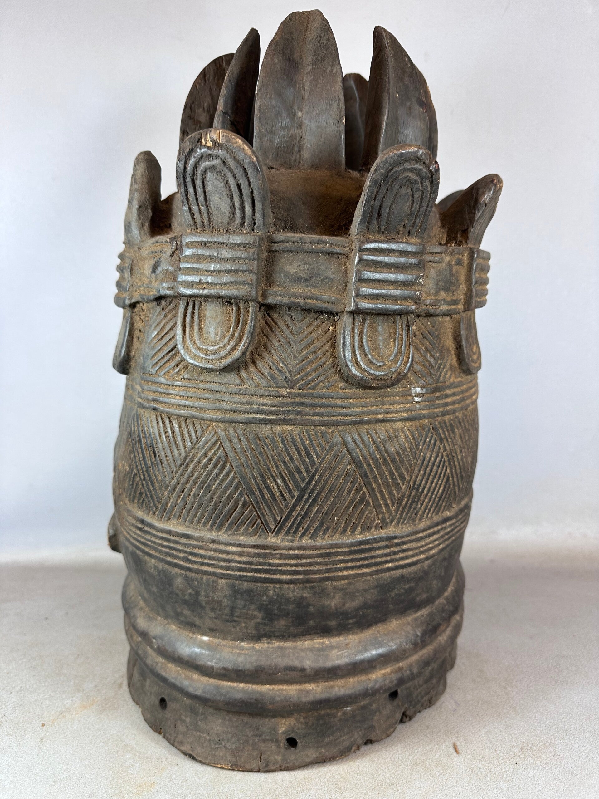 The authority of Sande and its protection of the young girls as they go through their initiations and as they are instructed in the secrets of Sande is known through the masks worn by senior women members and leaders of the local chapter. The masks known as Sowei are embodiments of ideal beauty and the precepts and ideals held by Sande. The care and attention so obvious in this mask given to details of hair, features of the face and the skill of carving the head and side faces attest to the aesthetic dimension so important in Sande and it's masks. Though carved by a male sculptor, the Sowei mask is the only mask danced by women in West Africa. This is a ‘helmet mask' worn over the head with a dark costume attached to the small holes at the bottom of the mask, which completely covers the dancer as she whirls and dances with quick steps showing the spirit and power of Sande. The dramatic carving and the prominent forms of the mask reflect the Mende or Vai artist's ability to give shape to the principles and aesthetic ideals of the women's Sande Society, in this instance.