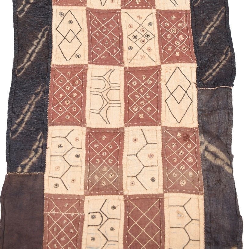Kuba skirts, Tcaka, long are cloths made from raffia, from 8 - 25 feet long, from the Ngeende, Bushoong and Ngongo peoples. They incorporate appliqued "patches", embroidered shapes and patterns, openwork, tie-dye, cowrie shells, barkcloth and border elements. The appliqued "patches" originally repaired holes, then developed into traditional design motifs. .Most are covered with geometric symbols; many are restrained, subtle and rhythmic designs using one technique; others create amazing quilt-like assemblages of old pieces of many forms. The full skirts, worn by men and women, are bunched up and wrapped around many times.
