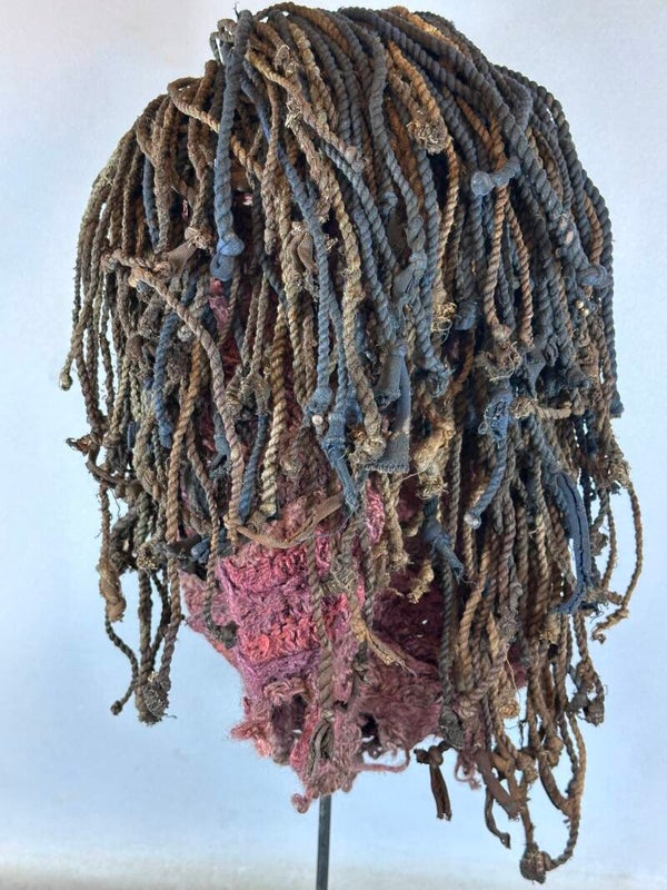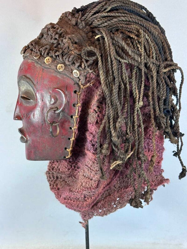 The face is brown in color with a smooth surface. The mouth is slightly open. On both ears are jewelry made of copper wire. The hair is made of cords, the net is made of textile fibers.This mask comes from the Chokwe people. It belongs to the famous category known as Mwana pwo and was performed during the ceremonies of circumcision and initiation of young boys. The headdress attached to the mask is well preserved. The face shows typical Chokwe carving patterns and expression.