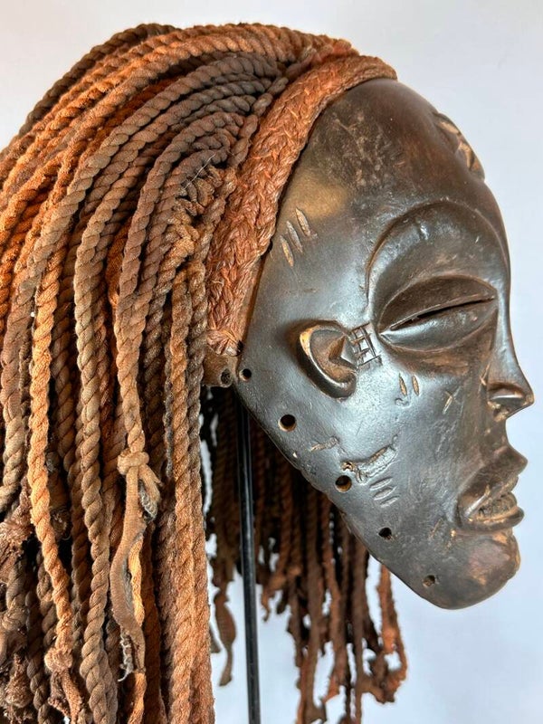 The face is brown in color with a smooth surface. The mouth is slightly open. On both ears are jewelry made of copper wire. The hair is made of cords, the net is made of textile fibers.This mask comes from the Chokwe people. It belongs to the famous category known as Mwana pwo and was performed during the ceremonies of circumcision and initiation of young boys. The headdress attached to the mask is well preserved. The face shows typical Chokwe carving patterns and expression.