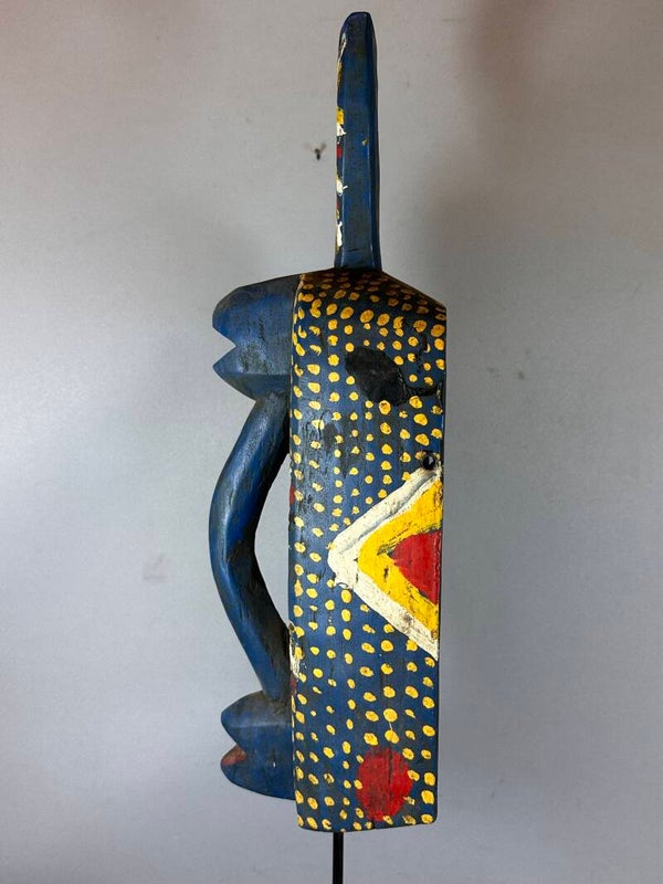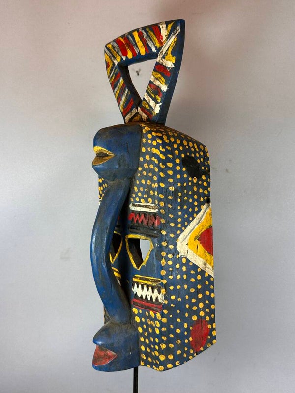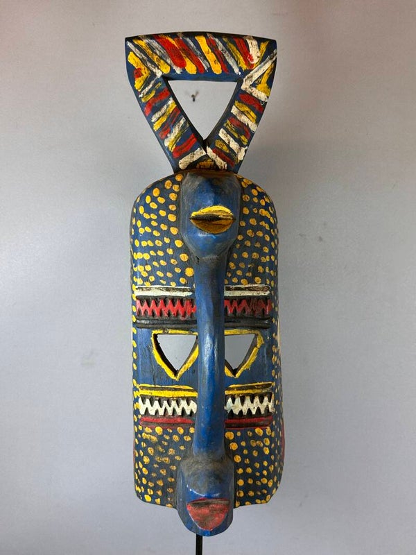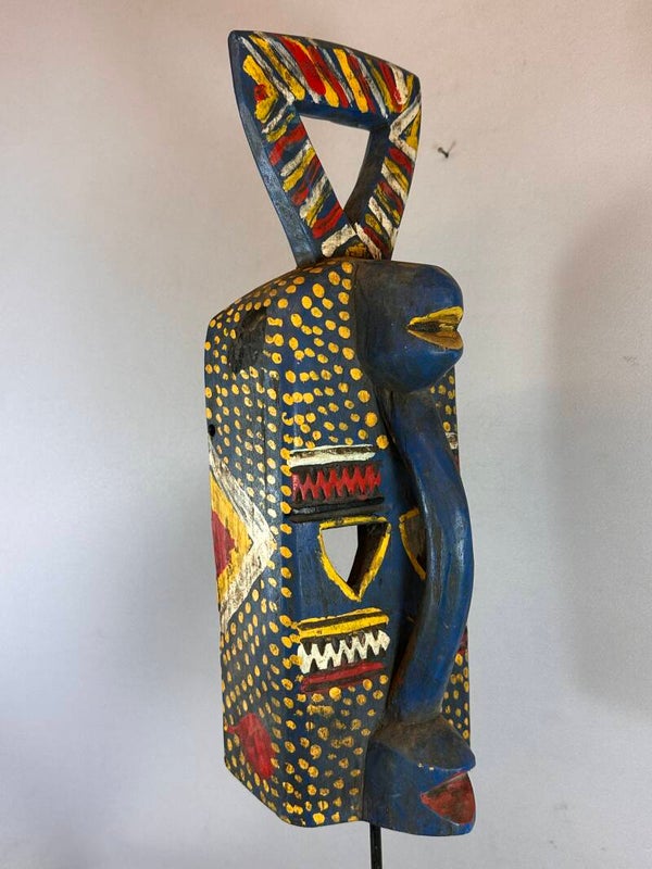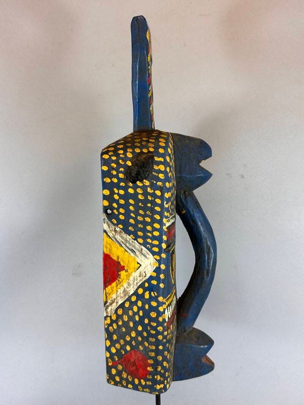 The Dogon are known for their elaborate funeral rituals with extensive use of masks. To say that they are one of the world's most fascinating cultures is an understatement. The more we learn, the more remarkable they seem. Their art is outstanding, as their masks and other objects reflect a purity of style rarely encountered in modern Africa. The oral tradition of the Dogon tells us that they originated on the west bank of the Niger River about 1000 years ago. They moved west at some point, into parts of what is now Mossi territory in Burkina Faso, but chose to return east due to pressure to assimilate into the Mossi Kingdom. This time, around 1500, they found a place almost unreachable by invaders on horseback--the arid but imposing Bandiagara Cliffs. Here most of the Dogon have remained to this day, scattered over about 150 miles, as one of Africa's most spiritual people. Dogon family dwellings, as well as their shrines and granaries, are constructed in a uniquely haunting way, leaving even the most jaded observer spellbound, in what can only be described as a magic kingdom. The Dogon have also taken the time-honored worship of ancestors to new heights, and their huge pantheon of astounding and colorful masks reflect this. It is possible today for tourists and scholars to arrange masked dances for public view, but these dances are for entertainment only, and only a few of the mask-forms are actually revealed. Ritually meaningful dances are not shared with the public.