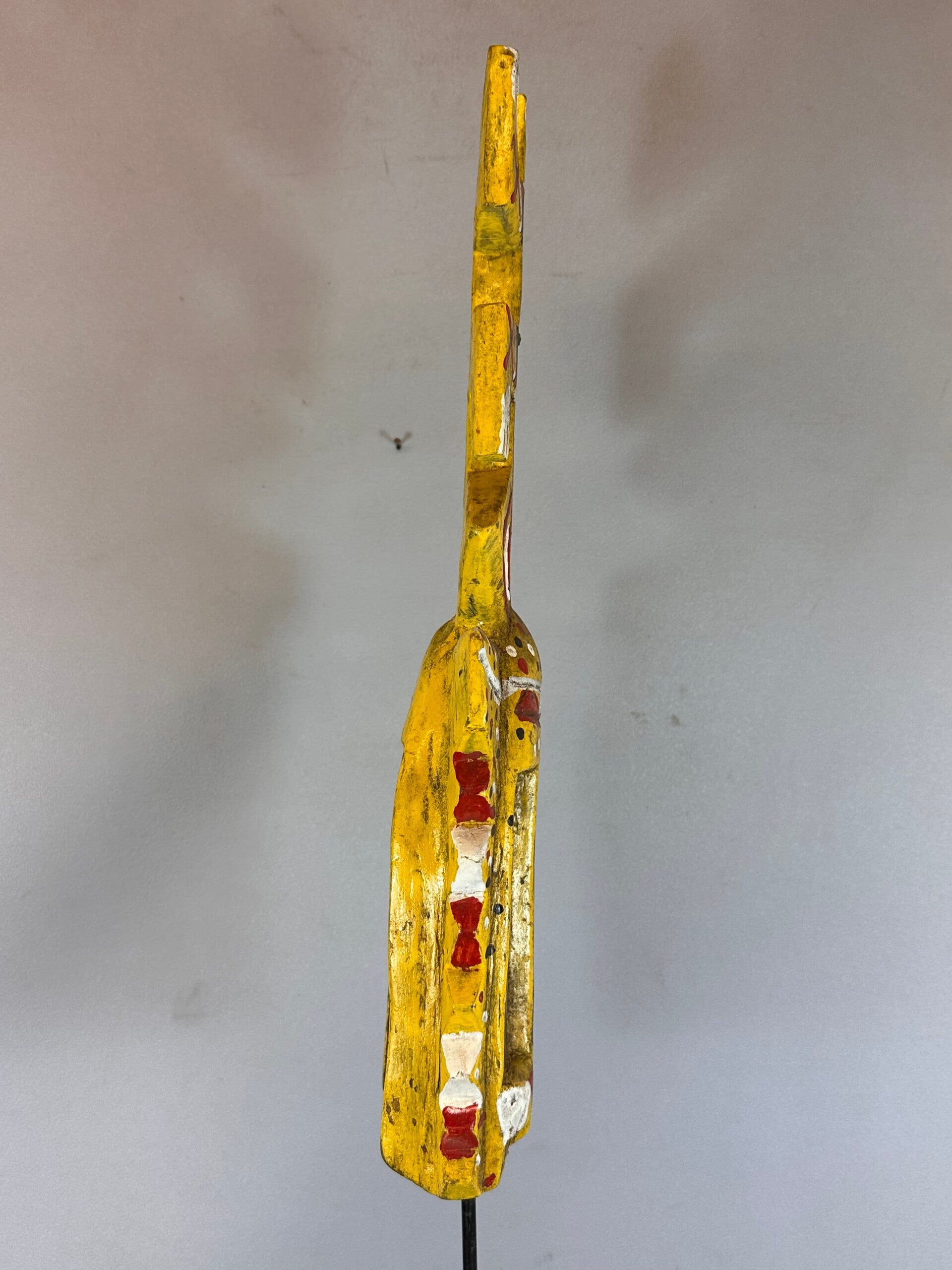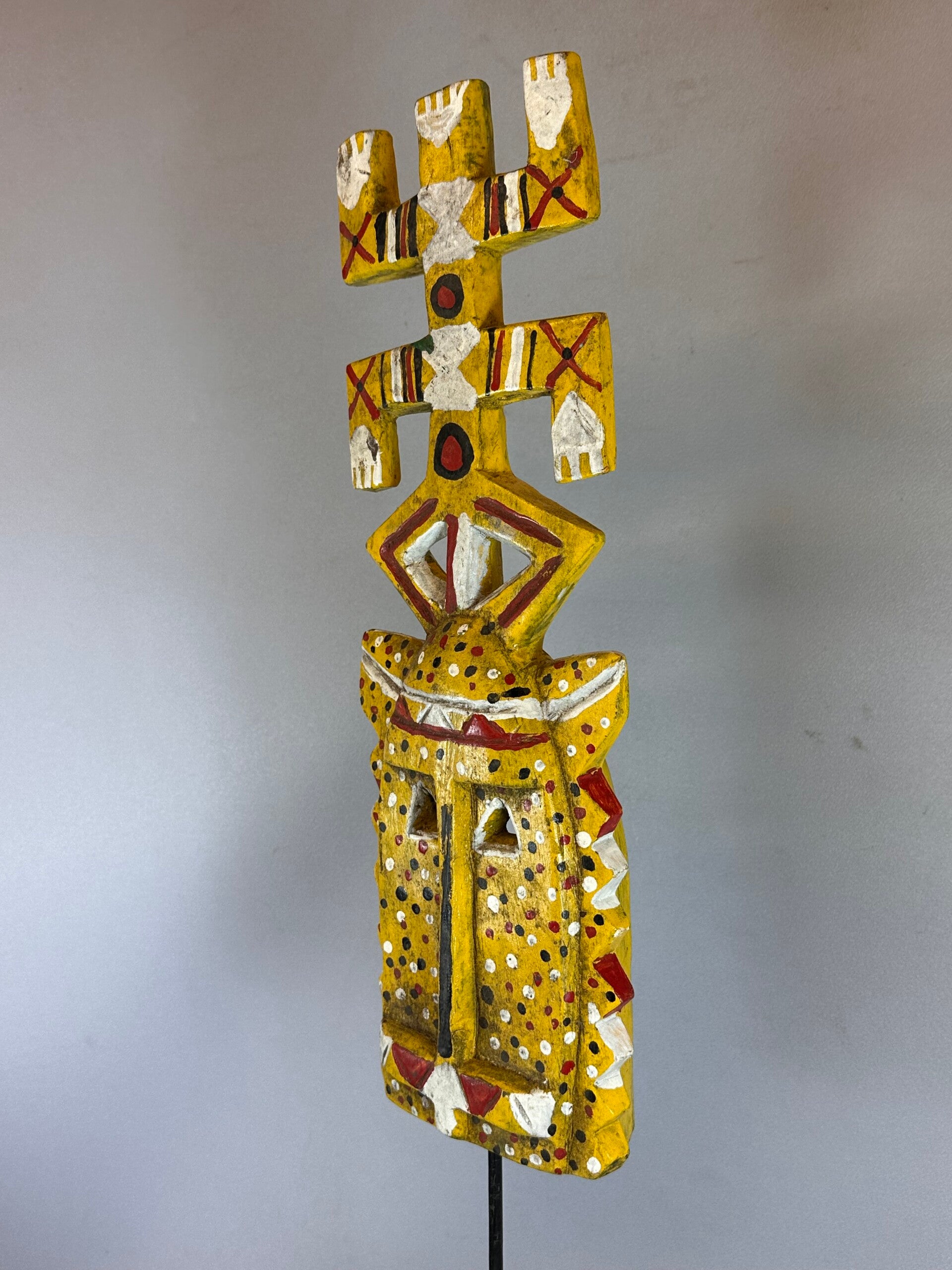 The Dogon are known for their elaborate funeral rituals with extensive use of masks. To say that they are one of the world's most fascinating cultures is an understatement. The more we learn, the more remarkable they seem. Their art is outstanding, as their masks and other objects reflect a purity of style rarely encountered in modern Africa. The oral tradition of the Dogon tells us that they originated on the west bank of the Niger River about 1000 years ago. They moved west at some point, into parts of what is now Mossi territory in Burkina Faso, but chose to return east due to pressure to assimilate into the Mossi Kingdom. This time, around 1500, they found a place almost unreachable by invaders on horseback--the arid but imposing Bandiagara Cliffs. Here most of the Dogon have remained to this day, scattered over about 150 miles, as one of Africa's most spiritual people. Dogon family dwellings, as well as their shrines and granaries, are constructed in a uniquely haunting way, leaving even the most jaded observer spellbound, in what can only be described as a magic kingdom. The Dogon have also taken the time-honored worship of ancestors to new heights, and their huge pantheon of astounding and colorful masks reflect this. It is possible today for tourists and scholars to arrange masked dances for public view, but these dances are for entertainment only, and only a few of the mask-forms are actually revealed. Ritually meaningful dances are not shared with the public.