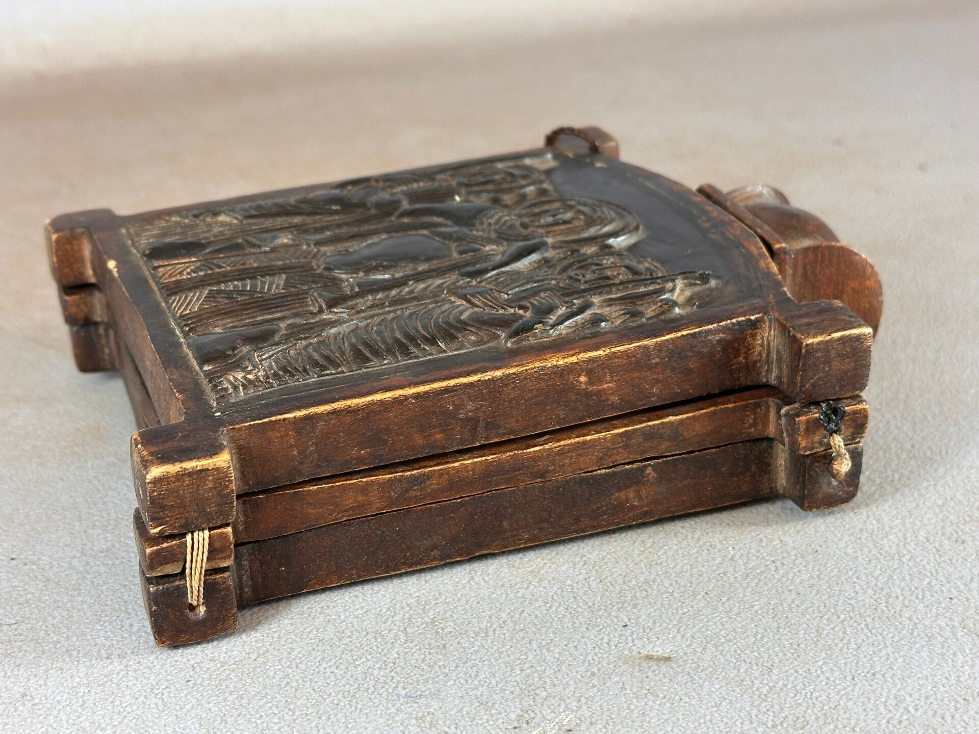 These icons are made of wood and painted panels, of stone, or a combination of both. They are used on personal altars or worn as a personal talisman for protection on a cord around the neck or tucked into a pocket. They are usually a collaboration between two types of artisans: the carver who makes the wood or stone case and a painter who draws upon a repertoire of biblical themes.