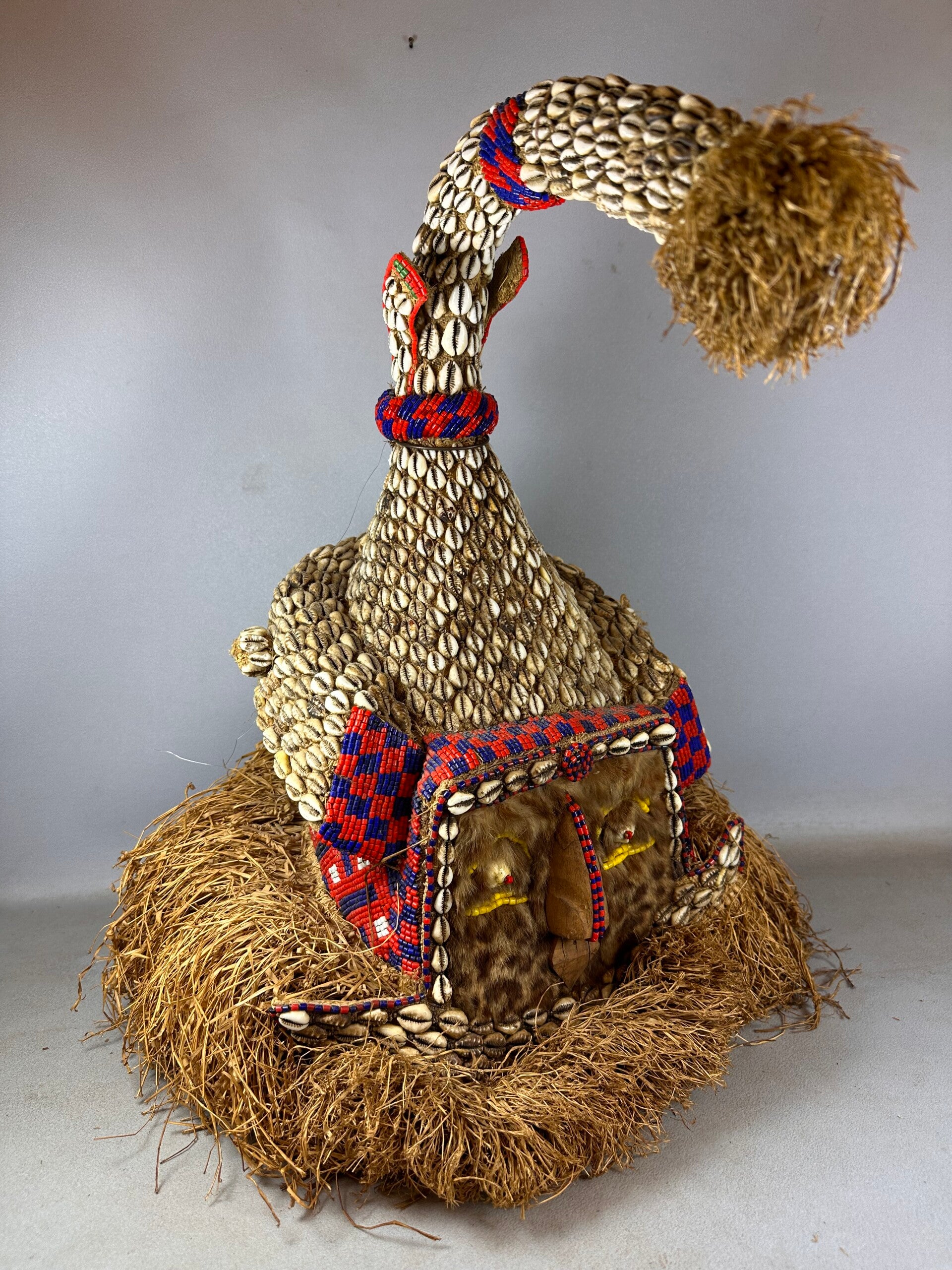 The foremost among the three most significant masks of the Kuba Kingdom, this Moshambwooy mask embodies Woot, often regarded as the "first ancestor," akin to Adam in symbolism. Legend holds that Woot and his brother competed for the affection of their sister, Ngaady aMwaash, who ultimately wed Woot. Adorned with a prominent horn resembling a bent elephant tusk, the mask is aptly dubbed the Elephant mask. Its embellishments include cowrie shells, beads, wooden ears and nose, cowrie shell eyes, beaded eyebrows, and a grand raffia ruff, with the face veiled in raffia.