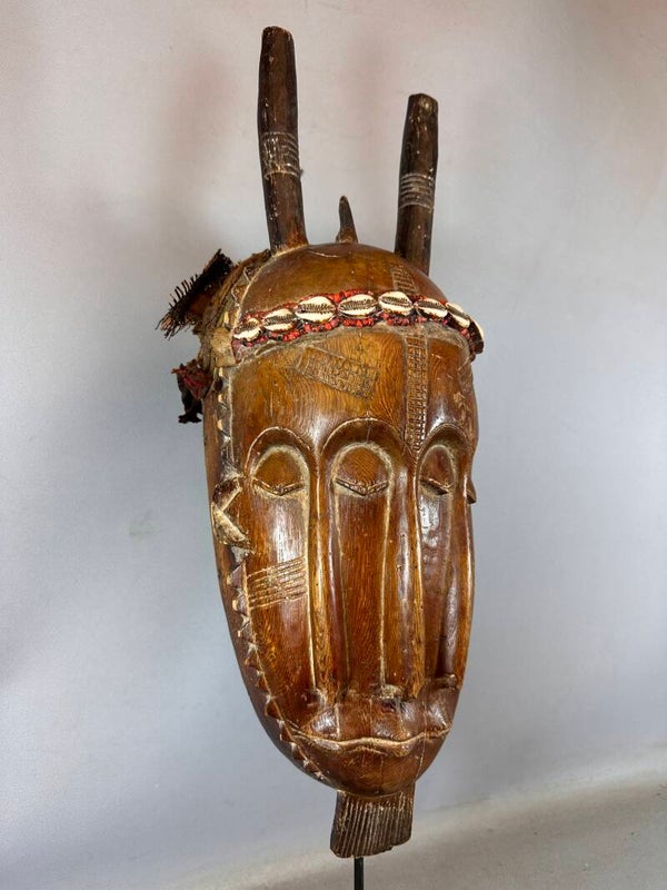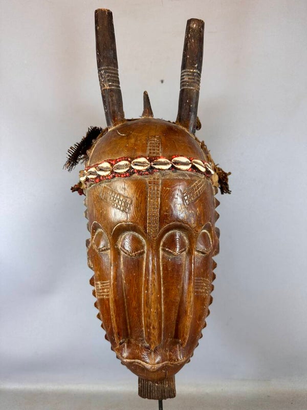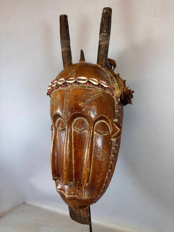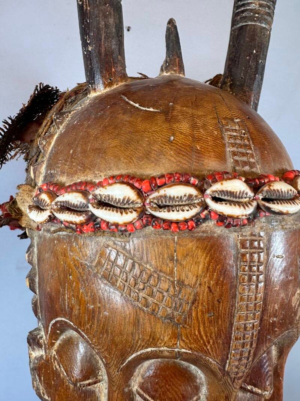 Very well preserved wooden ceremonial mask of the Yauré. Tribe from the center of Ivory Coast. Beautiful patina, finished with cowrie shells and vegetable fibers. With certificate of origin. Belgian private collection of