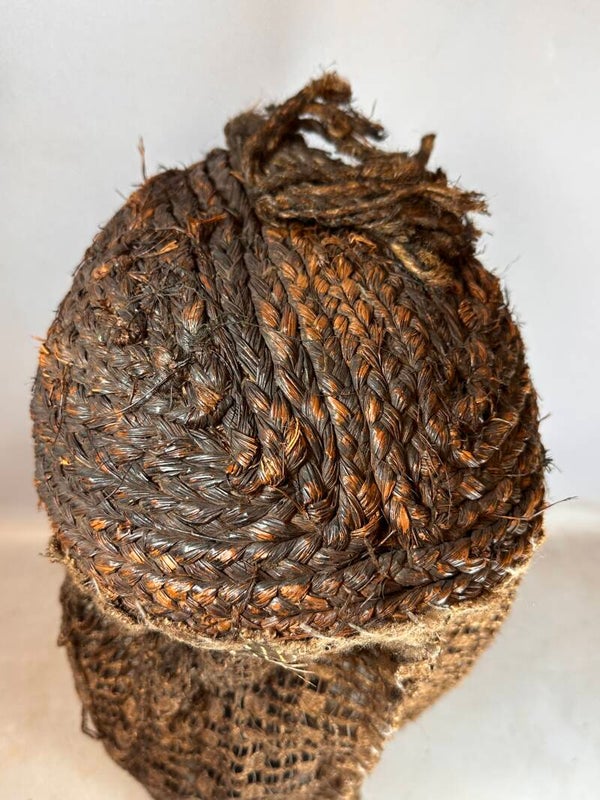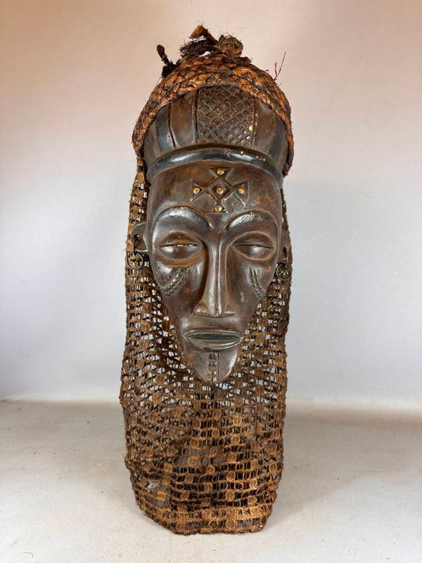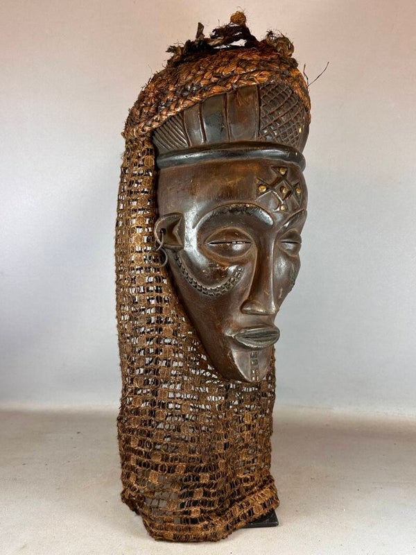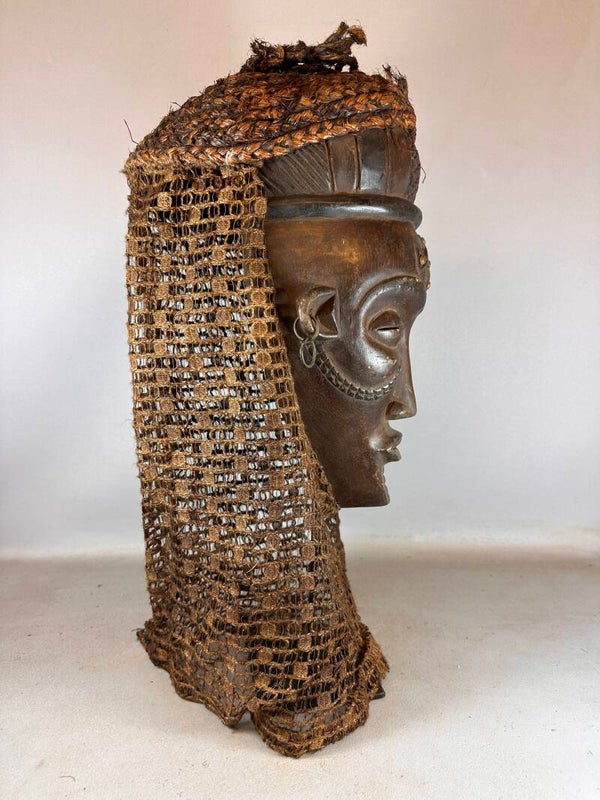 The face is brown in color with a smooth surface. The mouth is slightly open. On both ears are jewelry made of copper wire. The hair is made of cords, the net is made of textile fibers.This mask comes from the Chokwe people. It belongs to the famous category known as Mwana pwo and was performed during the ceremonies of circumcision and initiation of young boys. The headdress attached to the mask is well preserved. The face shows typical Chokwe carving patterns and expression.