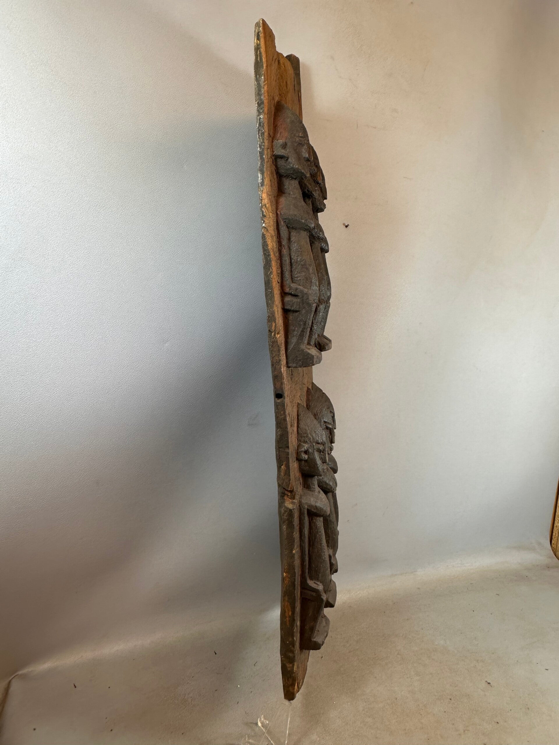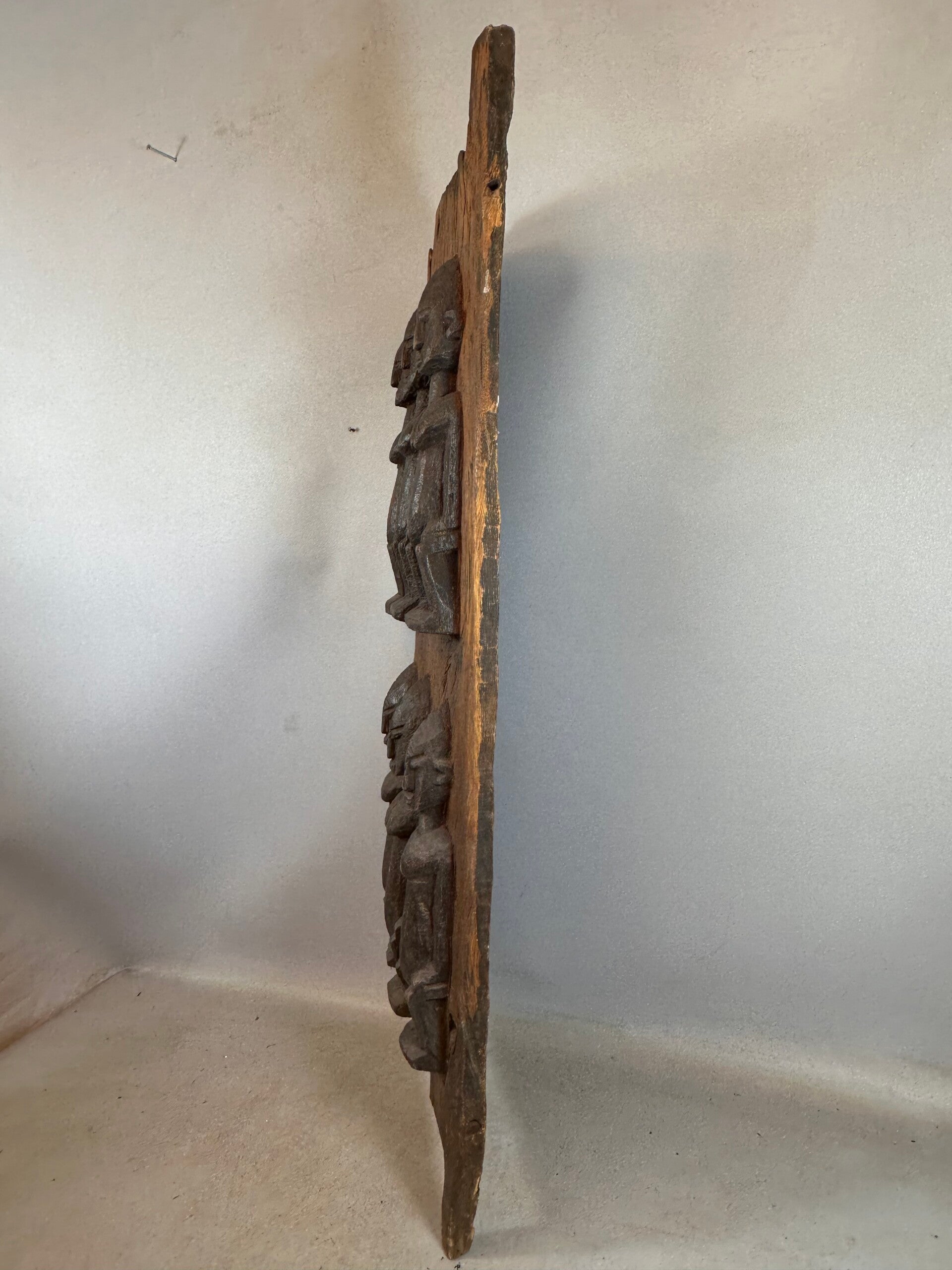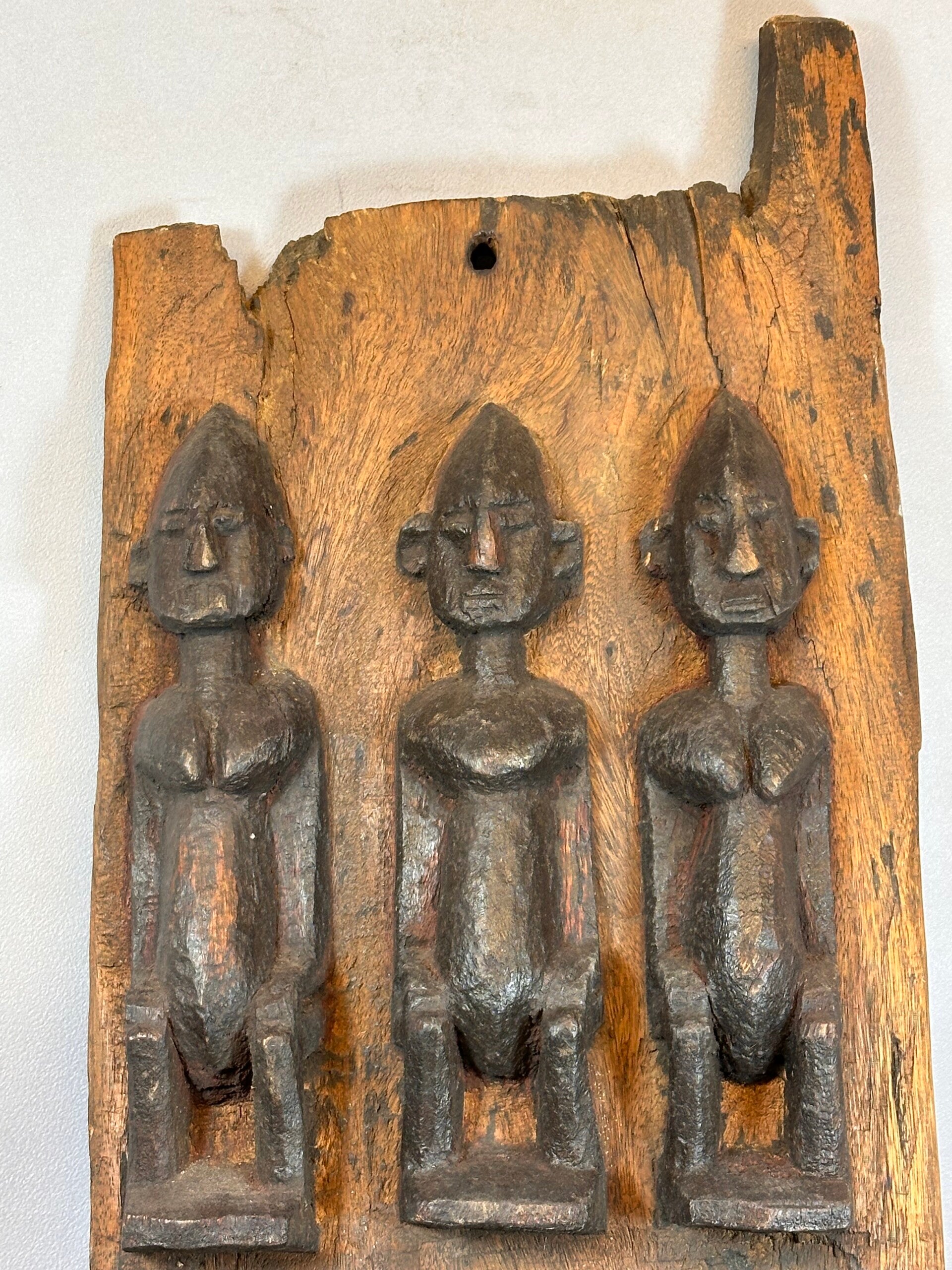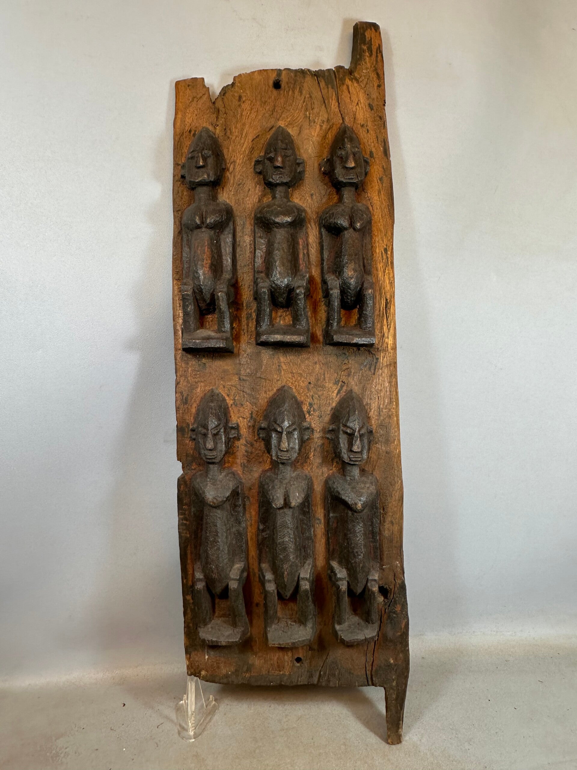 Beautiful wooden shutter of the Dogon from Mali. On the shutter are carved in high relief 6 male and female ancestor figures. The relief figures have a dark brown glossy patina and the rest of the object has a less dark brown patina, with visible traces of use.