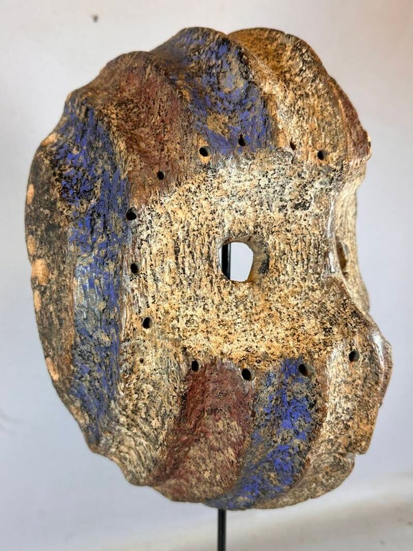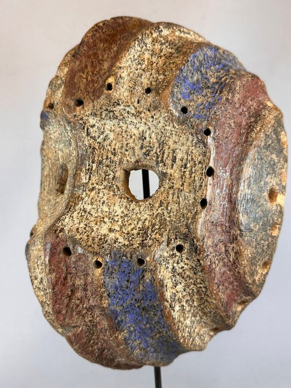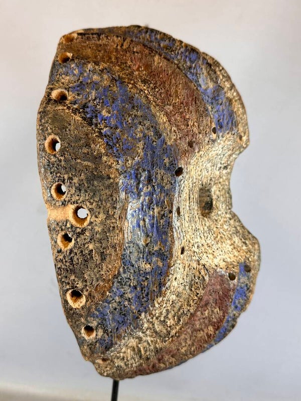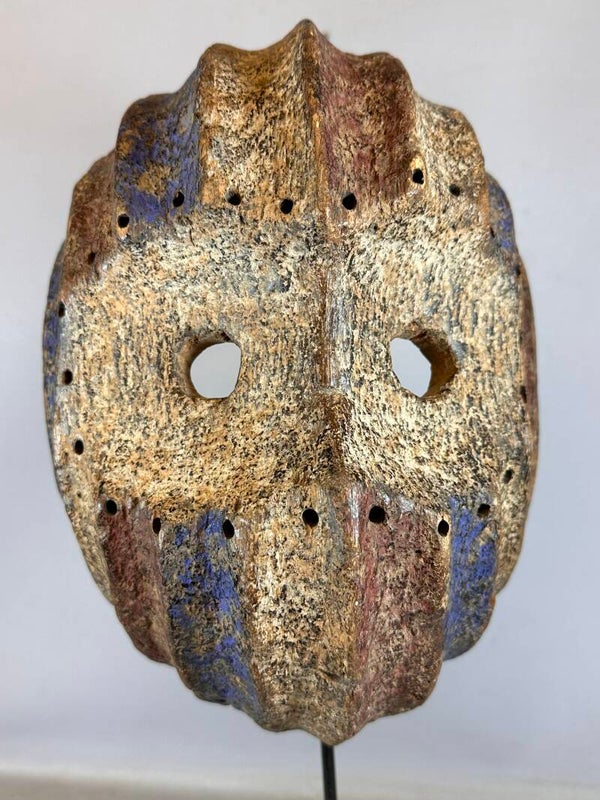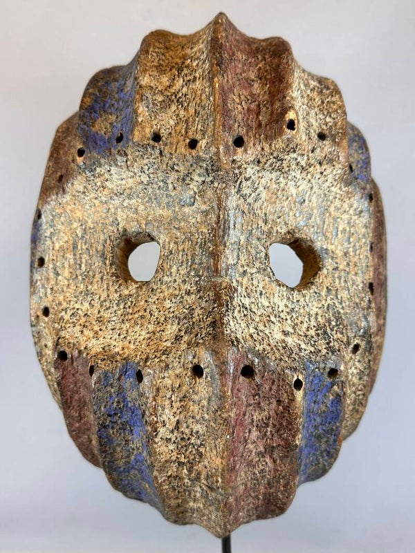 This almost flat African mask stands out for its naive appearance. Of Mbole or Yela origin, two close African ethnic groups in the DR Congo, there are oblique streaks under the eyes. These highly stylized traditional masks intervened during initiation rituals of which little is known because they took place away from the village, in secrecy.