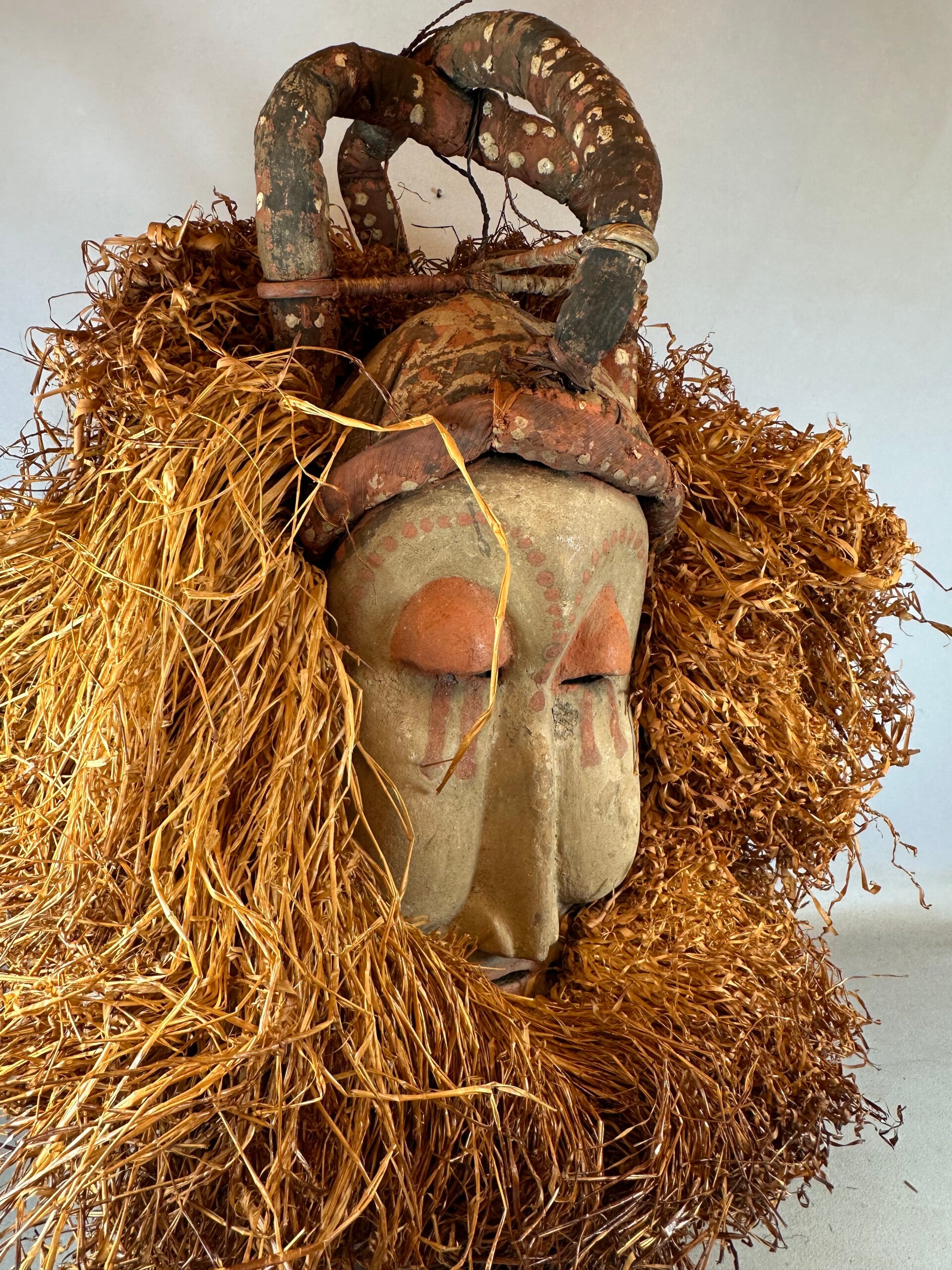 This extraordinary mask was used by Yaka and Suku peoples of south-western Congo in the end of the first half of the 20th century. Both cultures share an institution called mukanda, which is concerned with the circumcision and initiation of young men. Kakungu, the 'red giant', played an important role during this male initiation. The Yaka and Suku consider kakungu as their oldest and most powerful mask.