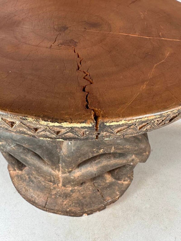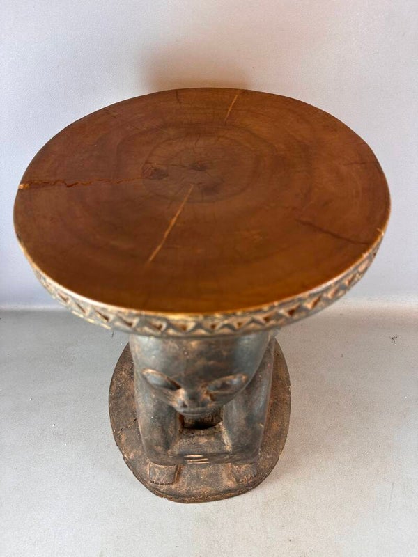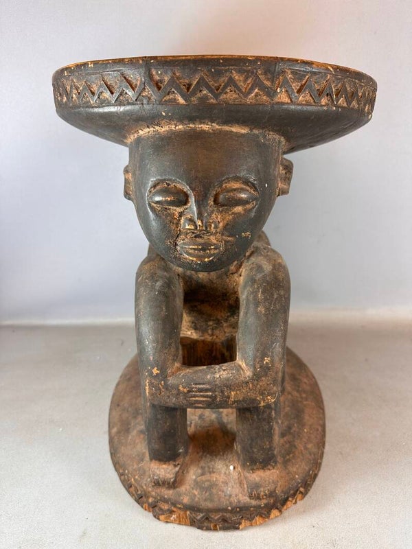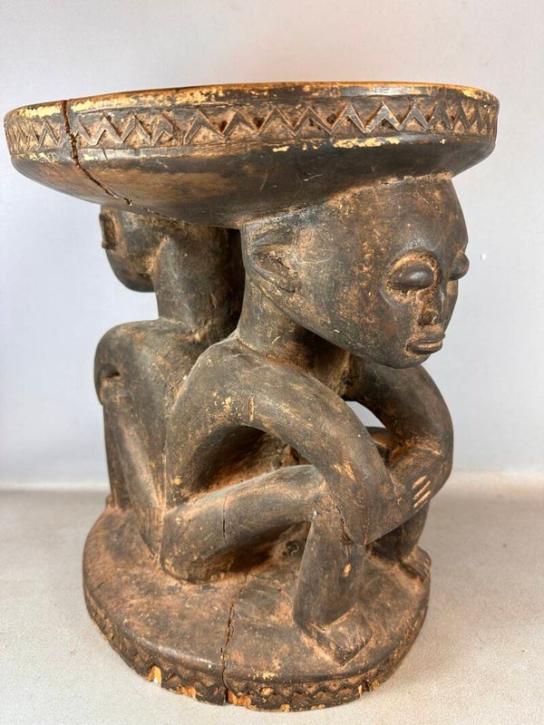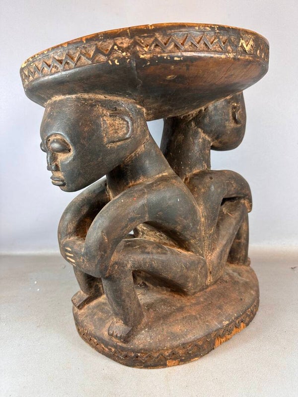 A traditional stool, intricately carved from wood with two people supporting the seat.