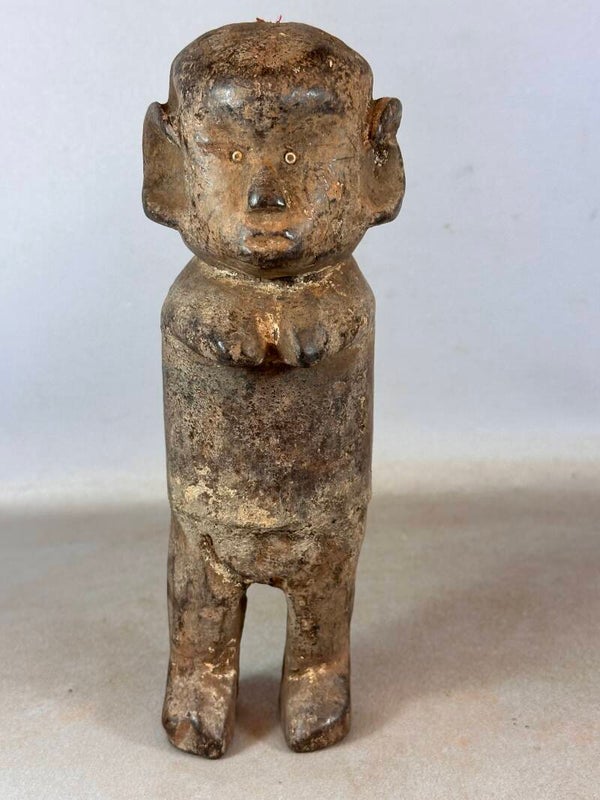 Nyamezi carvers are also famous for their figures which are usually carved out from a dark, heavy wood with a shiny surface. They tend to have elongated features with the statue’s face divided into two planes and the eyes inset with circular white beads. Such elongated figures with distorted limbs were used in water divination ceremonies. The same dark wood from which they carve their statues is used by the Nyamezi to produce masks with elongated features and domed foreheads. Small objects for everyday and magical use – combs, horns or calabashes – also feature in the work of Nyamezi carvers.”