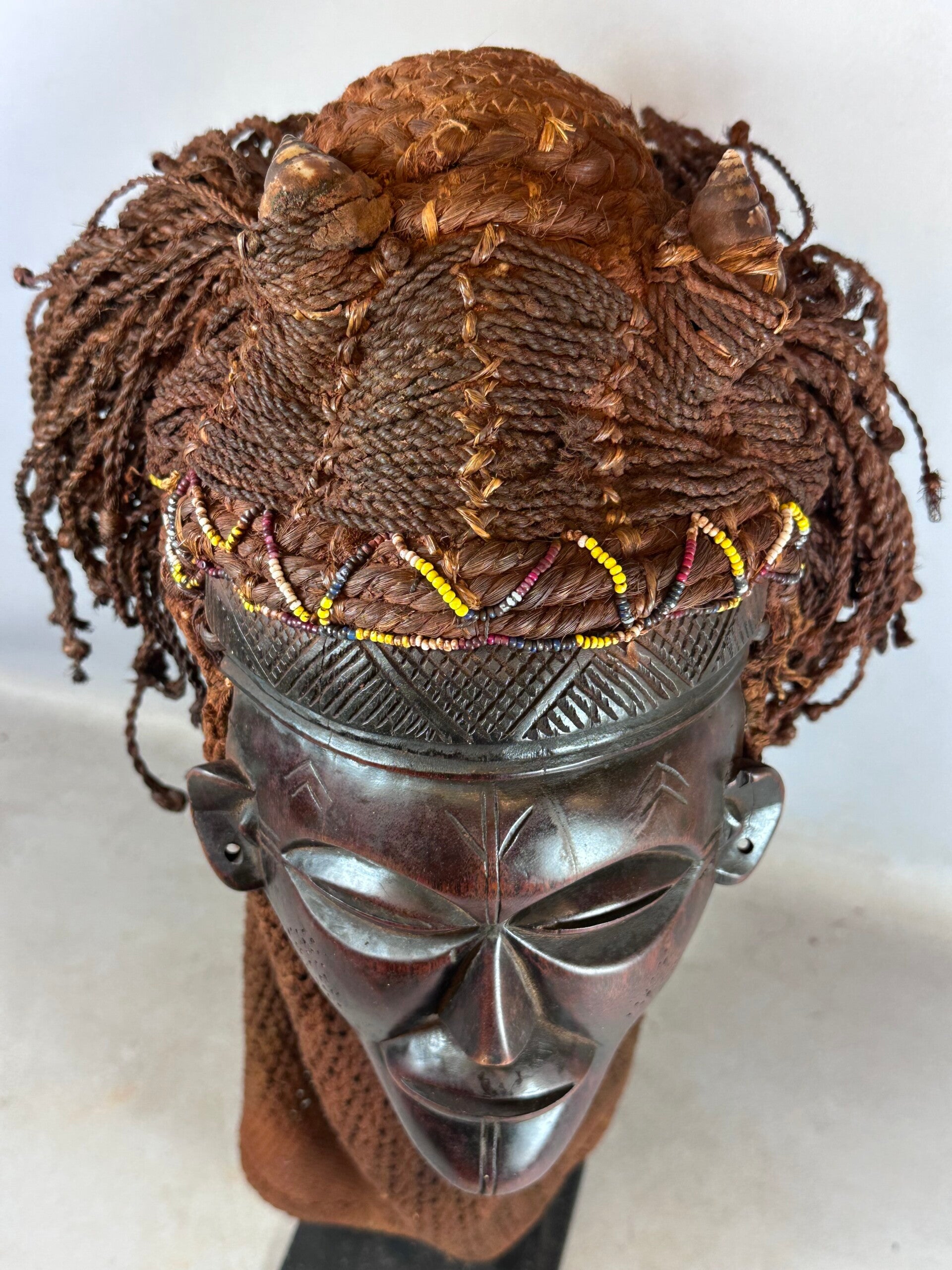 The face is brown in color with a smooth surface. The mouth is slightly open. On both ears are jewelry made of copper wire. The hair is made of cords, the net is made of textile fibers.This mask comes from the Chokwe people. It belongs to the famous category known as Mwana pwo and was performed during the ceremonies of circumcision and initiation of young boys. The headdress attached to the mask is well preserved. The face shows typical Chokwe carving patterns and expression.