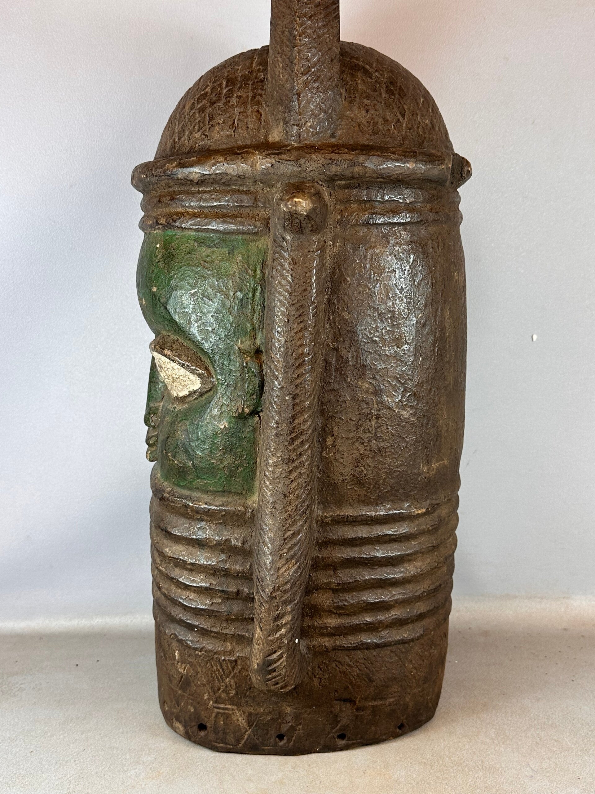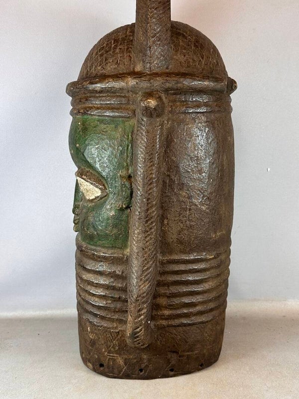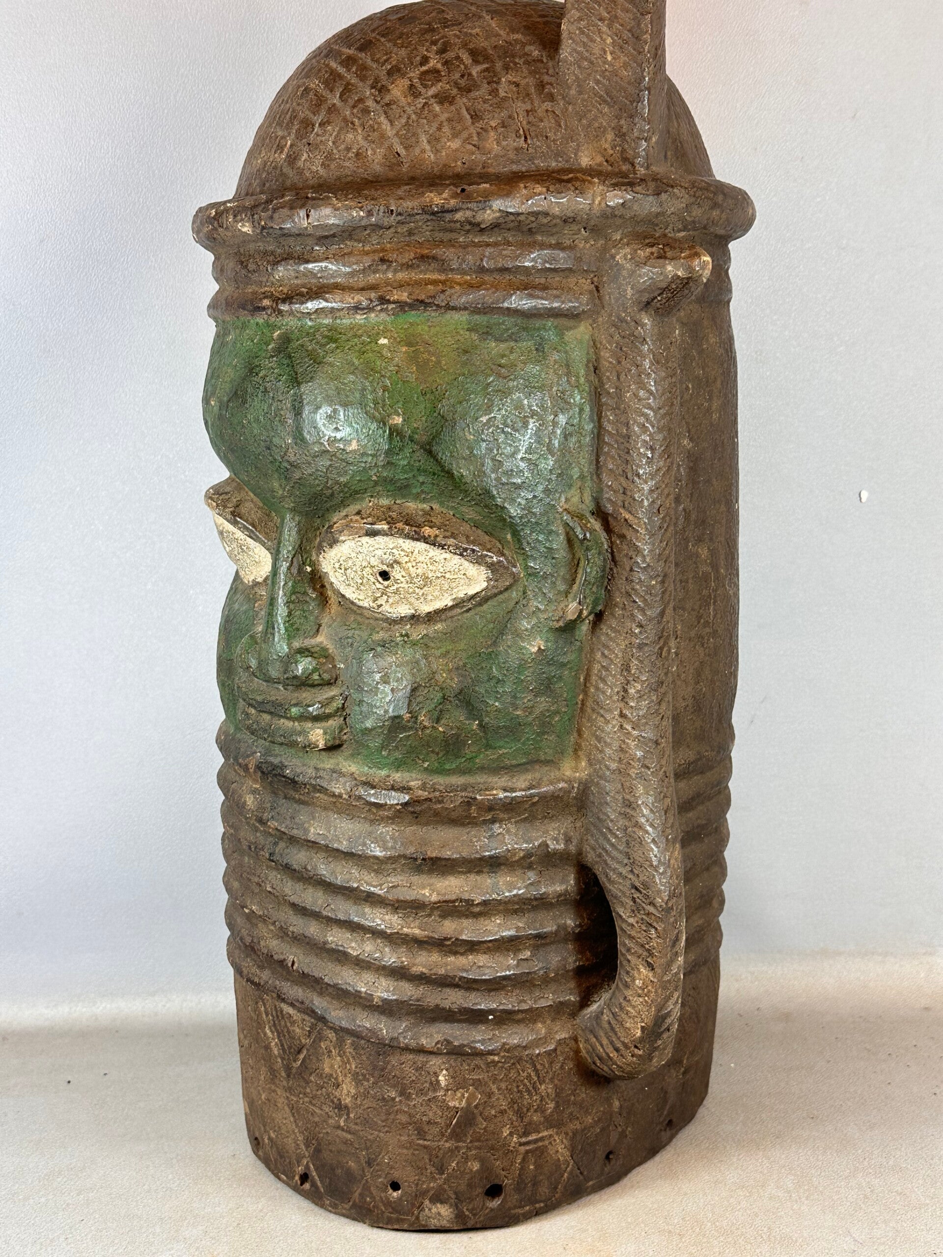 This striking green rare wooden head represents an Oba, one of the hereditary God-Kings of the Benin Empire. It also shows features associated with Iyobas - queen mothers - this statue possesses the features that are unmistakably male. The hair is in fact a diamond pattern running up to a set-up rim with 2 bands of pointed ears with white wide open eyes each with a small round opening. The nose has wide nostrils and pressed lips that are horizontally lined.