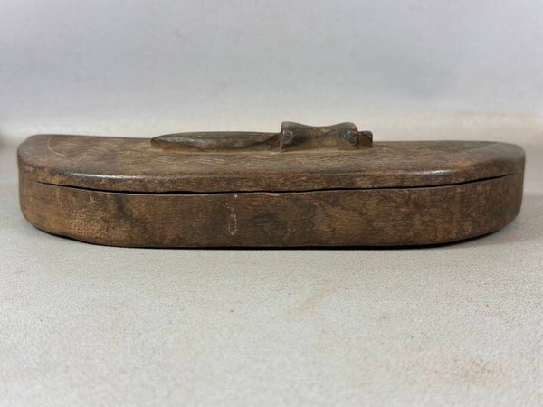 This is a beautiful incised carved wood half moon shaped lidded Tukula Powder Box carved by the Kuba people of the Congo. Tukula is a red powder that is finely ground from parts of the Camwood tree. To the Kuba it is an immensely valuable substance, the Western equivalent of gold. Tukula is both auspicious and prophylactic. Its earthy or purplish red color is used abundantly in decoration, rubbed onto items such as cups, containers, figures, weapons, oracles etc. to honor and beautify them. Tukula is also used to bless people like new born babies, pregnant women, new mothers, warriors, the diseased and the deceased. It's usually applied after having been mixed in a special wooden or clay dish with oil extracted from palm-kernels. Tukula will be preserved in special decorated wooden boxes that come in many shapes, sizes and designs. Each Box is uniquely carved by the family. This particular Tuluka box is intricately carved and shaped.
